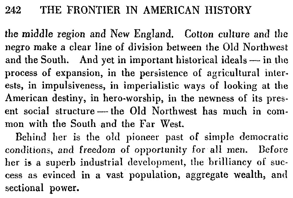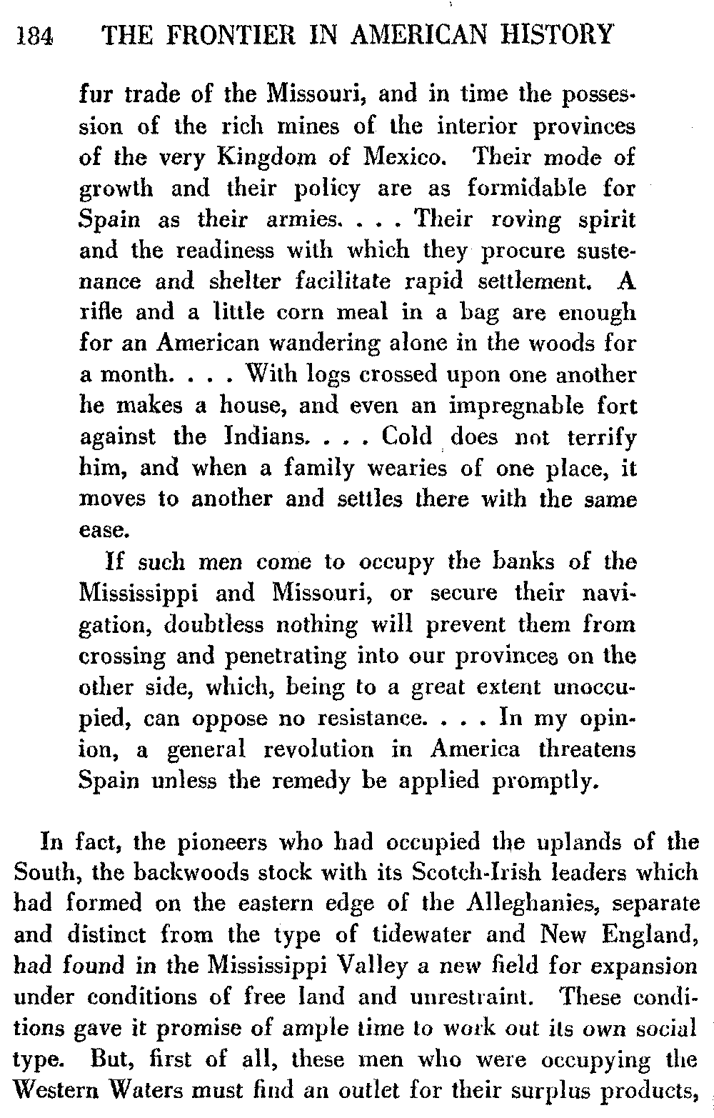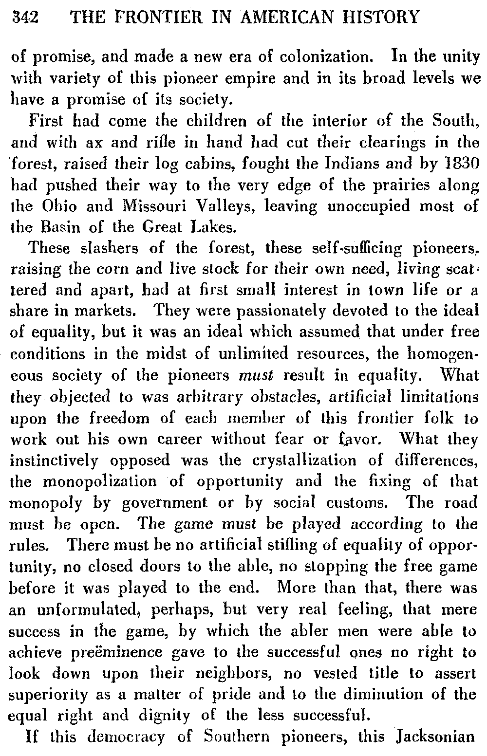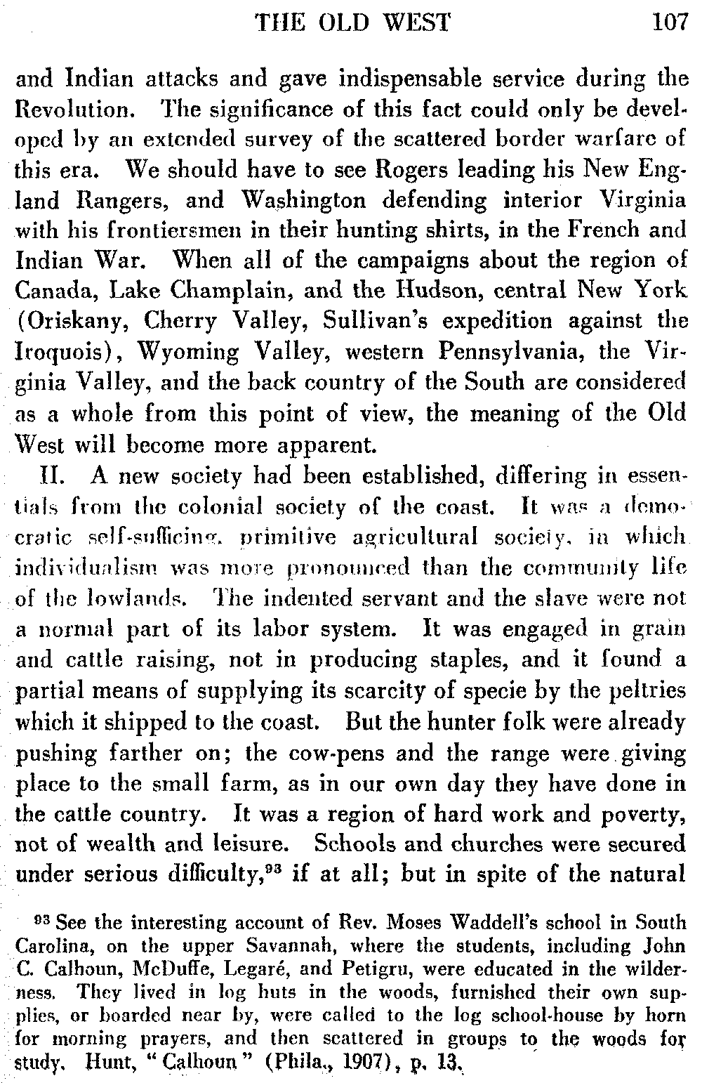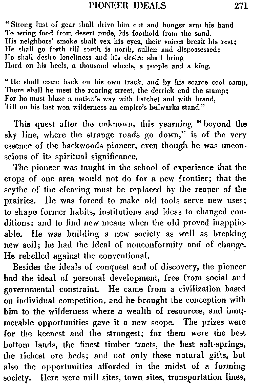 Behind institutions, behind constitutional forms and modifications, lie the vital forces that call these organs into life and shape them to meet changing conditions. The peculiarity of American institutions is, the fact that they have been compelled to adapt themselves to the changes of an expanding people—to the changes involved in crossing a continent, in winning a wilderness, and in developing at each area of this progress out of the primitive economic and political conditions of the frontier into the complexity of city life. Said Calhoun in 1817, "We are great, and rapidly—I was about to say fearfully—growing!"[2:1] So saying, he touched the distinguishing feature of American life. All peoples show development; the germ theory of politics has been sufficiently emphasized. In the case of most nations, however, the development has occurred in a limited area; and if the nation has expanded, it has met other growing peoples whom it has conquered. But in the case of the United States we have a different phenomenon. Limiting our attention to the Atlantic coast, we have the familiar phenomenon of the evolution of institutions in a limited area, such as the rise of representative government; the differentiation of simple colonial governments into complex organs; the progress from primitive industrial society, without division of labor, up to manufacturing civilization. But we have in addition to this a recurrence of the process of evolution in each western area reached in the process of expansion. Thus American development has exhibited not merely advance along a single line, but a return to primitive conditions on a continually advancing frontier line, and a new development for that area. American social development has been continually beginning over again on the frontier. This perennial rebirth, this fluidity of American life, this expansion westward with its new opportunities, its continuous touch with [3]the simplicity of primitive society, furnish the forces dominating American character. The true point of view in the history of this nation is not the Atlantic coast, it is the Great West. Even the slavery struggle, which is made so exclusive an object of attention by writers like Professor von Holst, occupies its important place in American history because of its relation to westward expansion.