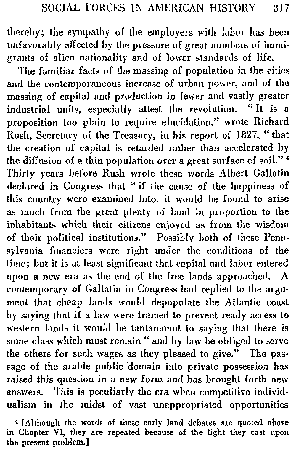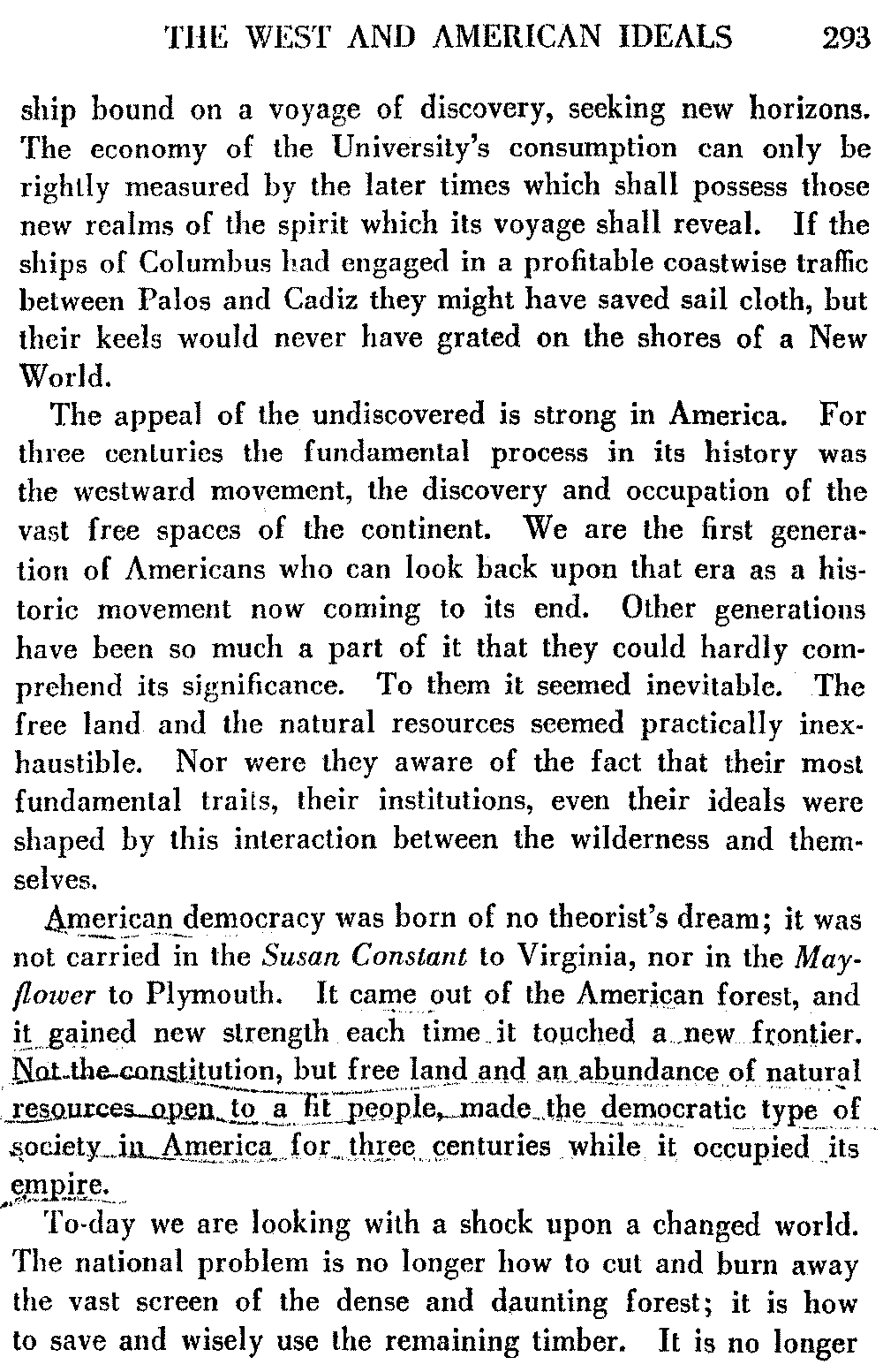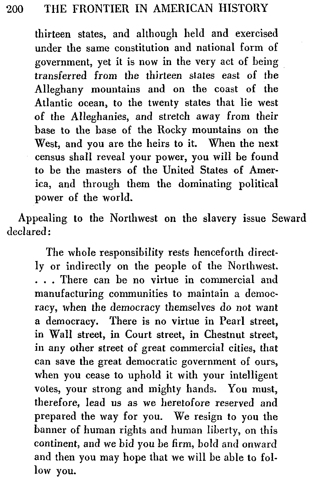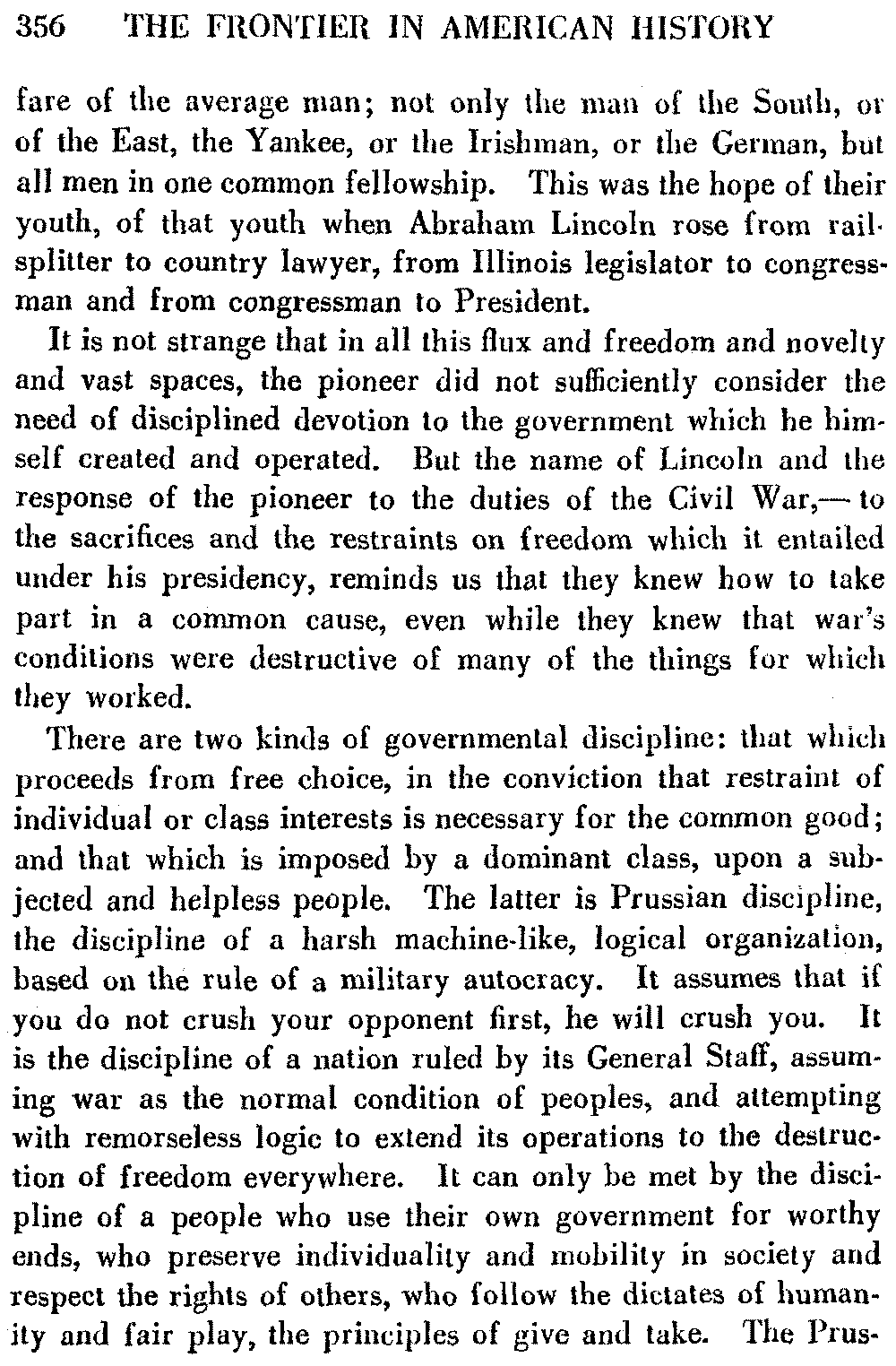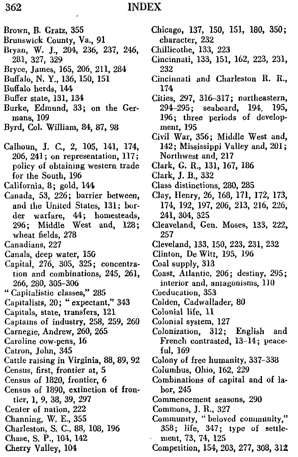 Behind institutions, behind constitutional forms and modifications, lie the vital forces that call these organs into life and shape them to meet changing conditions. The peculiarity of American institutions is, the fact that they have been compelled to adapt themselves to the changes of an expanding people—to the changes involved in crossing a continent, in winning a wilderness, and in developing at each area of this progress out of the primitive economic and political conditions of the frontier into the complexity of city life. Said Calhoun in 1817, "We are great, and rapidly—I was about to say fearfully—growing!"[2:1] So saying, he touched the distinguishing feature of American life. All peoples show development; the germ theory of politics has been sufficiently emphasized. In the case of most nations, however, the development has occurred in a limited area; and if the nation has expanded, it has met other growing peoples whom it has conquered. But in the case of the United States we have a different phenomenon. Limiting our attention to the Atlantic coast, we have the familiar phenomenon of the evolution of institutions in a limited area, such as the rise of representative government; the differentiation of simple colonial governments into complex organs; the progress from primitive industrial society, without division of labor, up to manufacturing civilization. But we have in addition to this a recurrence of the process of evolution in each western area reached in the process of expansion. Thus American development has exhibited not merely advance along a single line, but a return to primitive conditions on a continually advancing frontier line, and a new development for that area. American social development has been continually beginning over again on the frontier. This perennial rebirth, this fluidity of American life, this expansion westward with its new opportunities, its continuous touch with [3]the simplicity of primitive society, furnish the forces dominating American character. The true point of view in the history of this nation is not the Atlantic coast, it is the Great West. Even the slavery struggle, which is made so exclusive an object of attention by writers like Professor von Holst, occupies its important place in American history because of its relation to westward expansion.