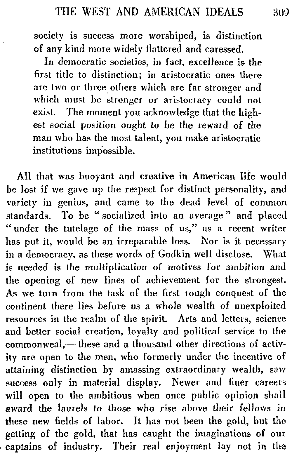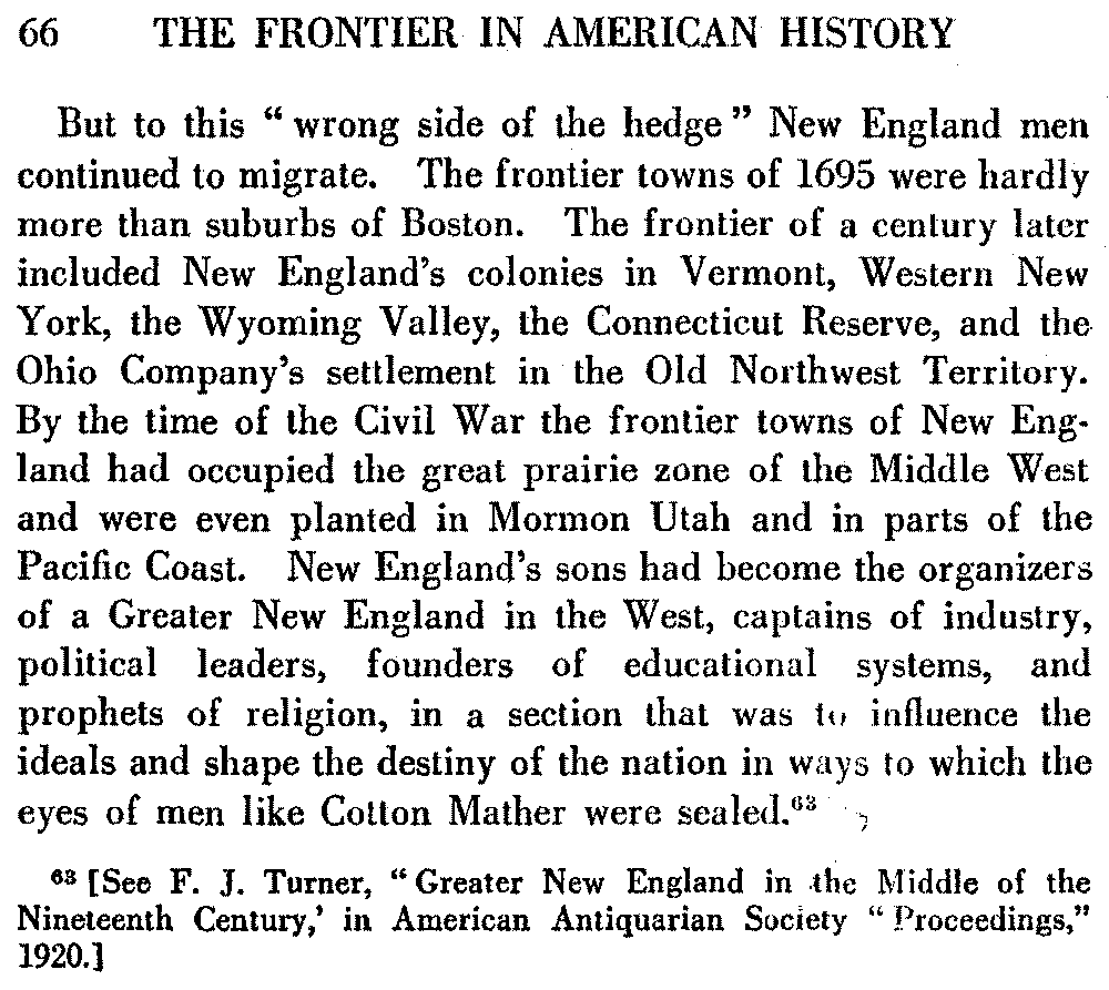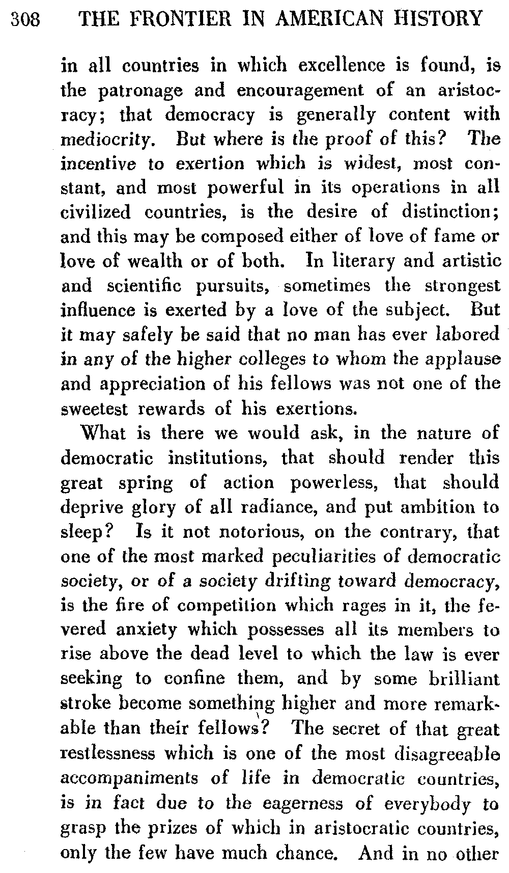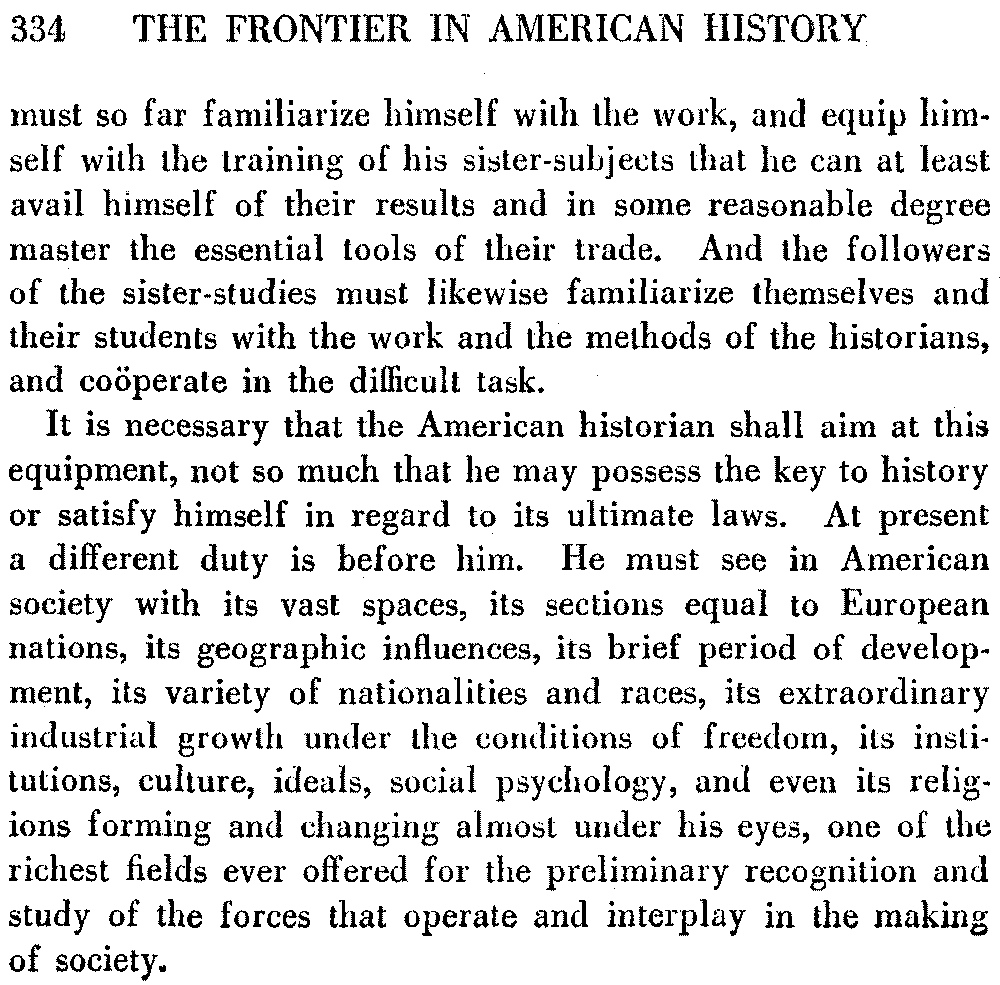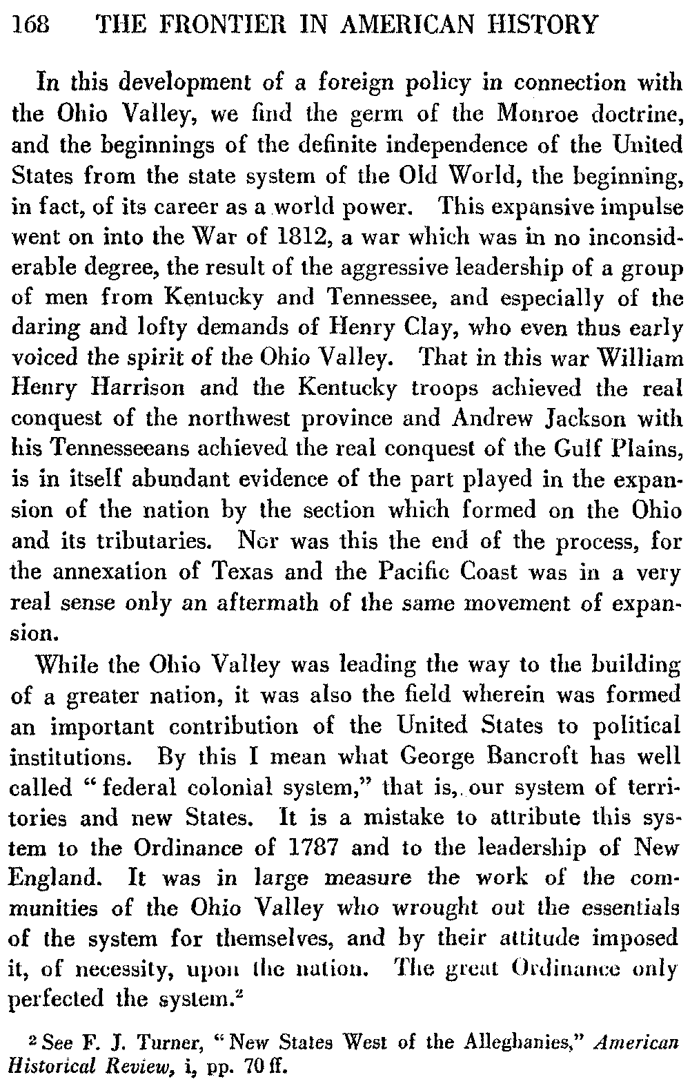 Behind institutions, behind constitutional forms and modifications, lie the vital forces that call these organs into life and shape them to meet changing conditions. The peculiarity of American institutions is, the fact that they have been compelled to adapt themselves to the changes of an expanding people—to the changes involved in crossing a continent, in winning a wilderness, and in developing at each area of this progress out of the primitive economic and political conditions of the frontier into the complexity of city life. Said Calhoun in 1817, "We are great, and rapidly—I was about to say fearfully—growing!"[2:1] So saying, he touched the distinguishing feature of American life. All peoples show development; the germ theory of politics has been sufficiently emphasized. In the case of most nations, however, the development has occurred in a limited area; and if the nation has expanded, it has met other growing peoples whom it has conquered. But in the case of the United States we have a different phenomenon. Limiting our attention to the Atlantic coast, we have the familiar phenomenon of the evolution of institutions in a limited area, such as the rise of representative government; the differentiation of simple colonial governments into complex organs; the progress from primitive industrial society, without division of labor, up to manufacturing civilization. But we have in addition to this a recurrence of the process of evolution in each western area reached in the process of expansion. Thus American development has exhibited not merely advance along a single line, but a return to primitive conditions on a continually advancing frontier line, and a new development for that area. American social development has been continually beginning over again on the frontier. This perennial rebirth, this fluidity of American life, this expansion westward with its new opportunities, its continuous touch with [3]the simplicity of primitive society, furnish the forces dominating American character. The true point of view in the history of this nation is not the Atlantic coast, it is the Great West. Even the slavery struggle, which is made so exclusive an object of attention by writers like Professor von Holst, occupies its important place in American history because of its relation to westward expansion.