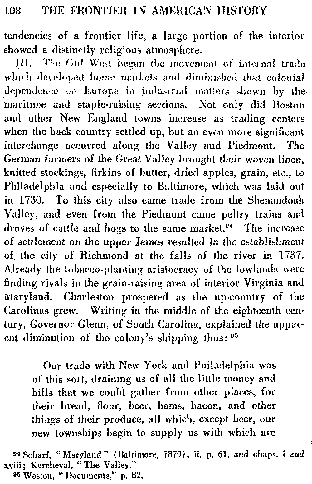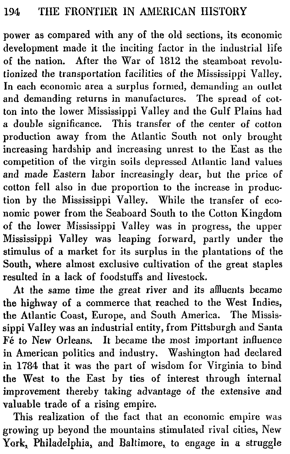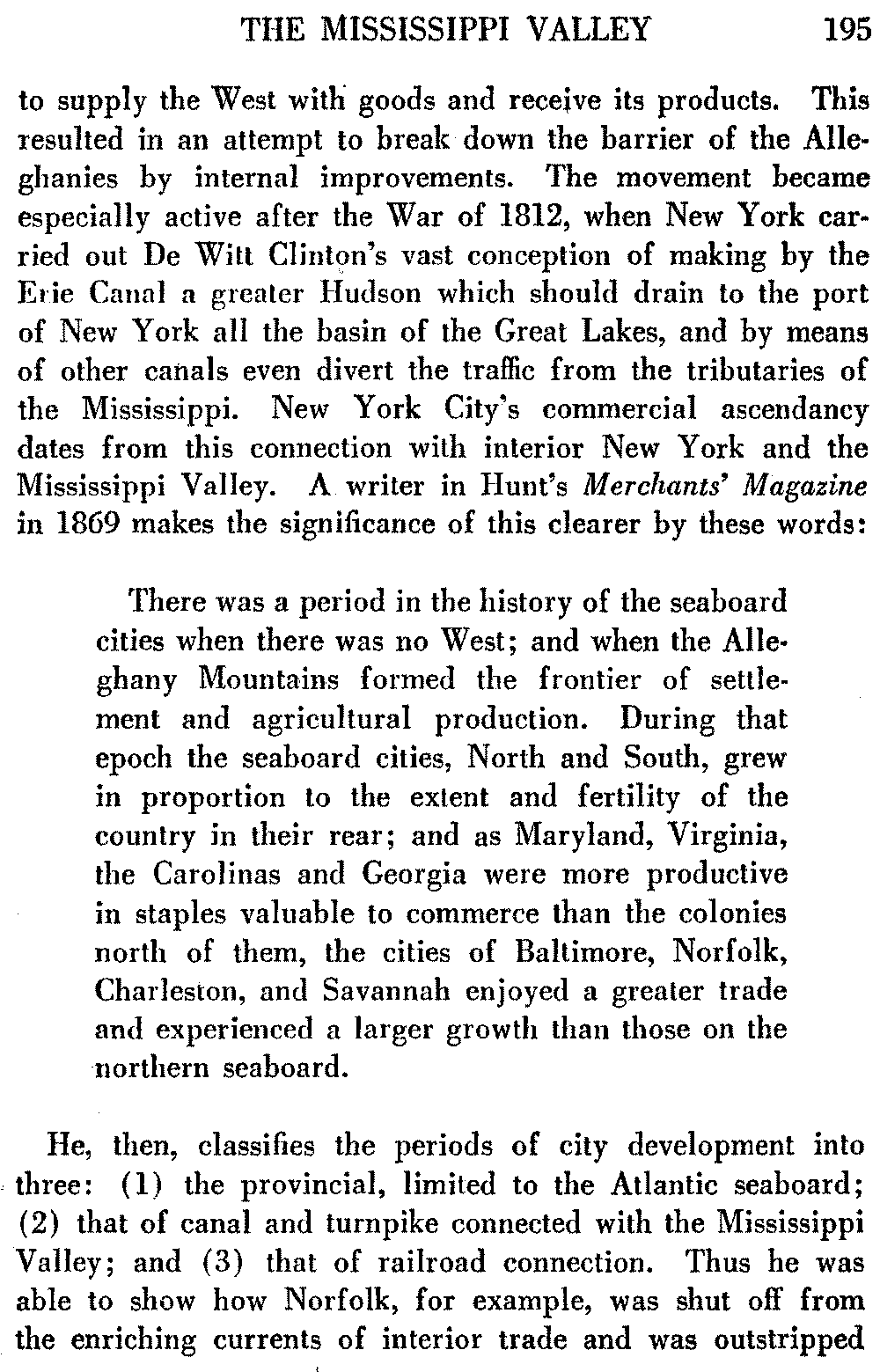 Before long the frontier created a demand for merchants. As it retreated from the coast it became less and less possible for England to bring her supplies directly to the consumer's wharfs, and carry away staple crops, and staple crops began to give way to diversified agriculture for a time. The effect of this phase of the frontier action upon the northern section is perceived when we realize how the advance of the frontier aroused seaboard cities like Boston, New York, and Baltimore, to engage in rivalry for what Washington called "the extensive and valuable trade of a rising empire."