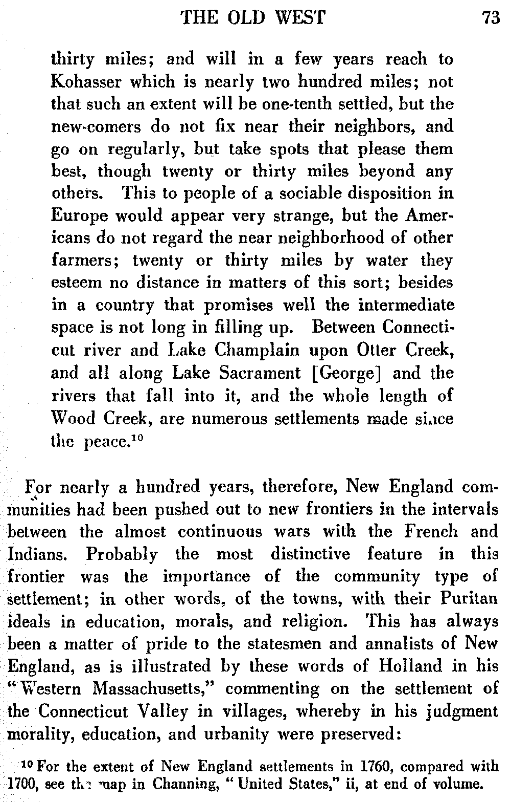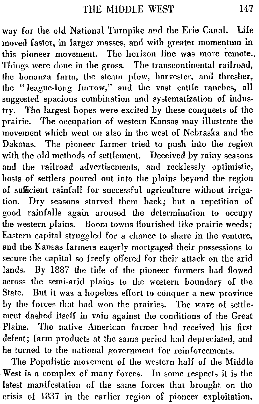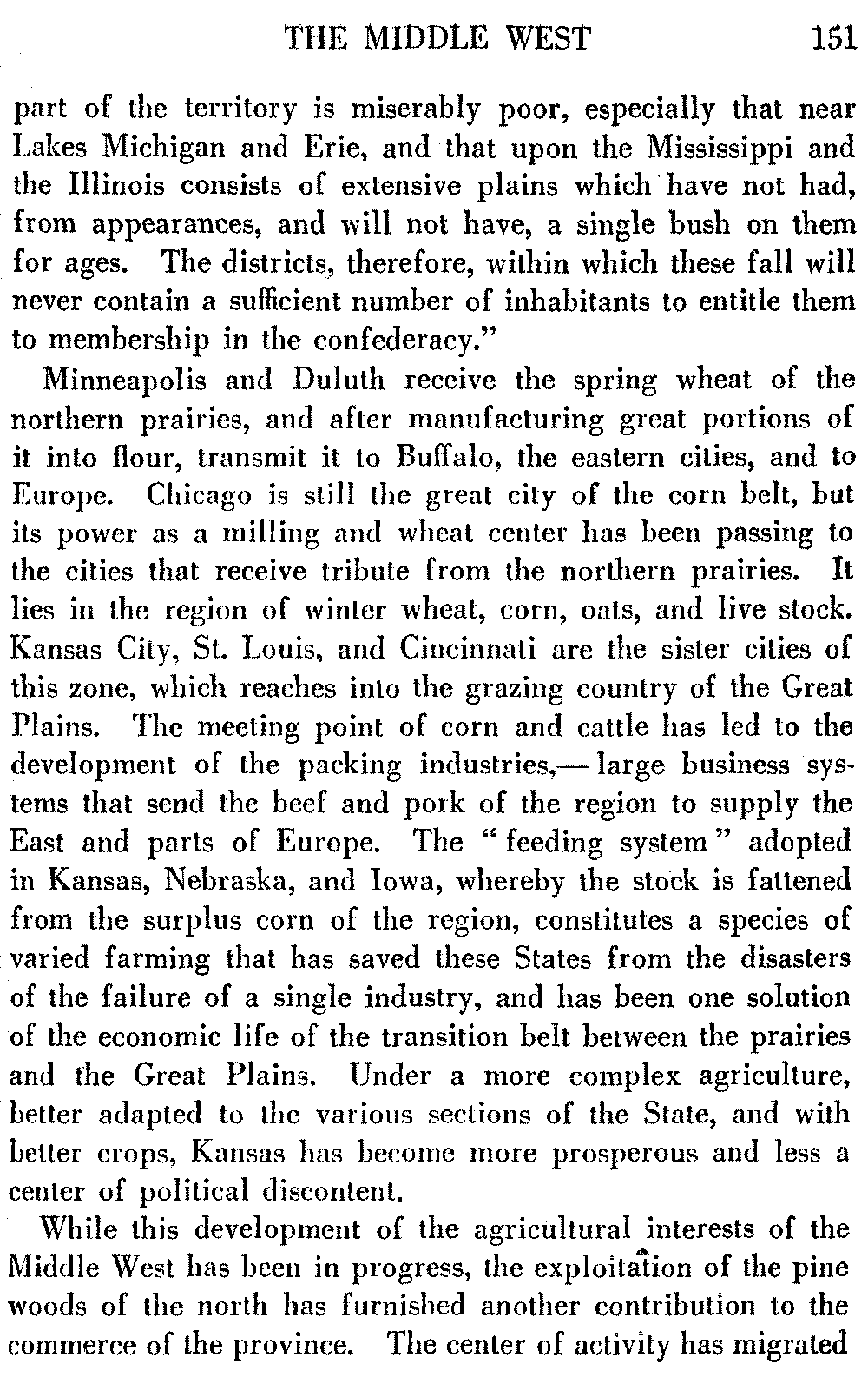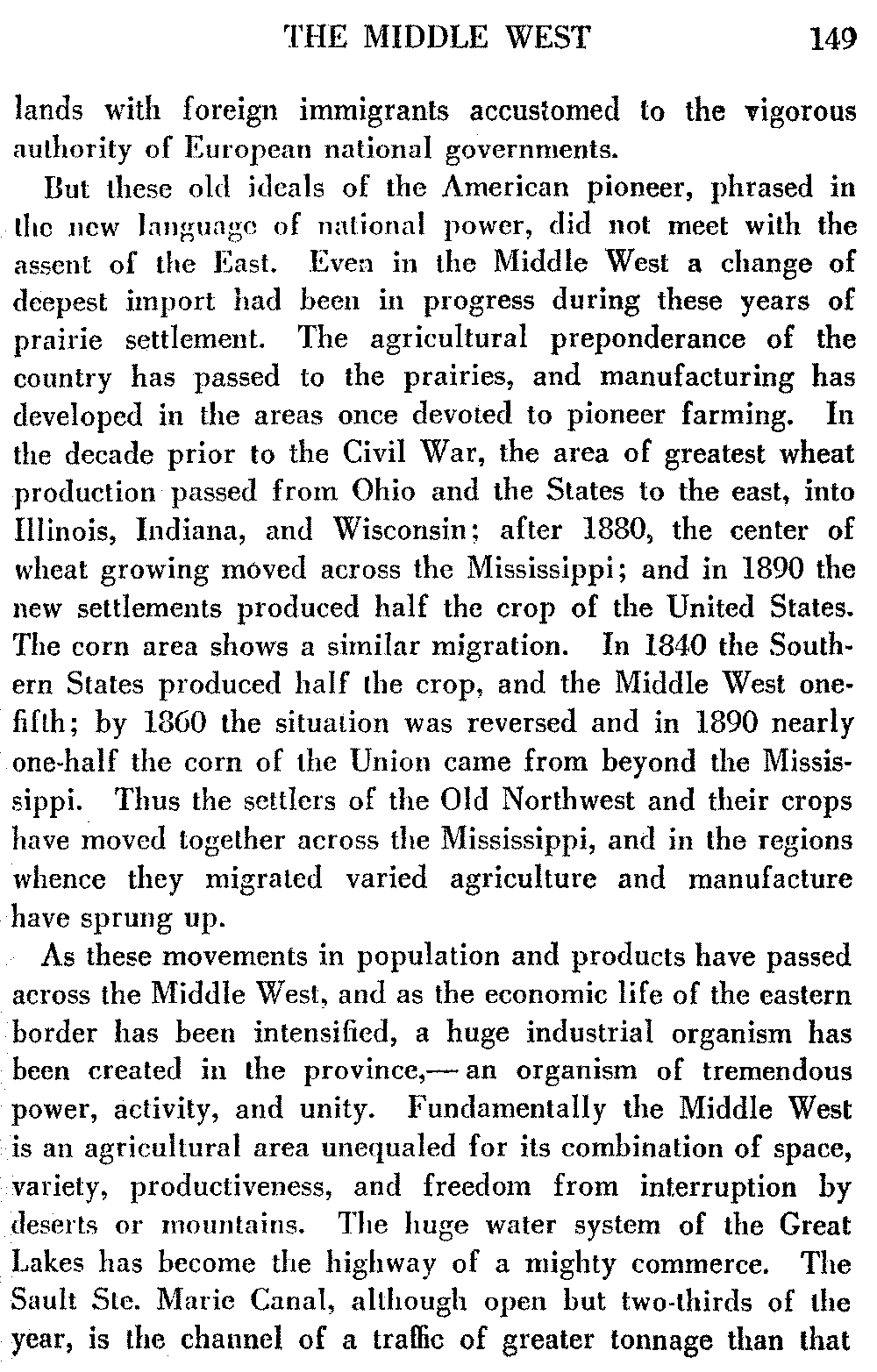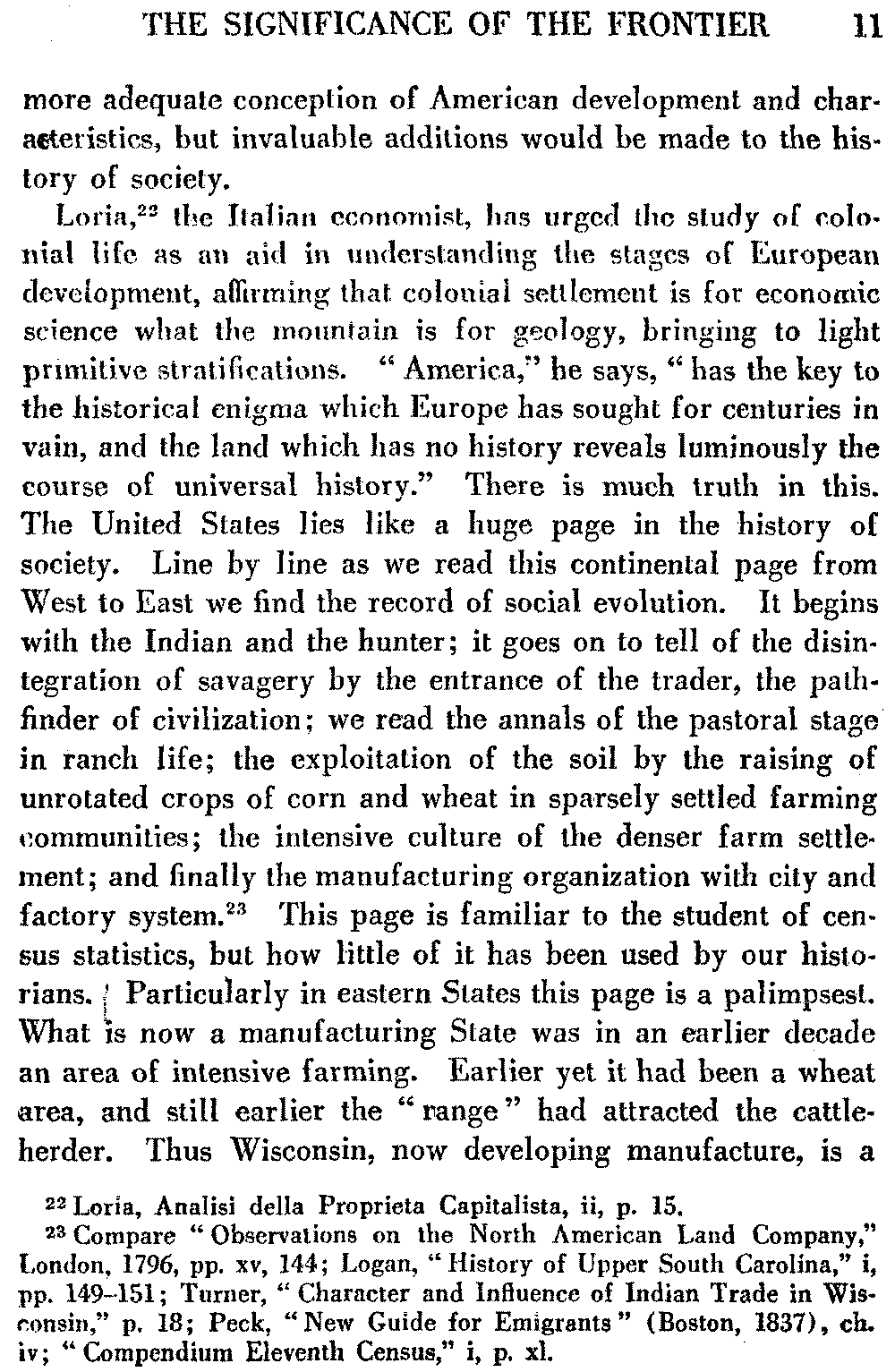 Loria,[11:1] the Italian economist, has urged the study of colonial life as an aid in understanding the stages of European development, affirming that colonial settlement is for economic science what the mountain is for geology, bringing to light primitive stratifications. "America," he says, "has the key to the historical enigma which Europe has sought for centuries in vain, and the land which has no history reveals luminously the course of universal history." There is much truth in this. The United States lies like a huge page in the history of society. Line by line as we read this continental page from West to East we find the record of social evolution. It begins with the Indian and the hunter; it goes on to tell of the disintegration of savagery by the entrance of the trader, the pathfinder of civilization; we read the annals of the pastoral stage in ranch life; the exploitation of the soil by the raising of unrotated crops of corn and wheat in sparsely settled farming communities; the intensive culture of the denser farm settlement; and finally the manufacturing organization with city and factory system.[11:2] This page is familiar to the student of census statistics, but how little of it has been used by our historians. Particularly in eastern States this page is a palimpsest. What is now a manufacturing State was in an earlier decade an area of intensive farming. Earlier yet it had been a wheat area, and still earlier the "range" had attracted the cattle-herder. Thus Wisconsin, now developing manufacture, is a [12]State with varied agricultural interests. But earlier it was given over to almost exclusive grain-raising, like North Dakota at the present time.