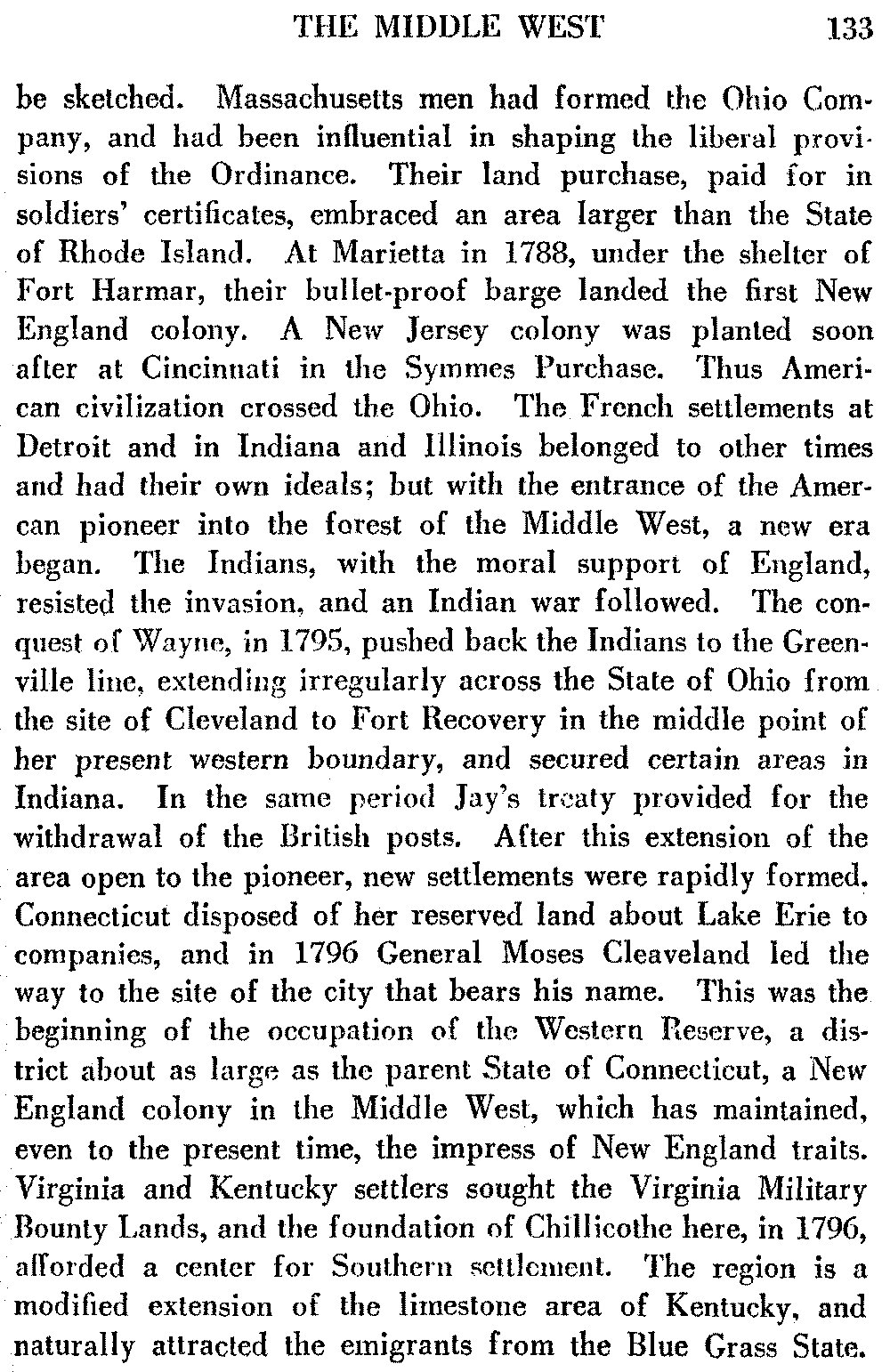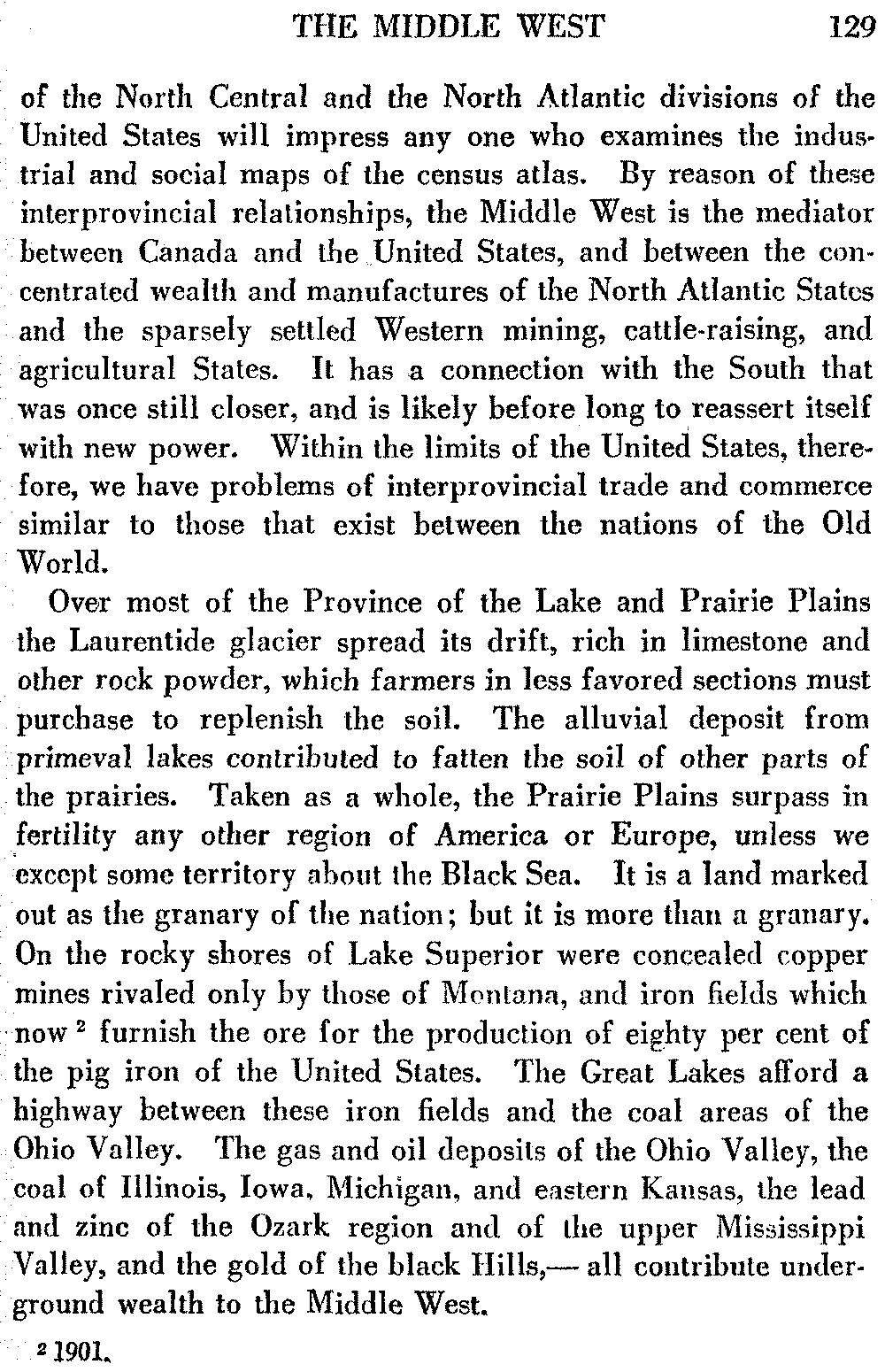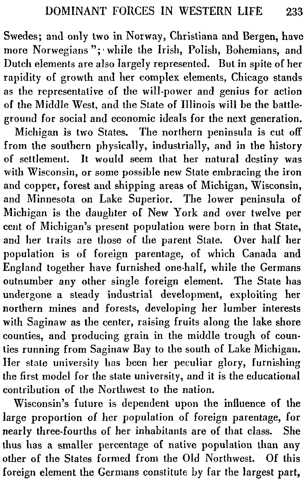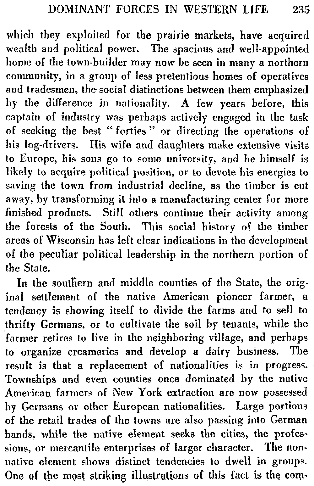 Loria,[11:1] the Italian economist, has urged the study of colonial life as an aid in understanding the stages of European development, affirming that colonial settlement is for economic science what the mountain is for geology, bringing to light primitive stratifications. "America," he says, "has the key to the historical enigma which Europe has sought for centuries in vain, and the land which has no history reveals luminously the course of universal history." There is much truth in this. The United States lies like a huge page in the history of society. Line by line as we read this continental page from West to East we find the record of social evolution. It begins with the Indian and the hunter; it goes on to tell of the disintegration of savagery by the entrance of the trader, the pathfinder of civilization; we read the annals of the pastoral stage in ranch life; the exploitation of the soil by the raising of unrotated crops of corn and wheat in sparsely settled farming communities; the intensive culture of the denser farm settlement; and finally the manufacturing organization with city and factory system.[11:2] This page is familiar to the student of census statistics, but how little of it has been used by our historians. Particularly in eastern States this page is a palimpsest. What is now a manufacturing State was in an earlier decade an area of intensive farming. Earlier yet it had been a wheat area, and still earlier the "range" had attracted the cattle-herder. Thus Wisconsin, now developing manufacture, is a [12]State with varied agricultural interests. But earlier it was given over to almost exclusive grain-raising, like North Dakota at the present time.