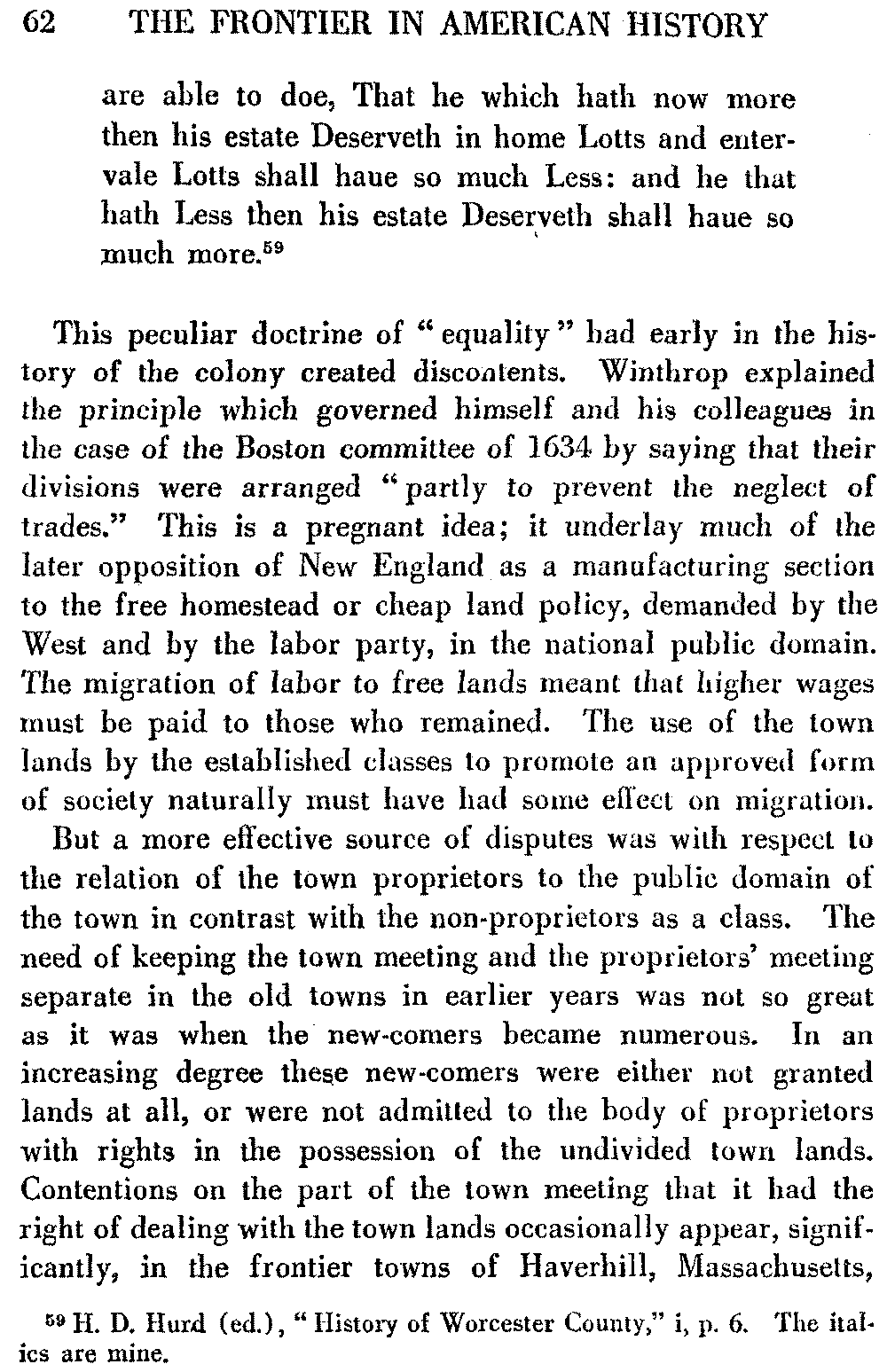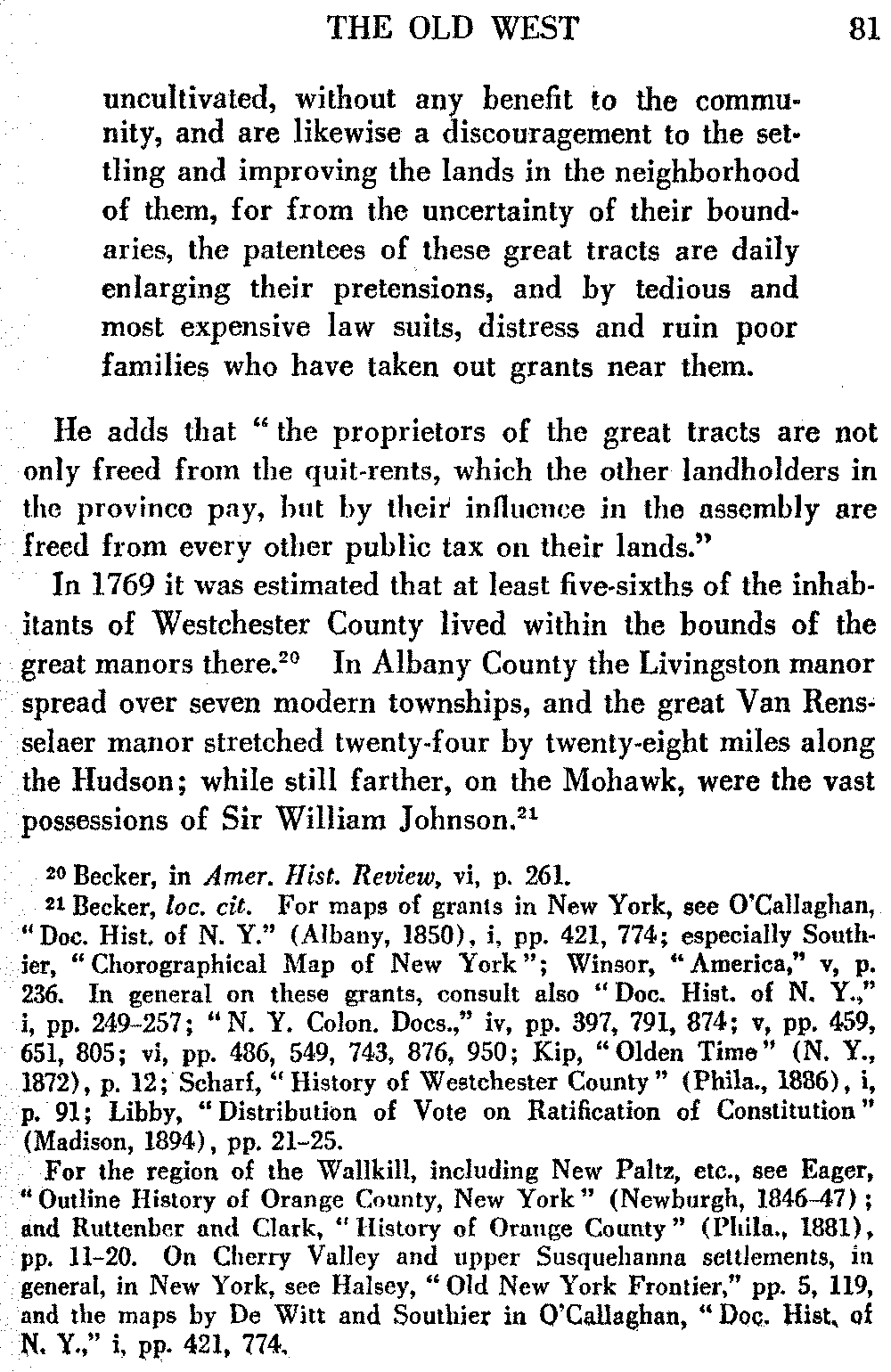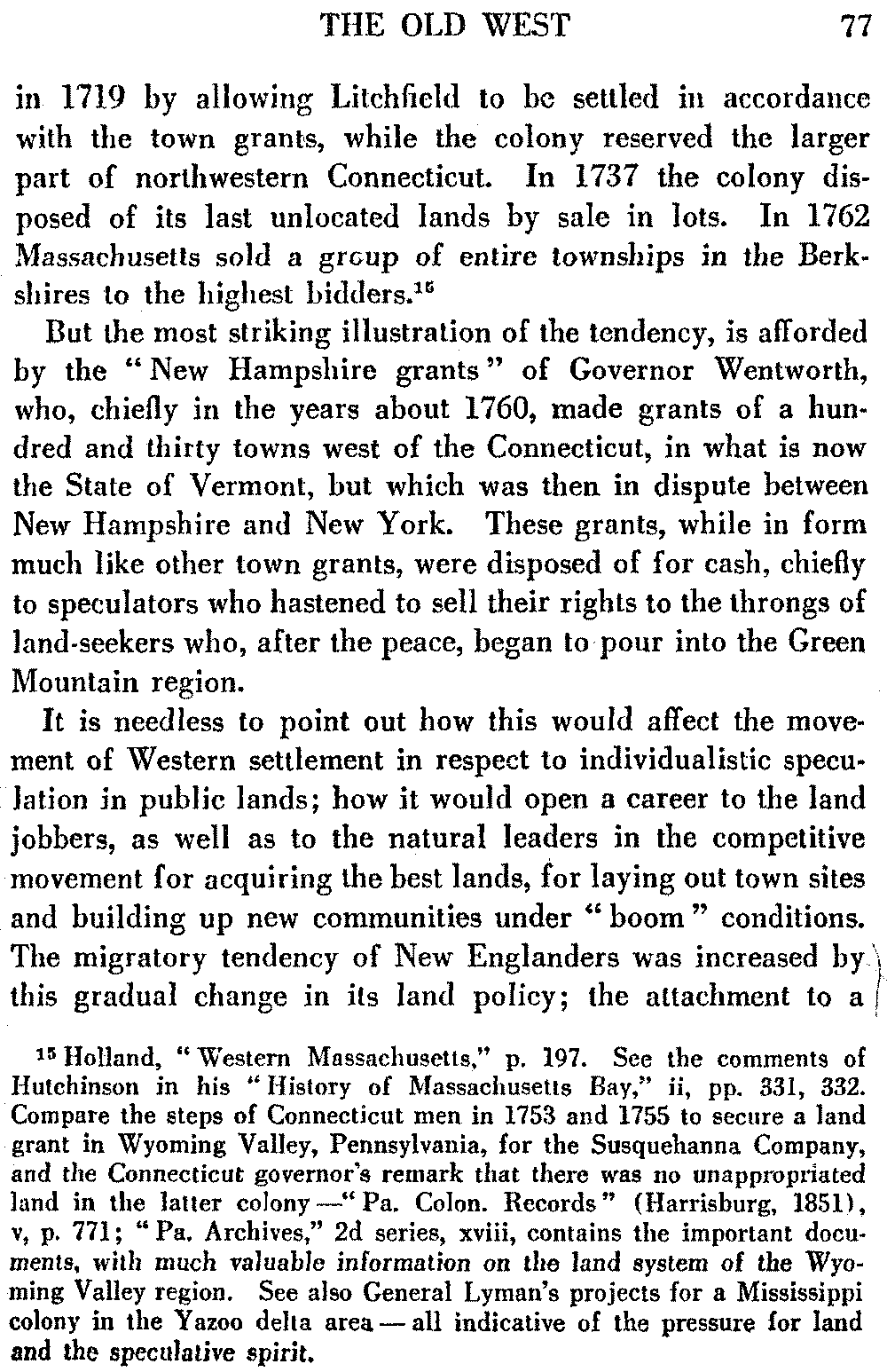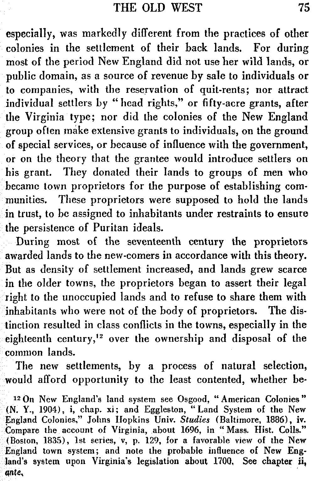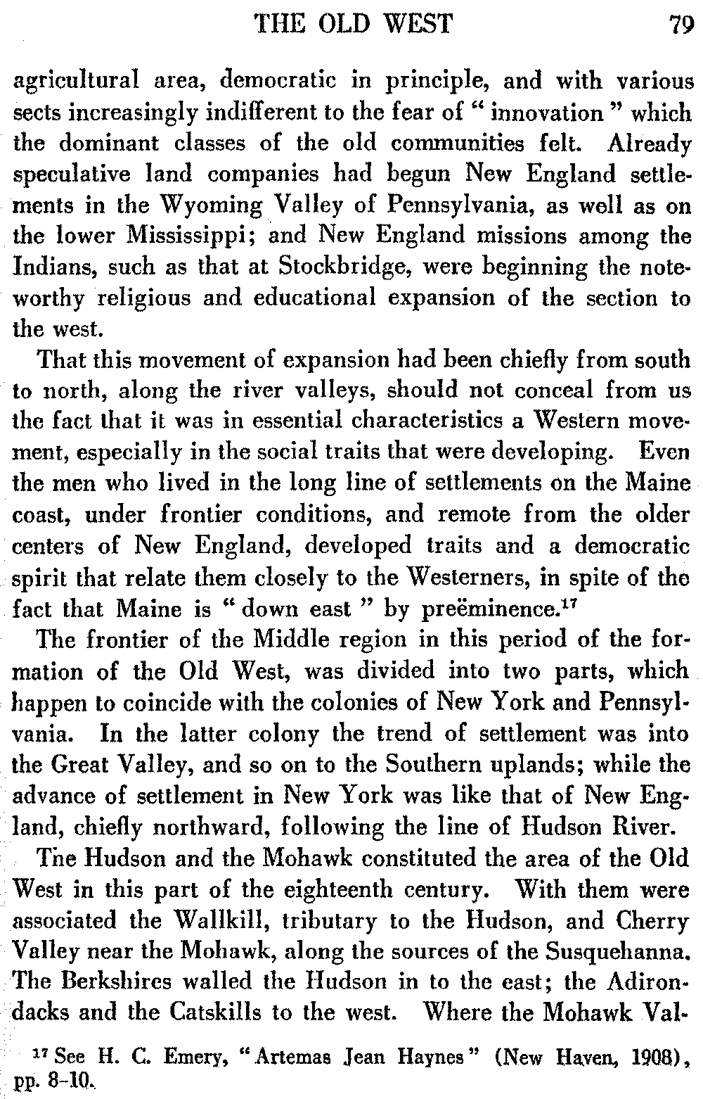 Loria,[11:1] the Italian economist, has urged the study of colonial life as an aid in understanding the stages of European development, affirming that colonial settlement is for economic science what the mountain is for geology, bringing to light primitive stratifications. "America," he says, "has the key to the historical enigma which Europe has sought for centuries in vain, and the land which has no history reveals luminously the course of universal history." There is much truth in this. The United States lies like a huge page in the history of society. Line by line as we read this continental page from West to East we find the record of social evolution. It begins with the Indian and the hunter; it goes on to tell of the disintegration of savagery by the entrance of the trader, the pathfinder of civilization; we read the annals of the pastoral stage in ranch life; the exploitation of the soil by the raising of unrotated crops of corn and wheat in sparsely settled farming communities; the intensive culture of the denser farm settlement; and finally the manufacturing organization with city and factory system.[11:2] This page is familiar to the student of census statistics, but how little of it has been used by our historians. Particularly in eastern States this page is a palimpsest. What is now a manufacturing State was in an earlier decade an area of intensive farming. Earlier yet it had been a wheat area, and still earlier the "range" had attracted the cattle-herder. Thus Wisconsin, now developing manufacture, is a [12]State with varied agricultural interests. But earlier it was given over to almost exclusive grain-raising, like North Dakota at the present time.