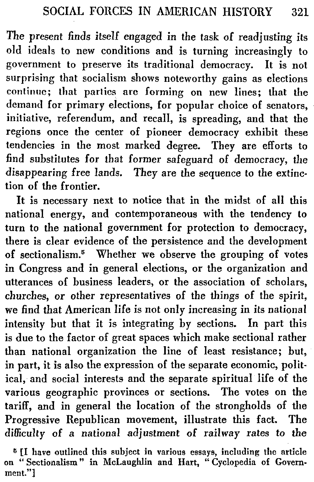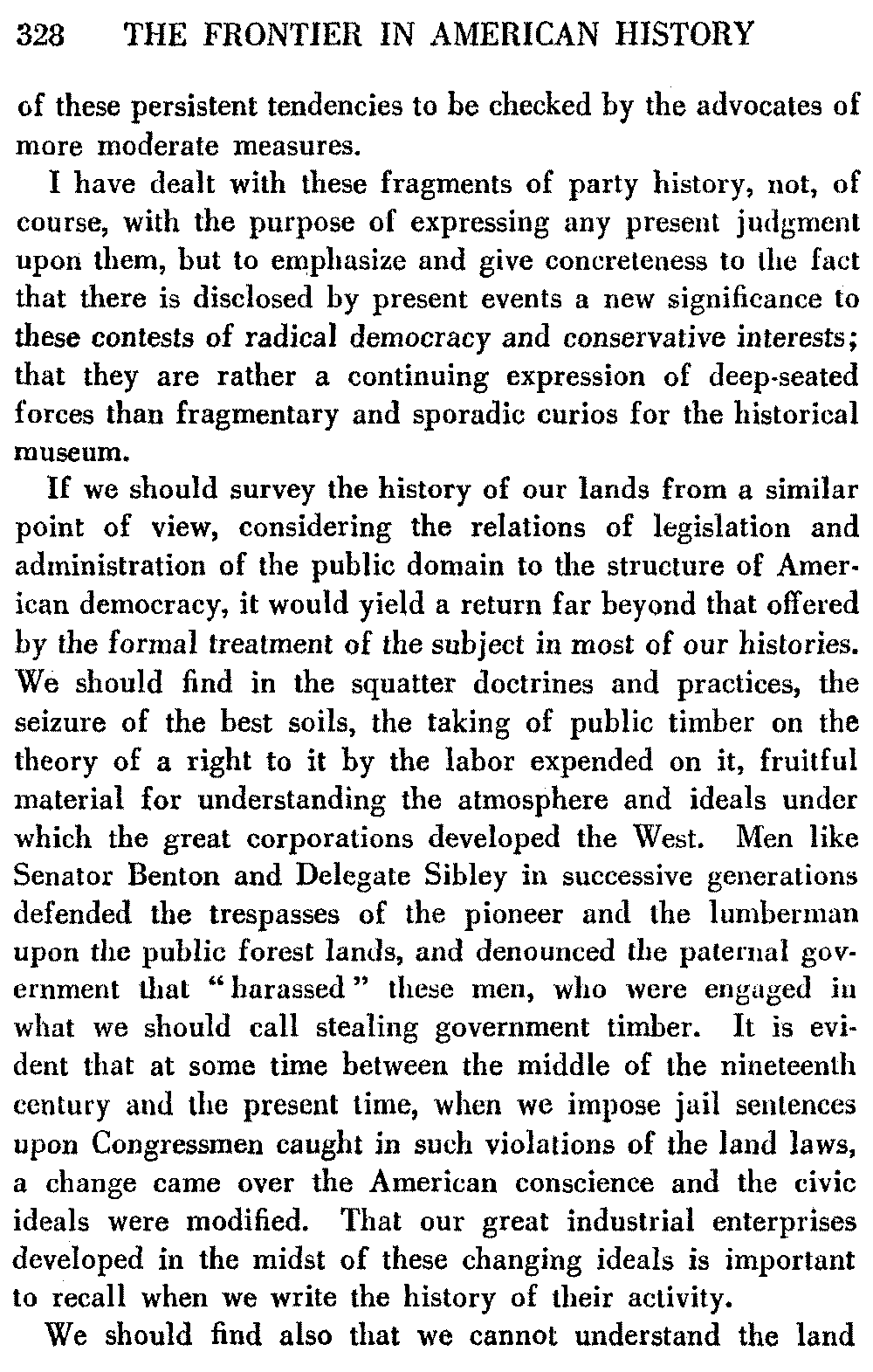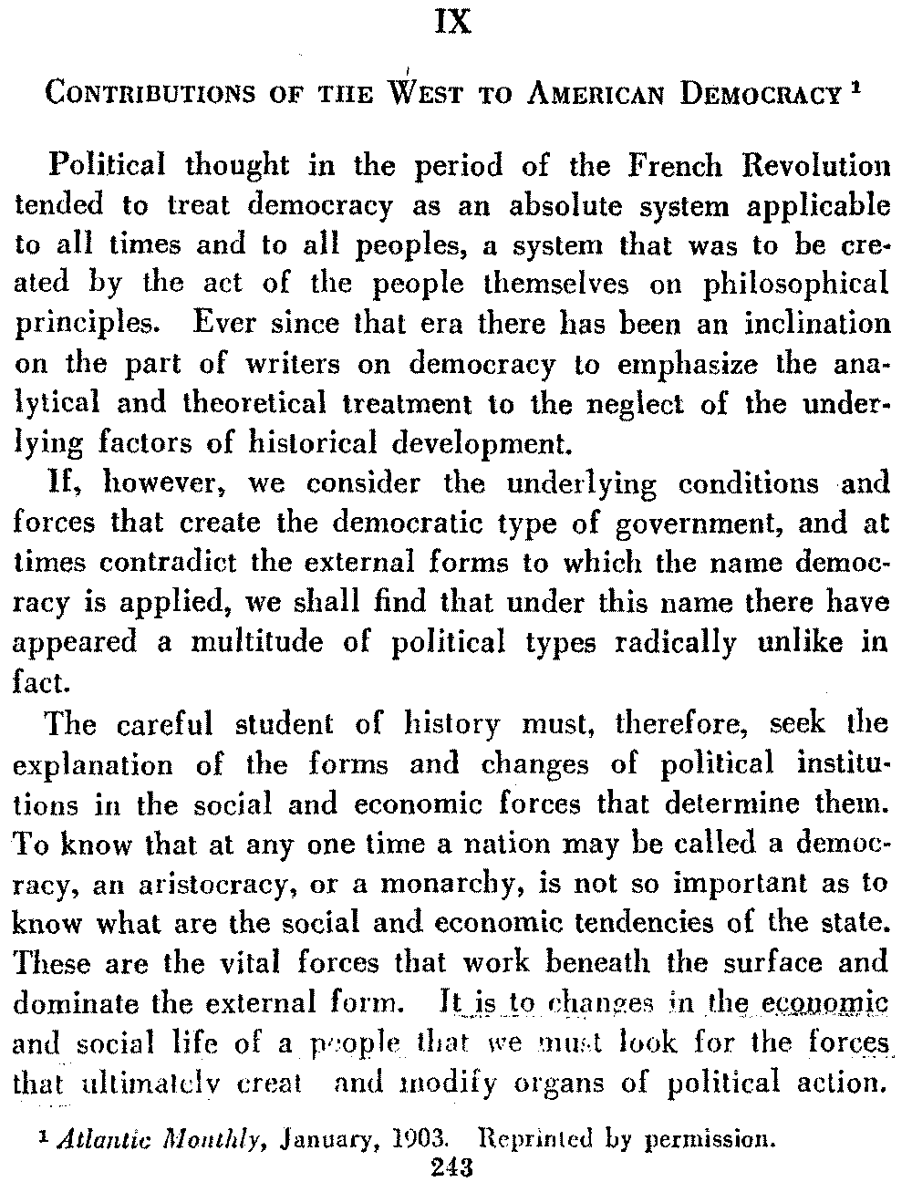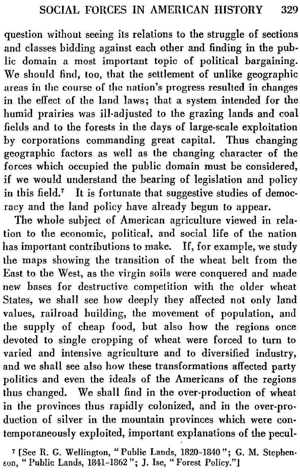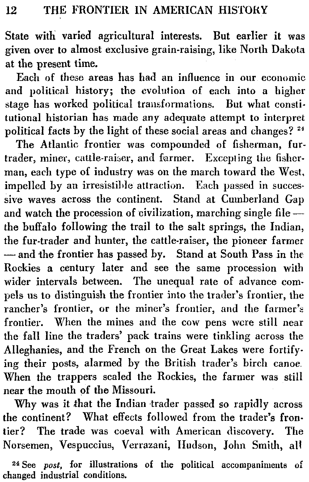 Each of these areas has had an influence in our economic and political history; the evolution of each into a higher stage has worked political transformations. But what constitutional historian has made any adequate attempt to interpret political facts by the light of these social areas and changes?[12:1]