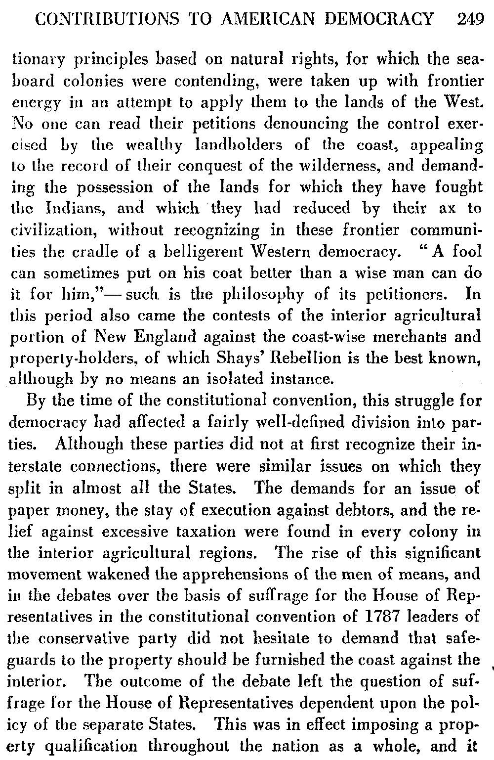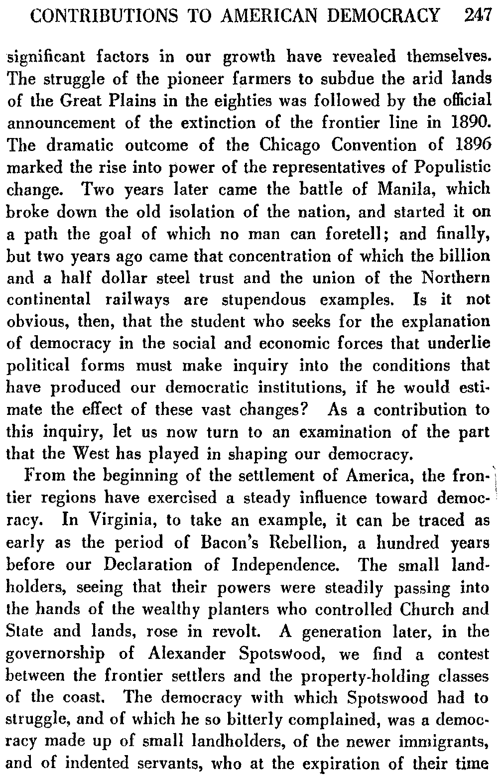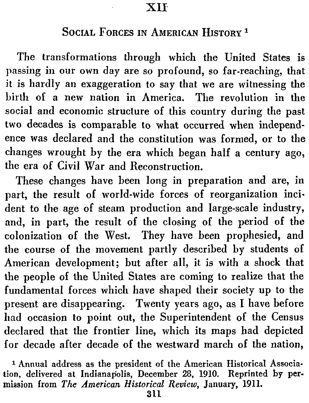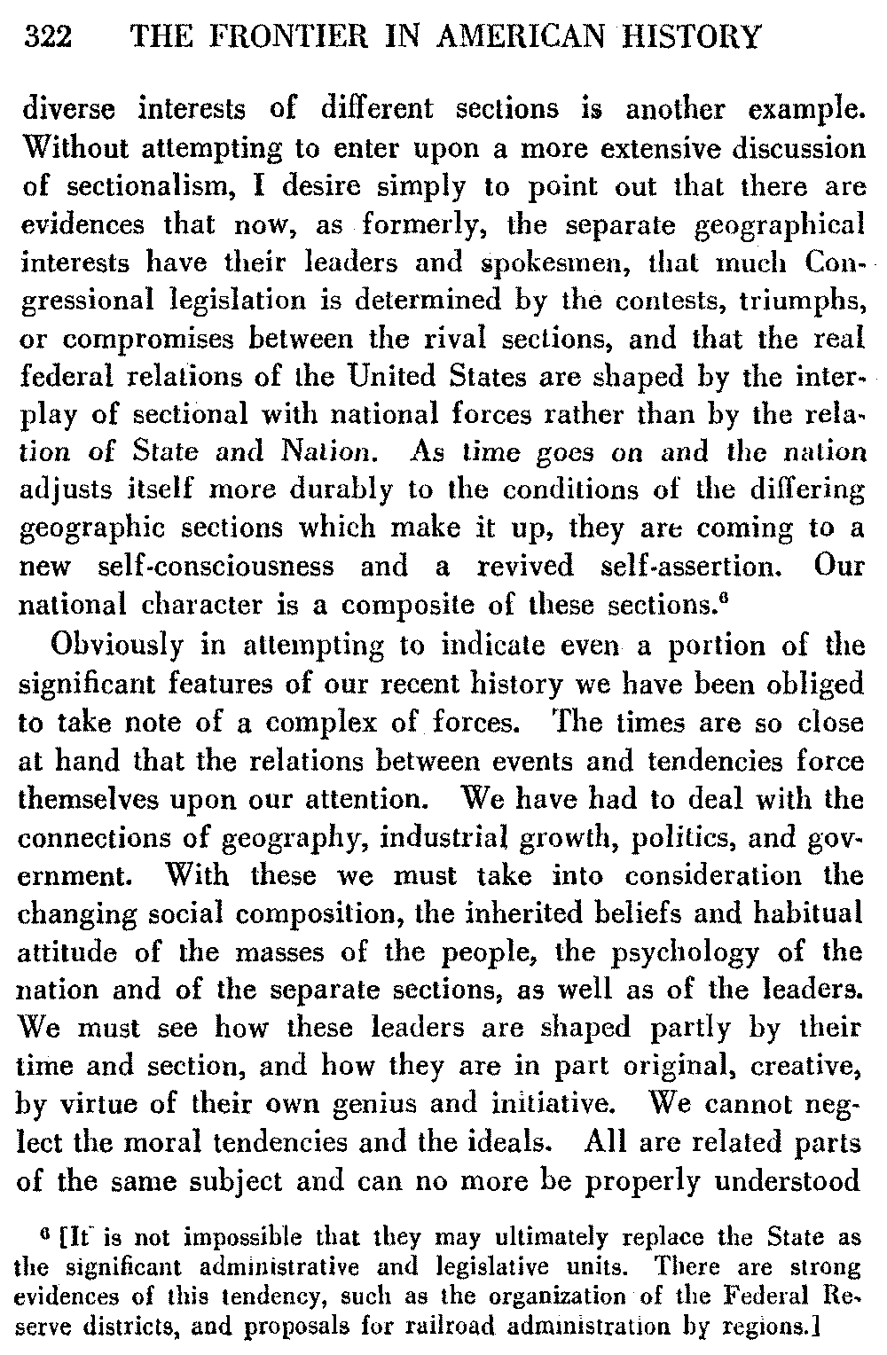 Each of these areas has had an influence in our economic and political history; the evolution of each into a higher stage has worked political transformations. But what constitutional historian has made any adequate attempt to interpret political facts by the light of these social areas and changes?[12:1]