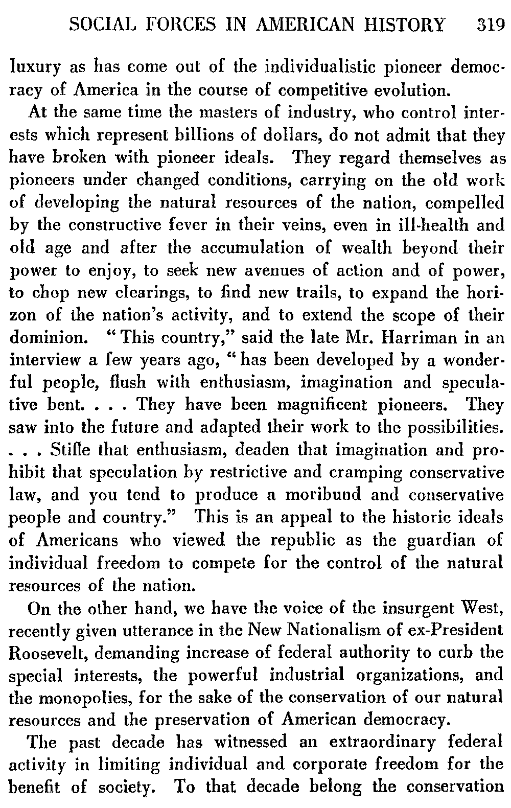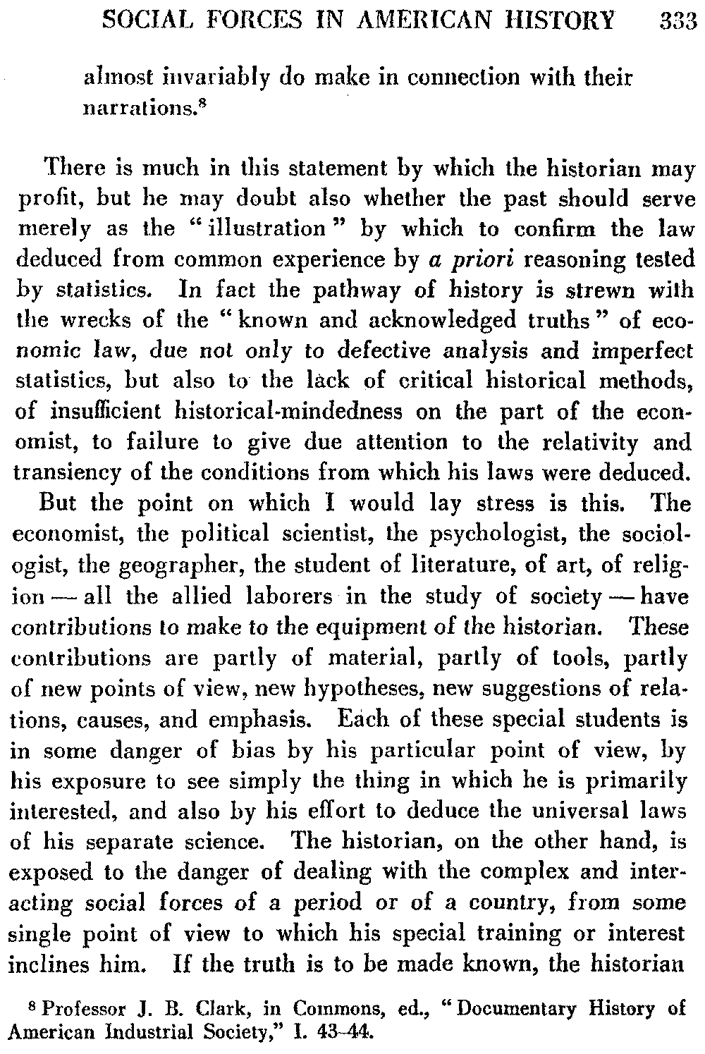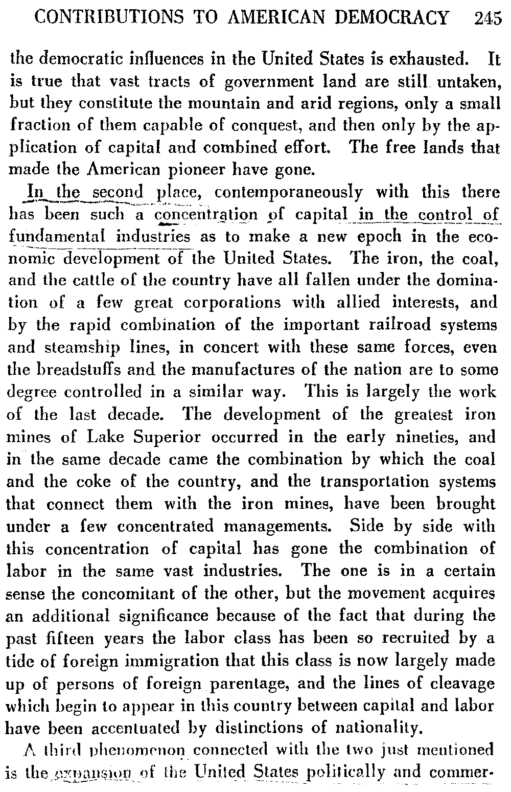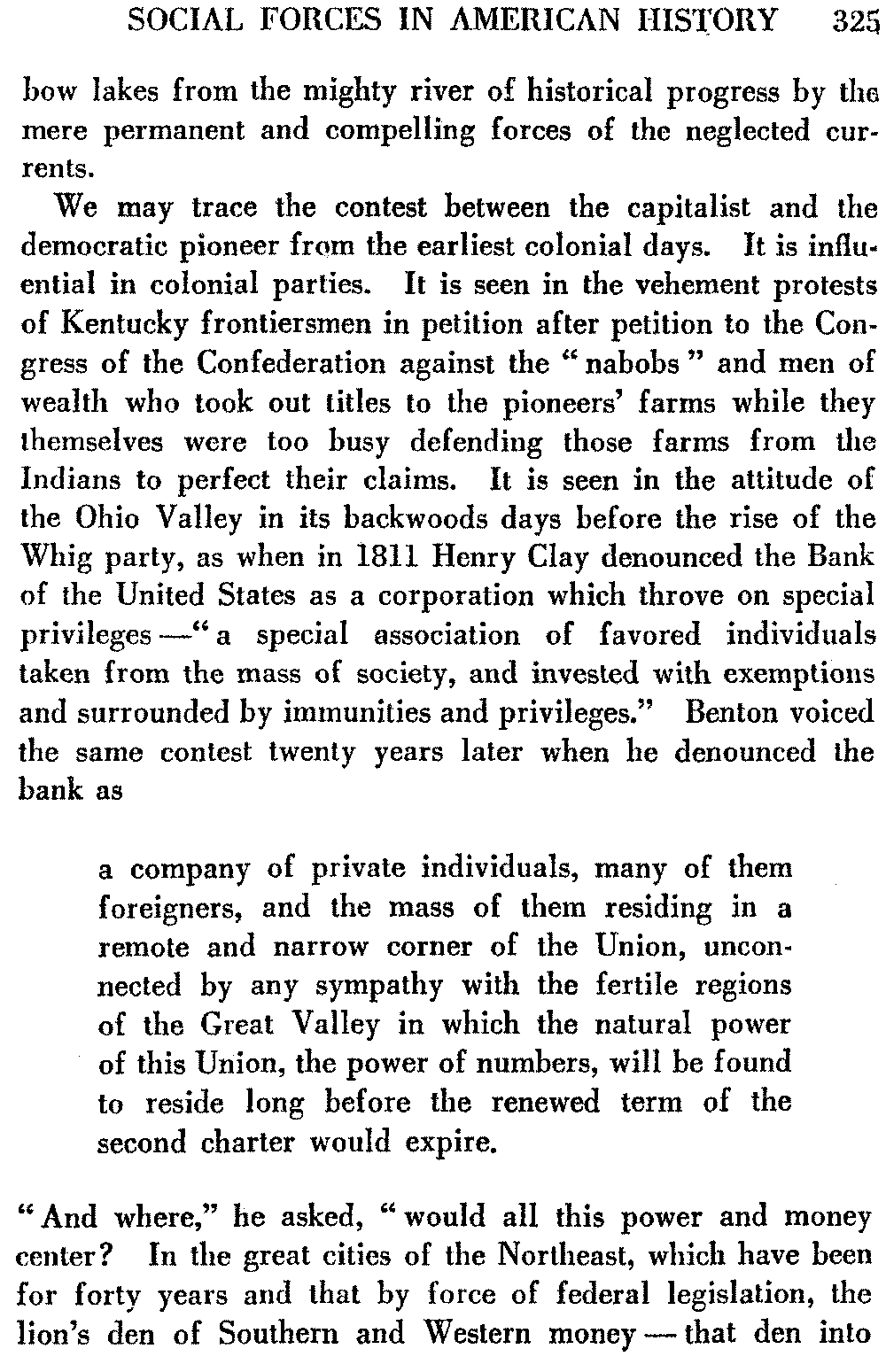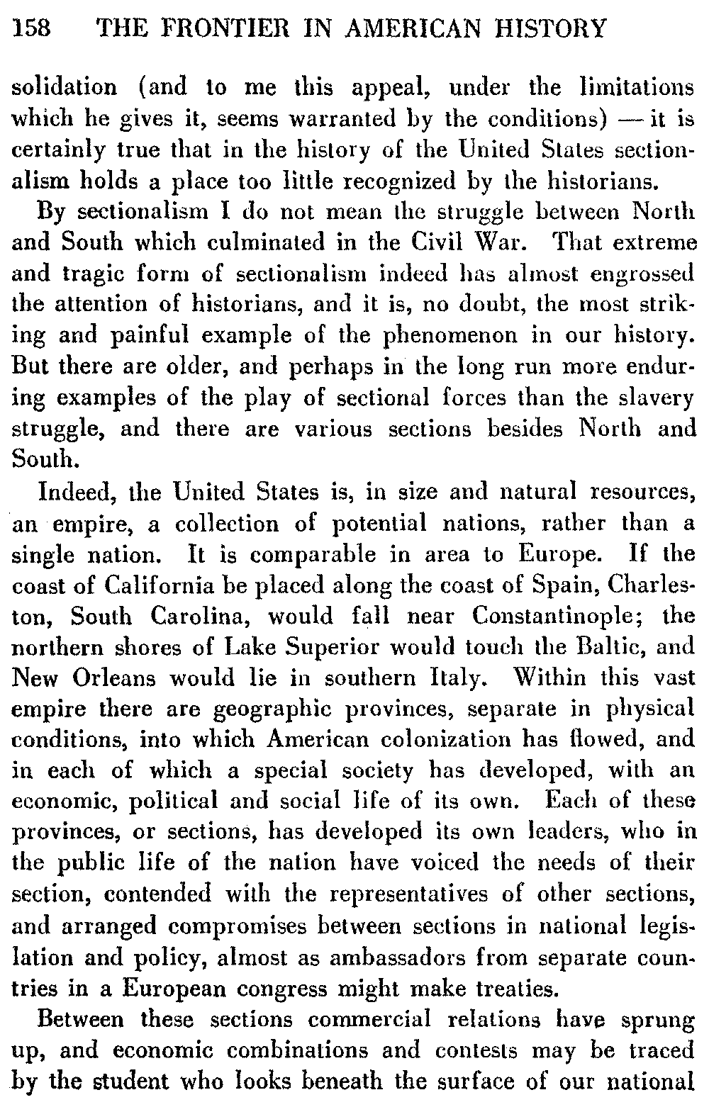 Each of these areas has had an influence in our economic and political history; the evolution of each into a higher stage has worked political transformations. But what constitutional historian has made any adequate attempt to interpret political facts by the light of these social areas and changes?[12:1]