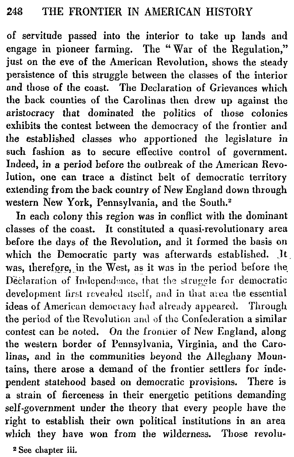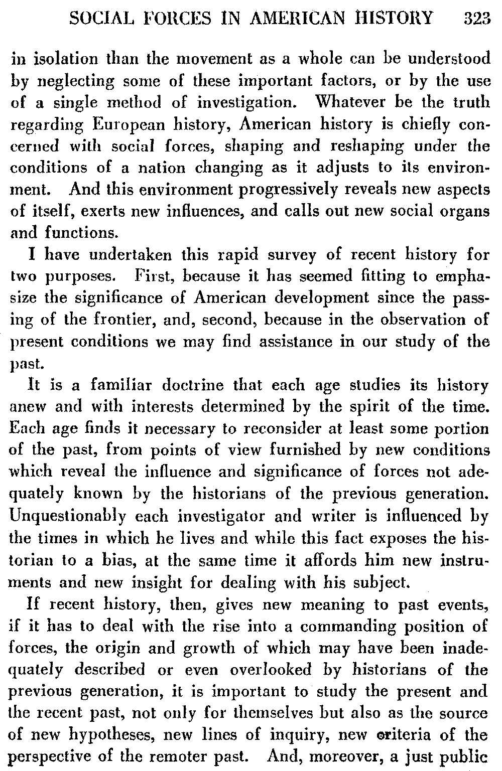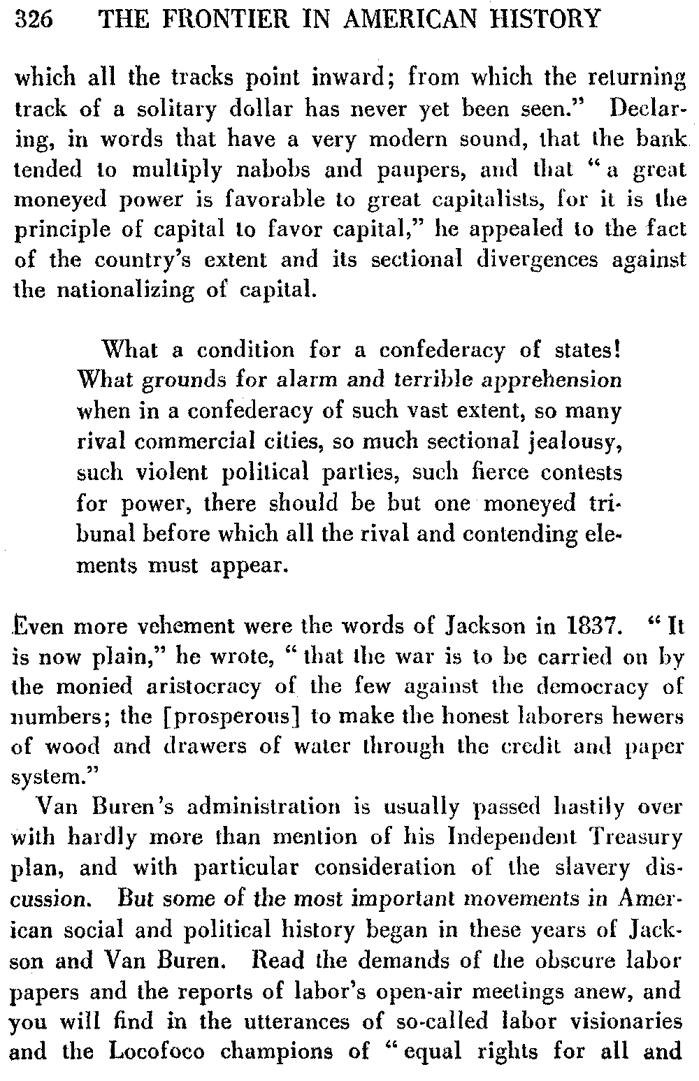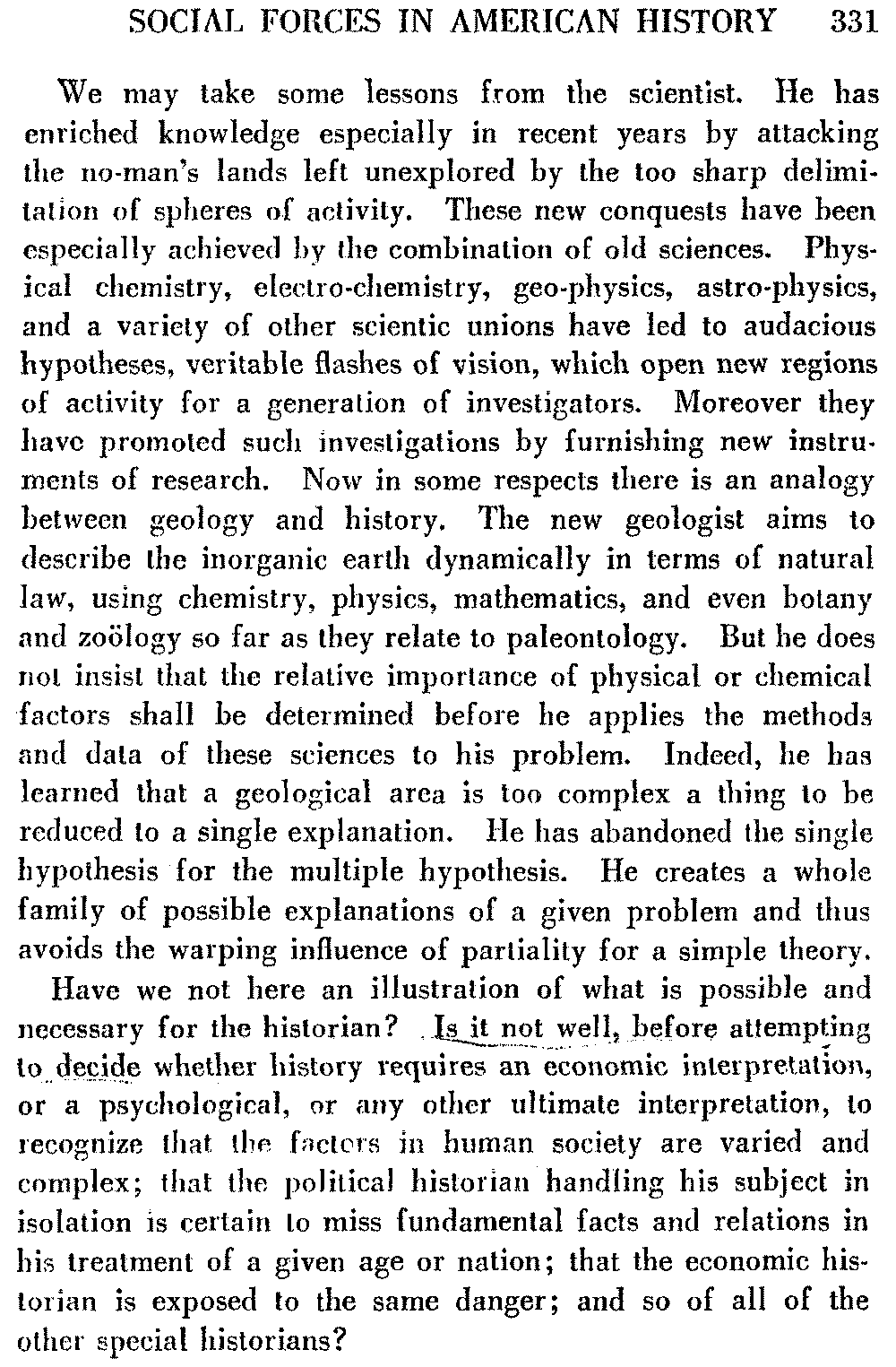 Each of these areas has had an influence in our economic and political history; the evolution of each into a higher stage has worked political transformations. But what constitutional historian has made any adequate attempt to interpret political facts by the light of these social areas and changes?[12:1]
