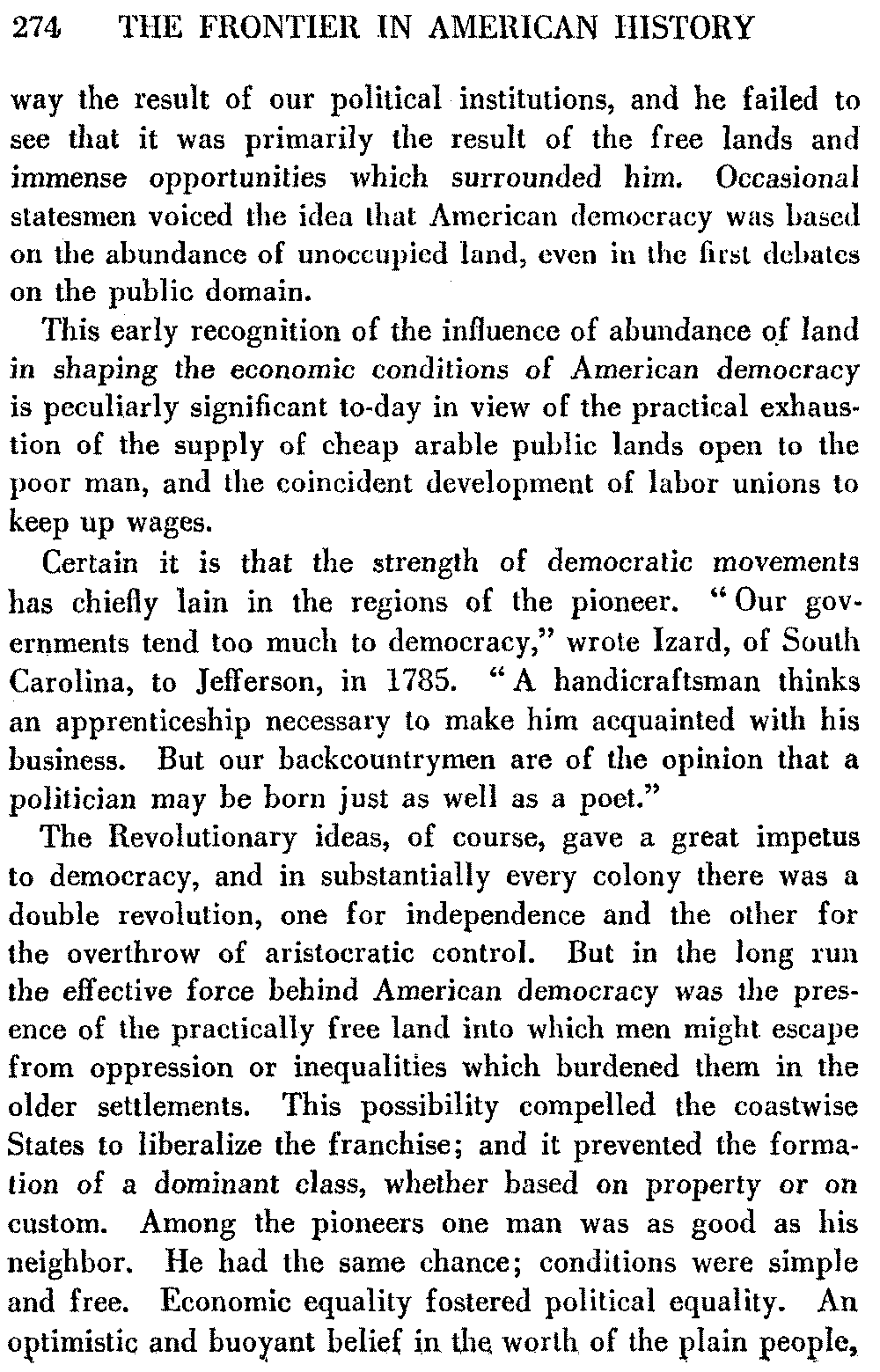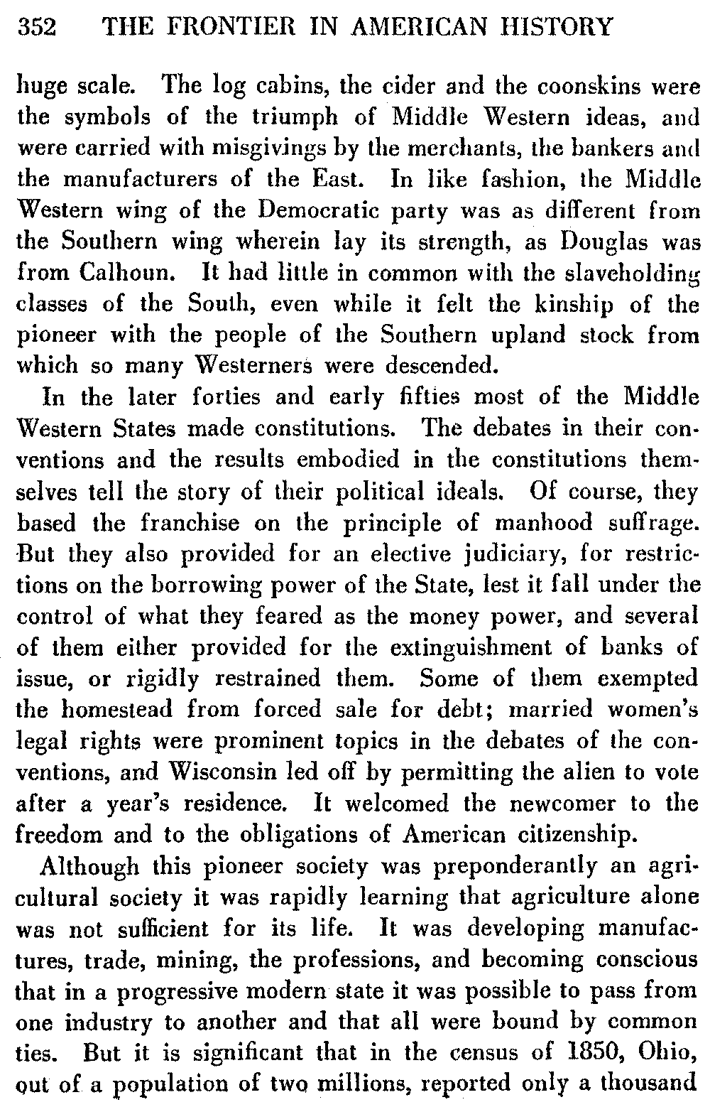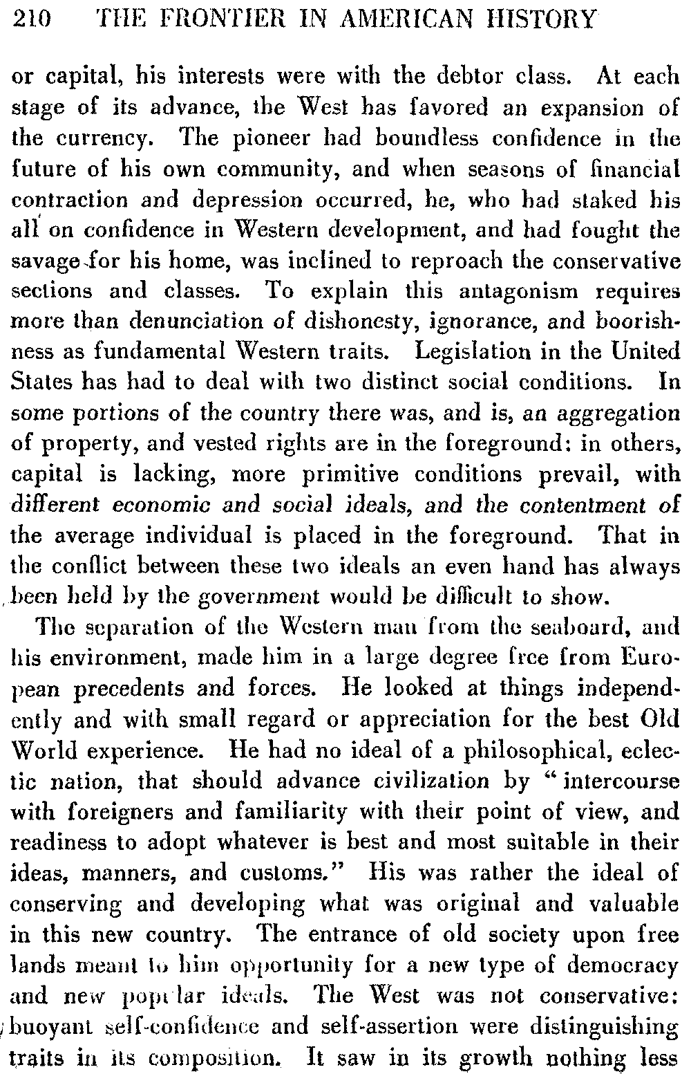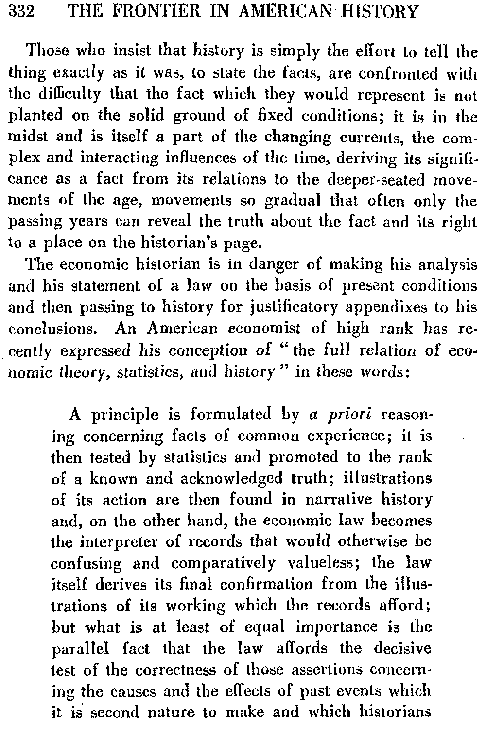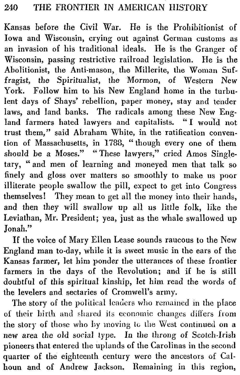 Each of these areas has had an influence in our economic and political history; the evolution of each into a higher stage has worked political transformations. But what constitutional historian has made any adequate attempt to interpret political facts by the light of these social areas and changes?[12:1]