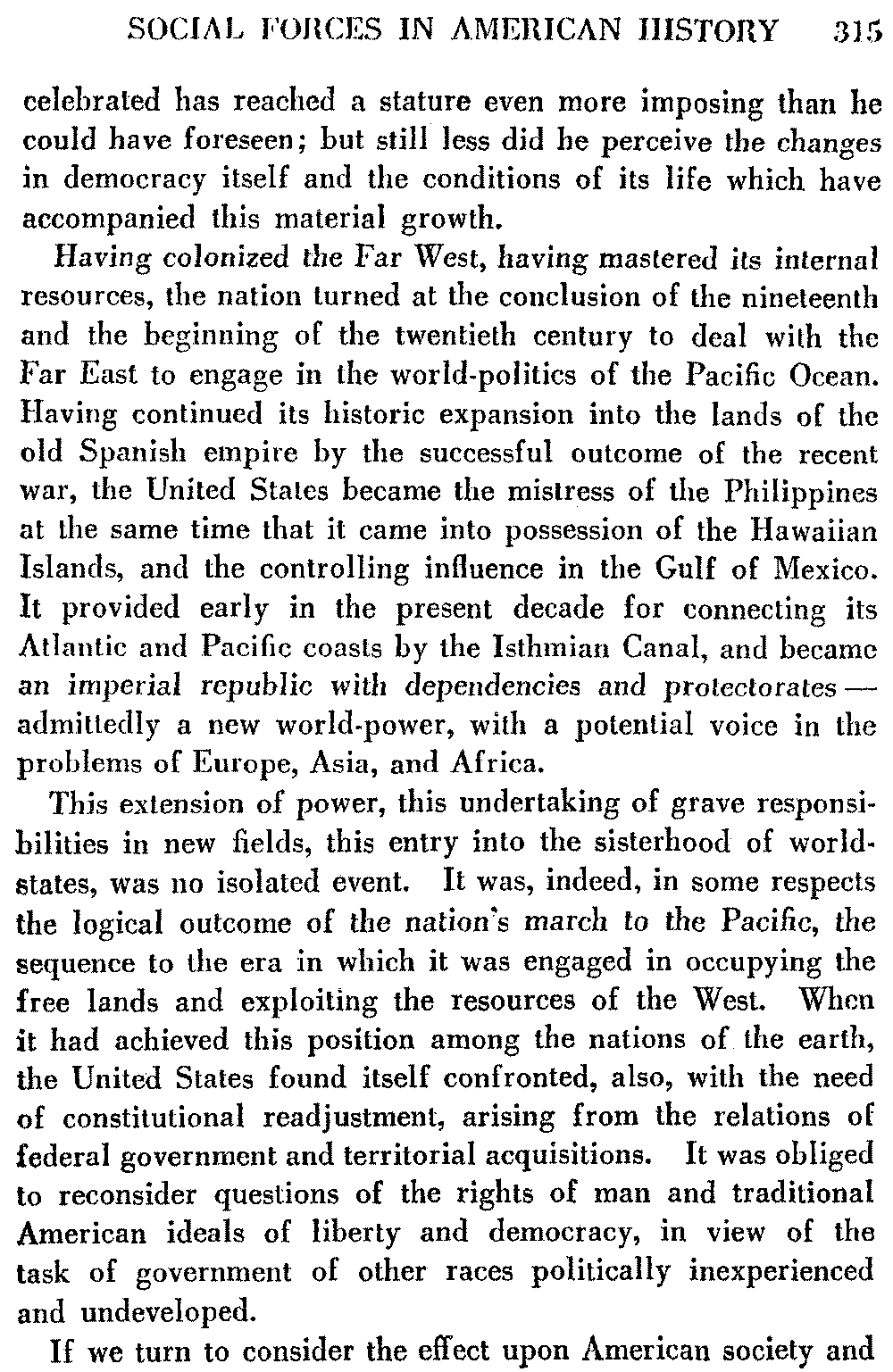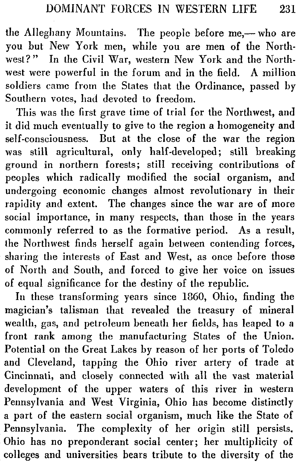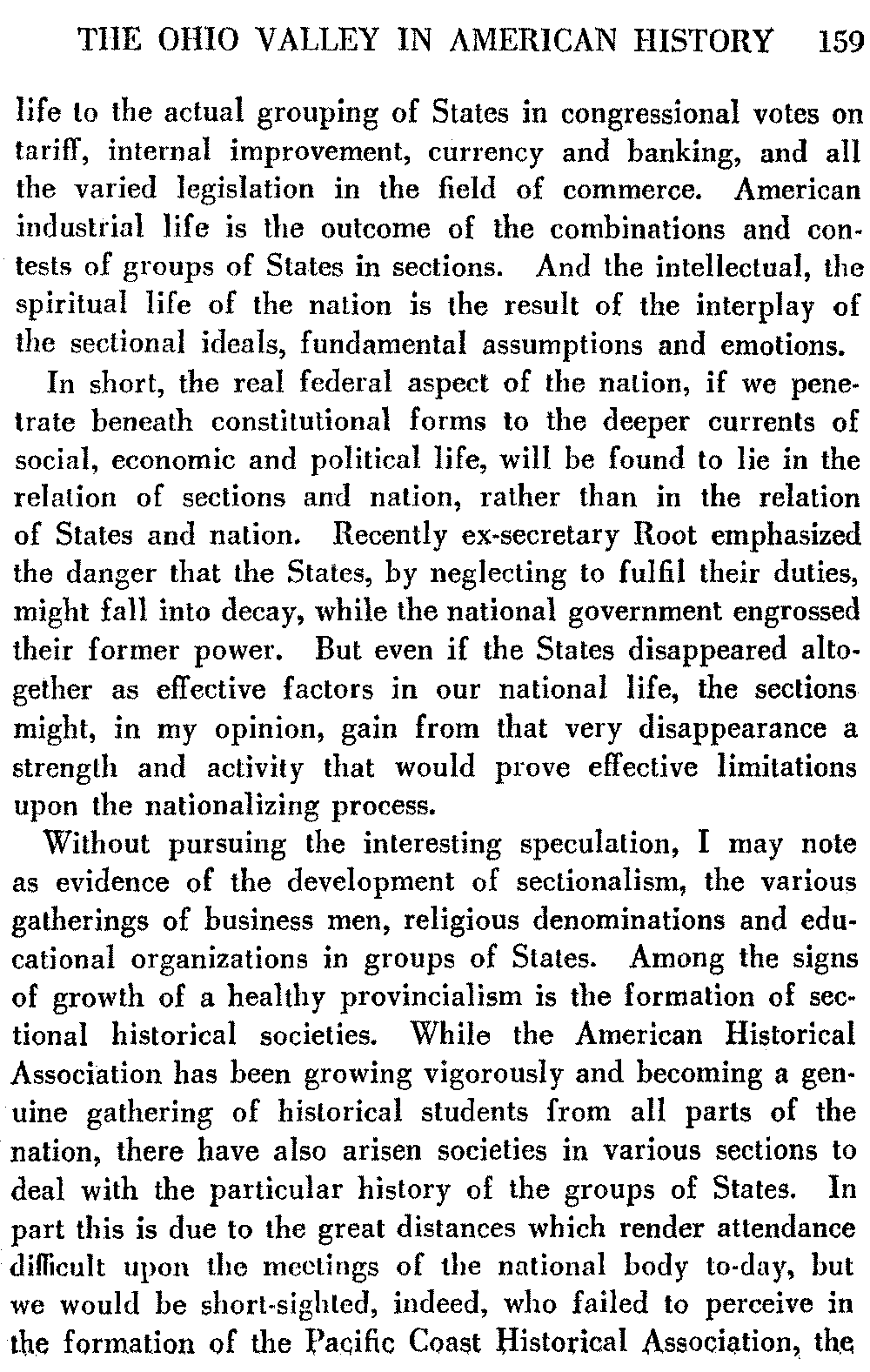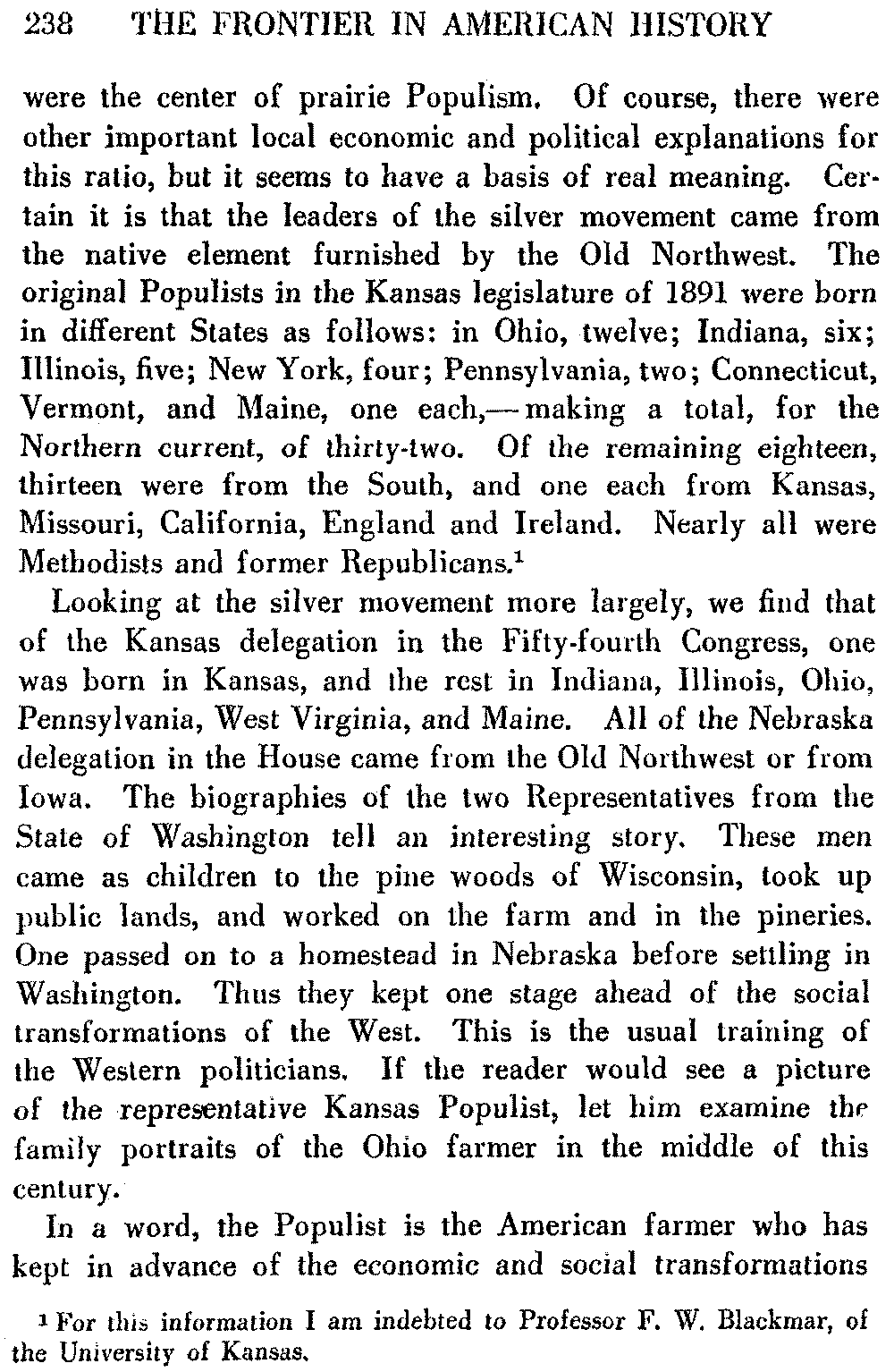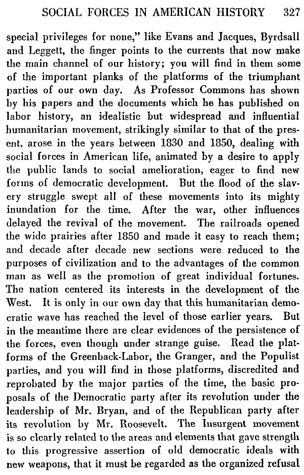 Each of these areas has had an influence in our economic and political history; the evolution of each into a higher stage has worked political transformations. But what constitutional historian has made any adequate attempt to interpret political facts by the light of these social areas and changes?[12:1]