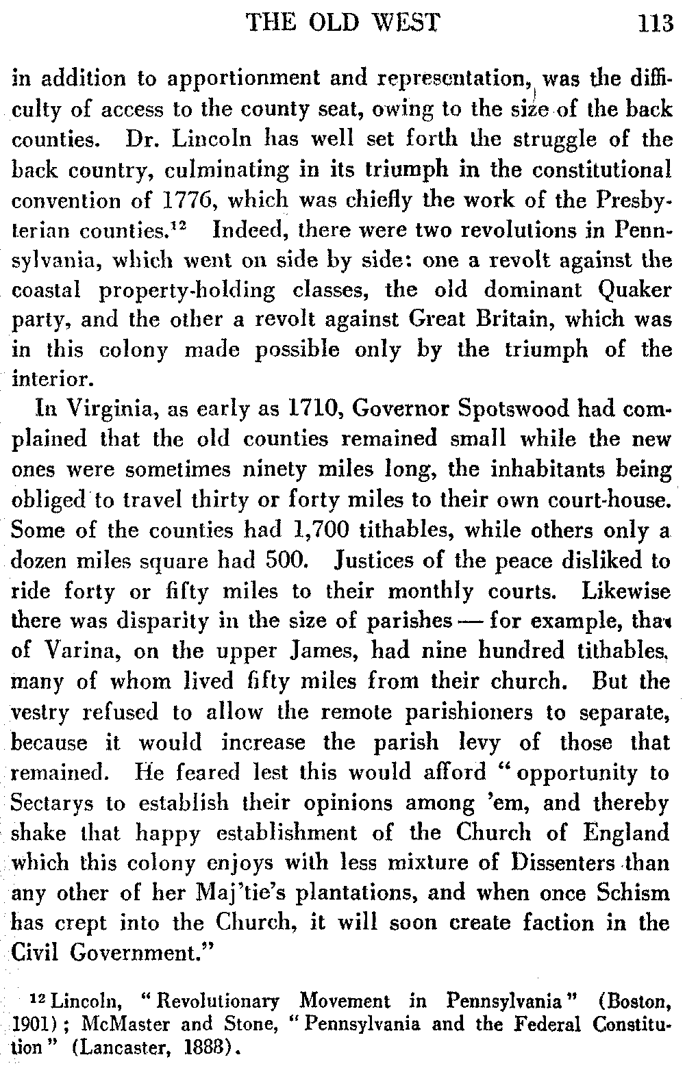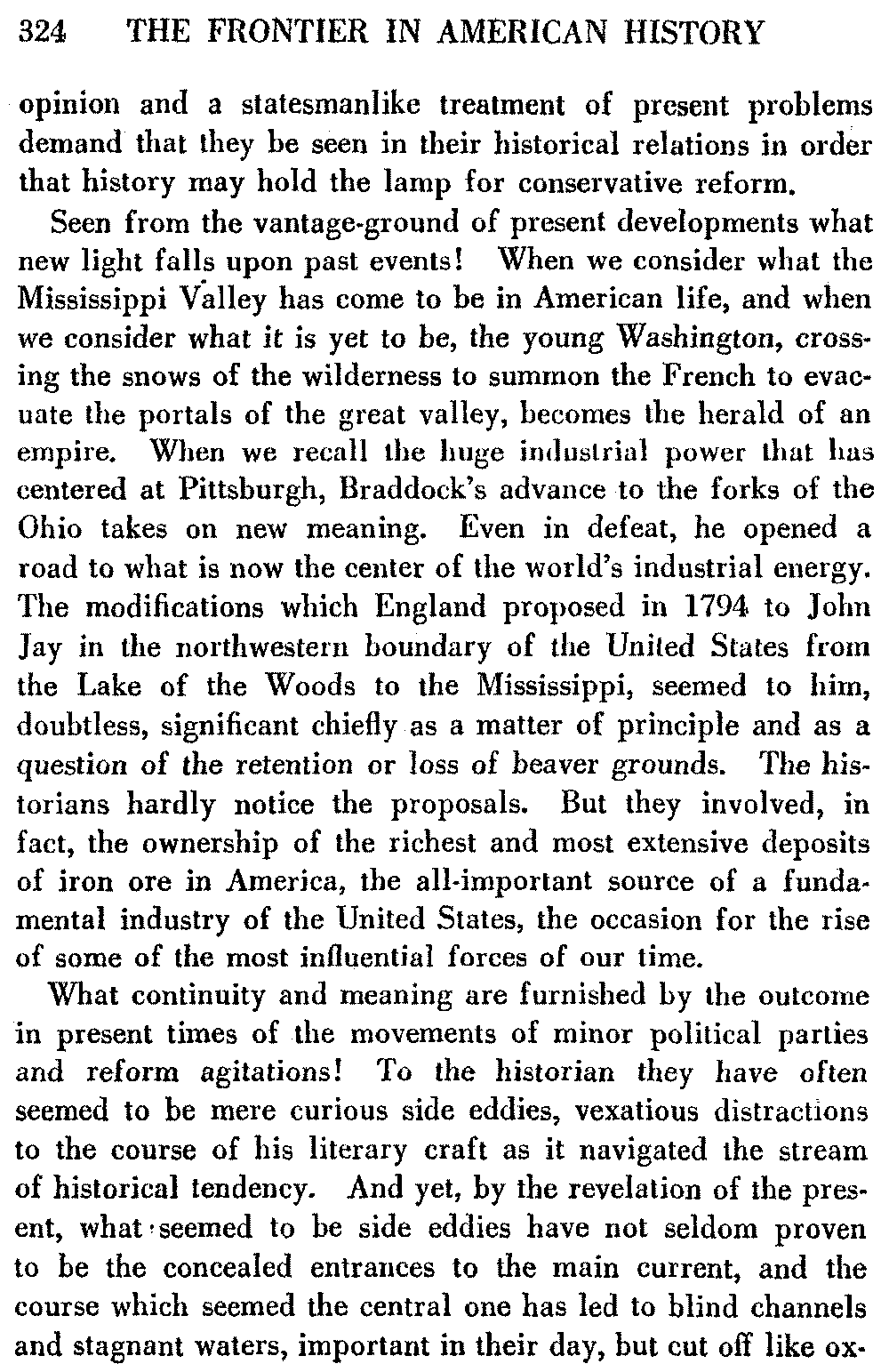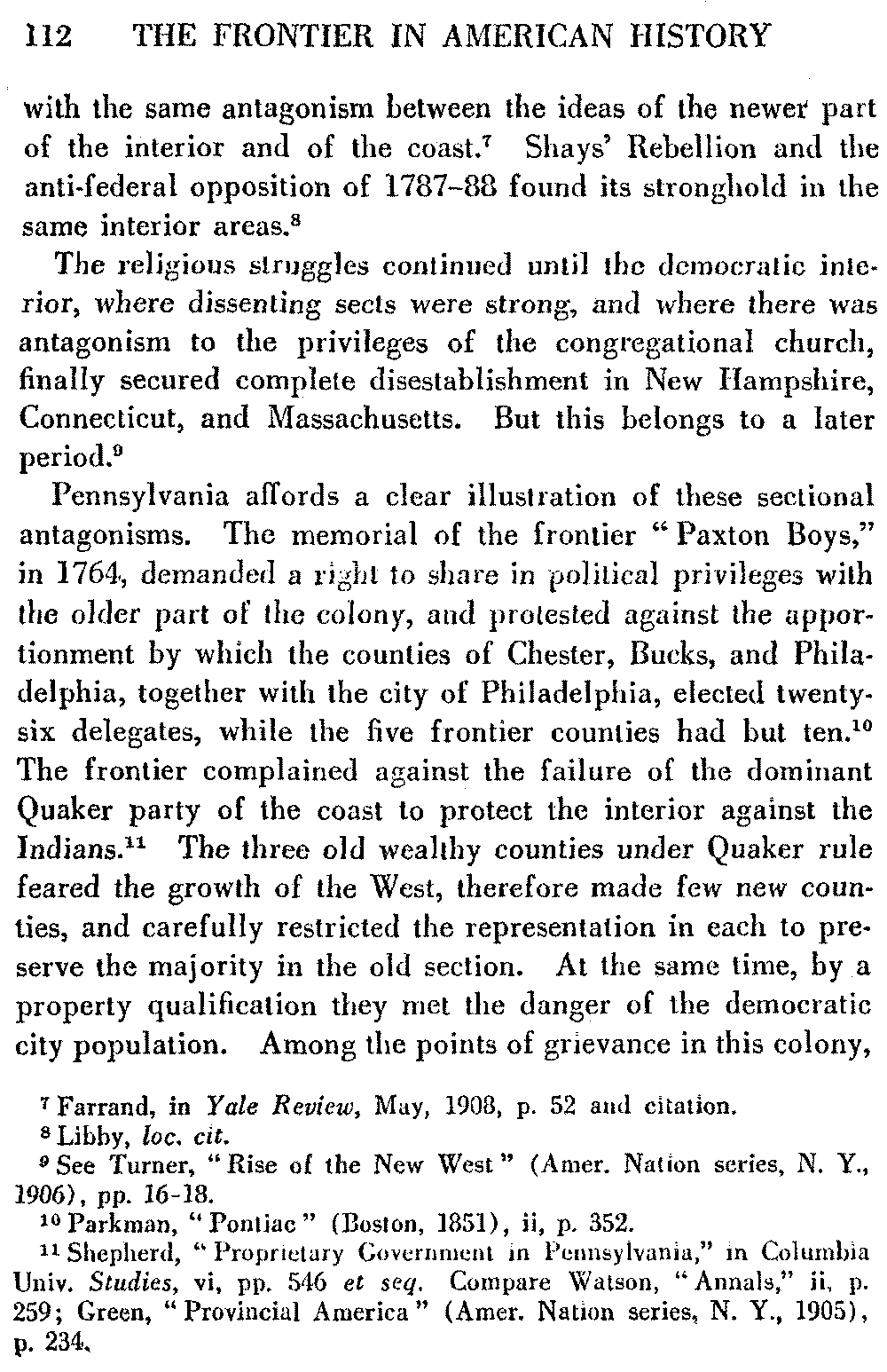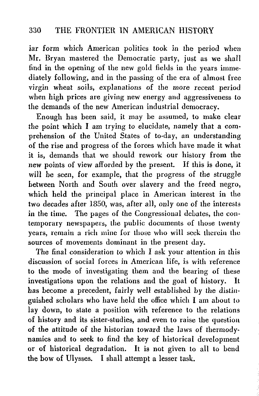 Each of these areas has had an influence in our economic and political history; the evolution of each into a higher stage has worked political transformations. But what constitutional historian has made any adequate attempt to interpret political facts by the light of these social areas and changes?[12:1]