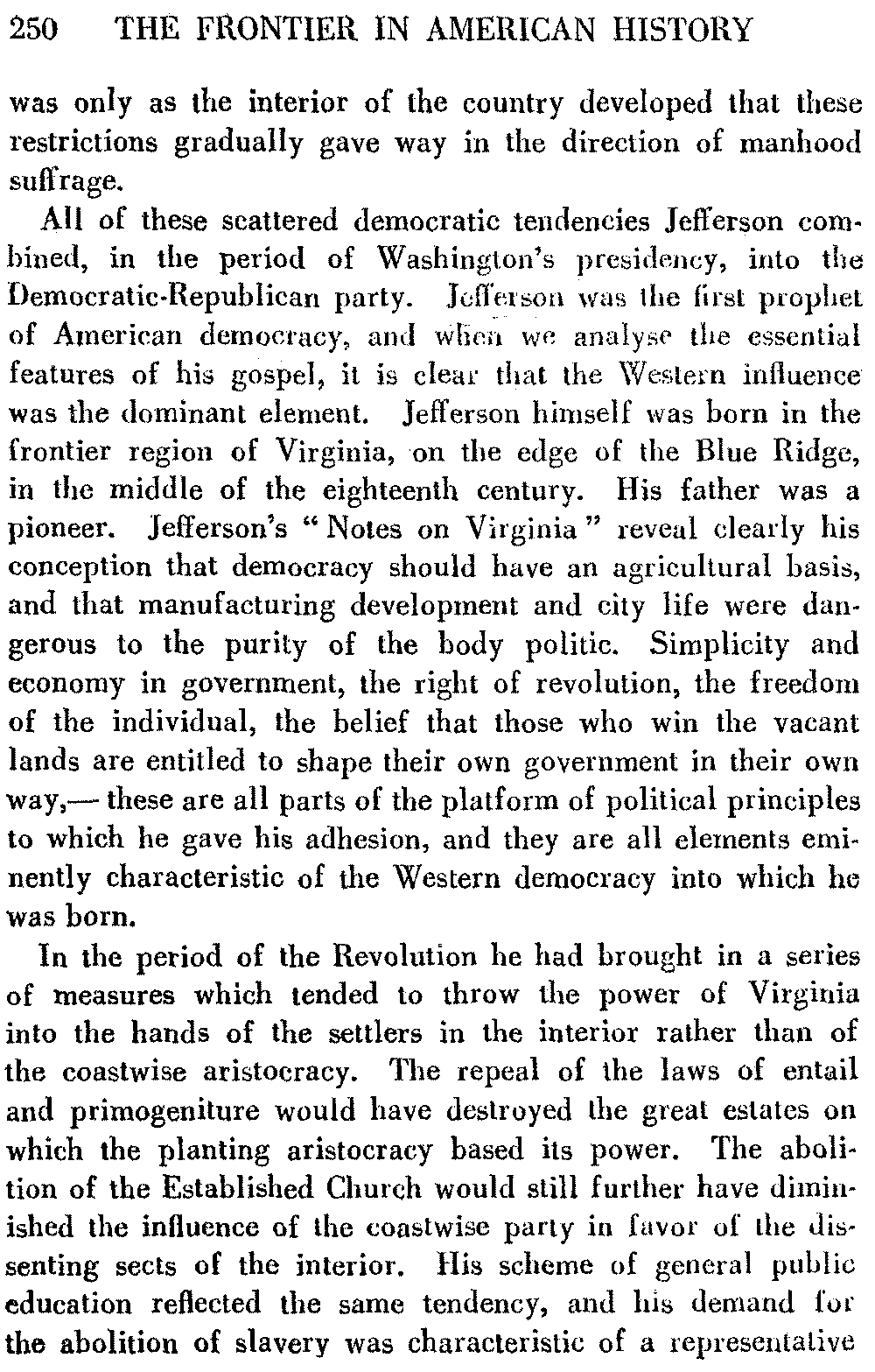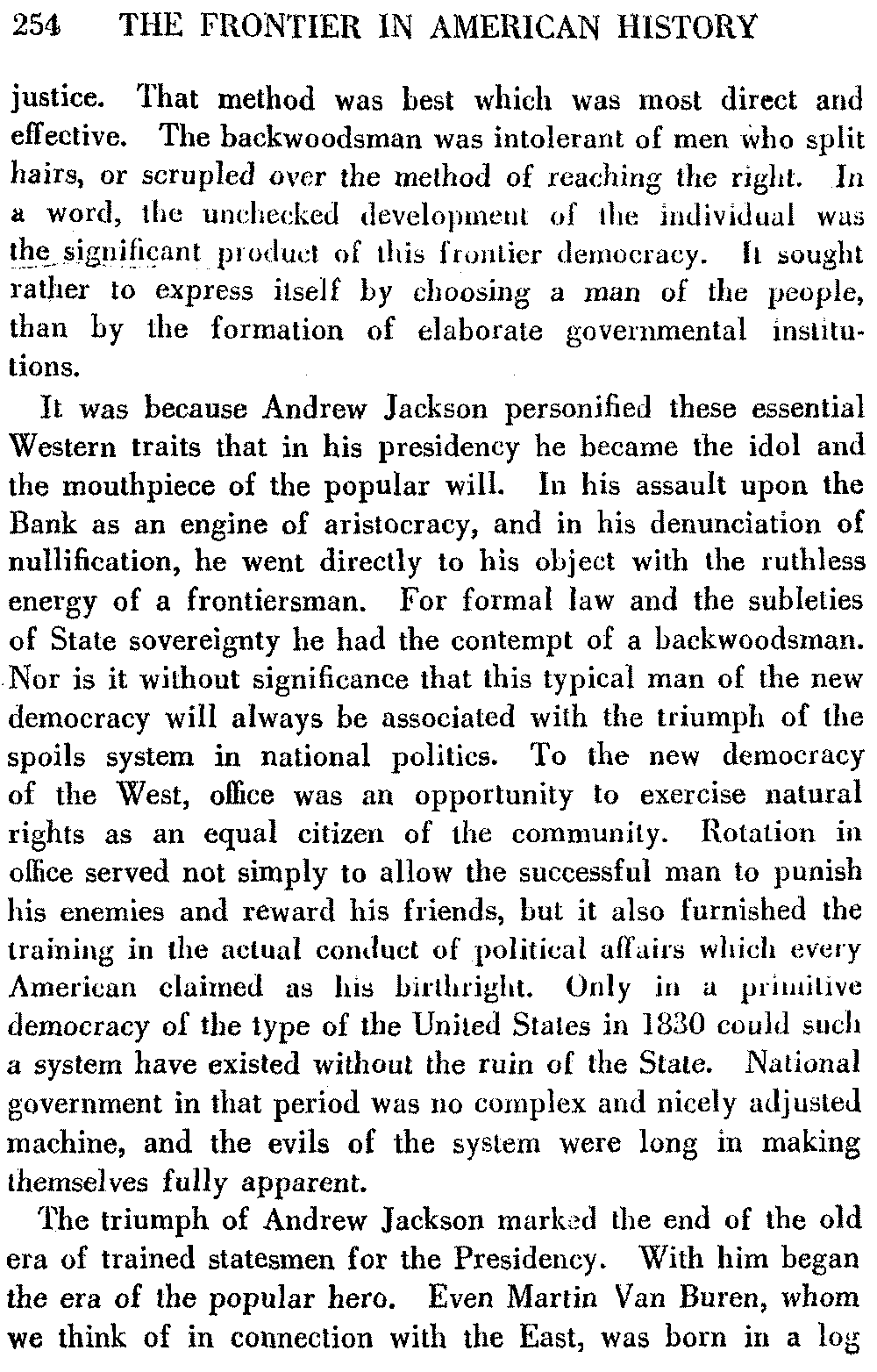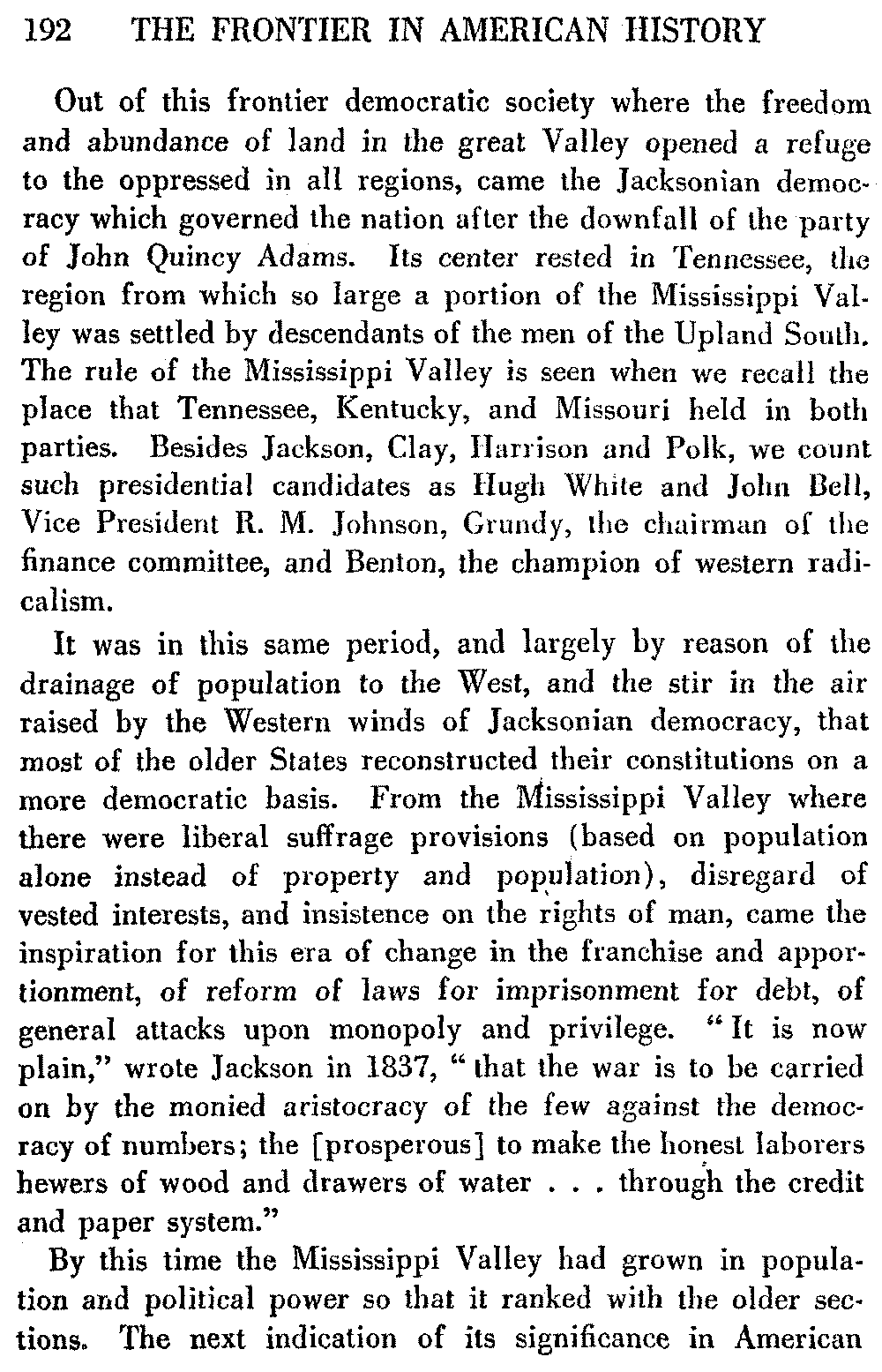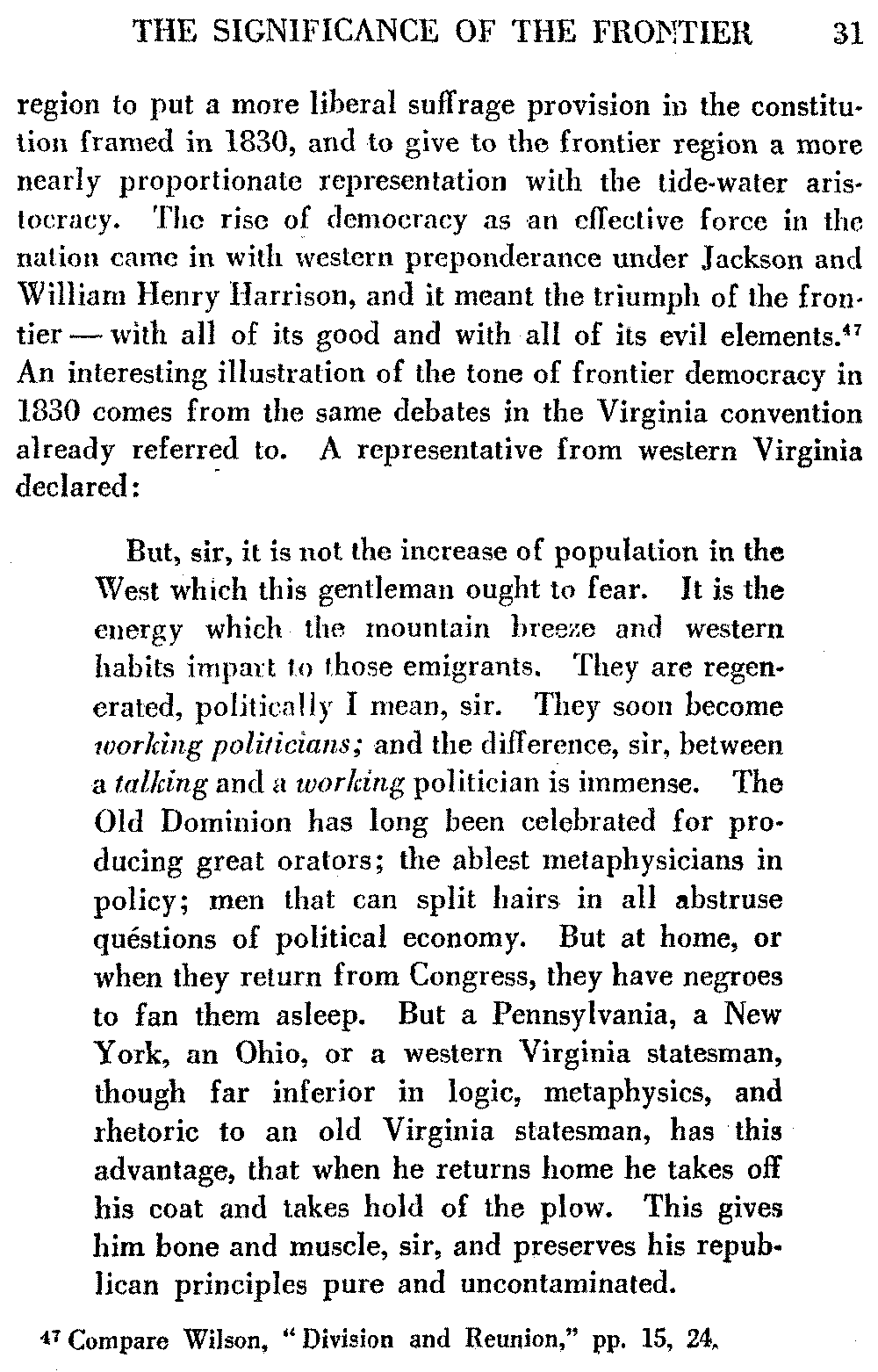 The frontier States that came into the Union in the first quarter of a century of its existence came in with democratic suffrage provisions, and had reactive effects of the highest importance upon the older States whose peoples were being attracted there. An extension of the franchise became essential. It was western New York that forced an extension of suffrage in the constitutional convention of that State in 1821; and it was western Virginia that compelled the tide-water [31]region to put a more liberal suffrage provision in the constitution framed in 1830, and to give to the frontier region a more nearly proportionate representation with the tide-water aristocracy. The rise of democracy as an effective force in the nation came in with western preponderance under Jackson and William Henry Harrison, and it meant the triumph of the frontier—with all of its good and with all of its evil elements.[31:1] An interesting illustration of the tone of frontier democracy in 1830 comes from the same debates in the Virginia convention already referred to. A representative from western Virginia declared: