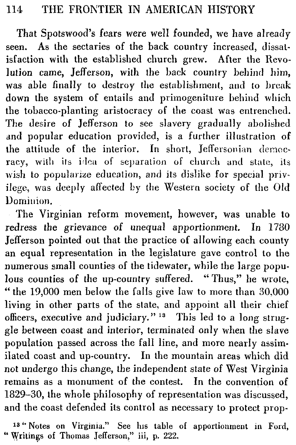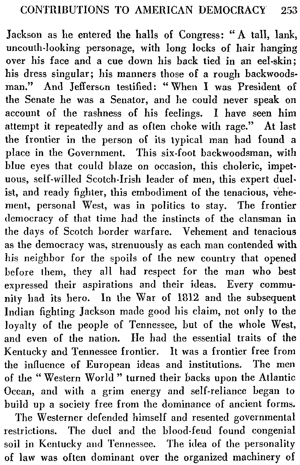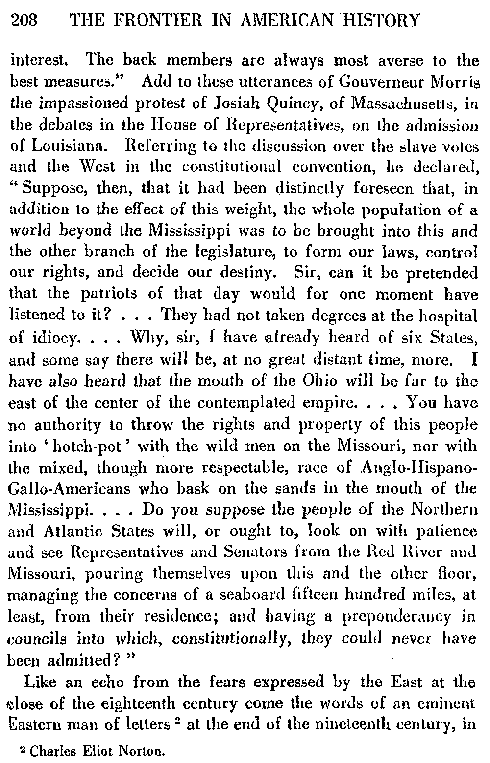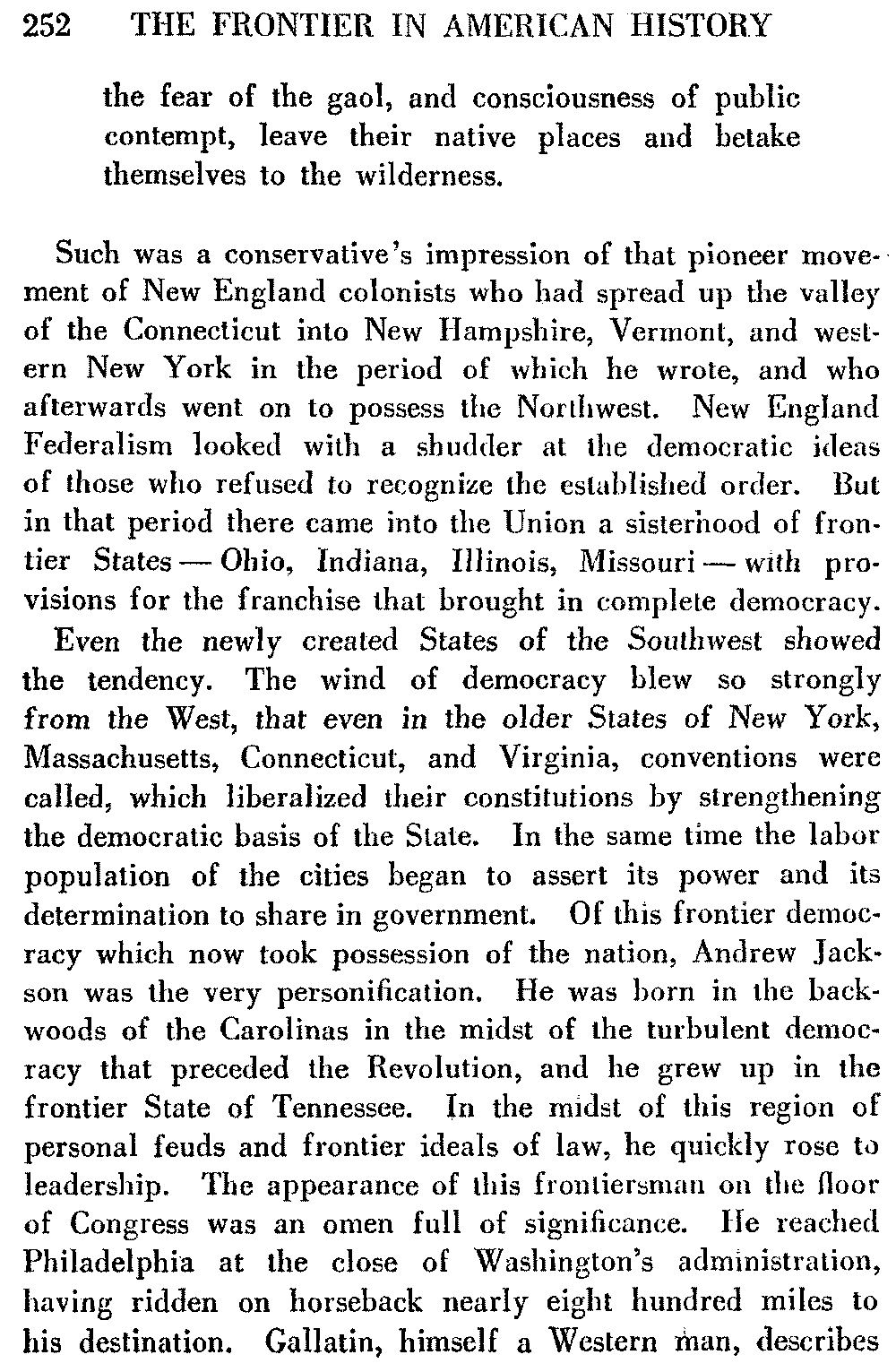 The frontier States that came into the Union in the first quarter of a century of its existence came in with democratic suffrage provisions, and had reactive effects of the highest importance upon the older States whose peoples were being attracted there. An extension of the franchise became essential. It was western New York that forced an extension of suffrage in the constitutional convention of that State in 1821; and it was western Virginia that compelled the tide-water [31]region to put a more liberal suffrage provision in the constitution framed in 1830, and to give to the frontier region a more nearly proportionate representation with the tide-water aristocracy. The rise of democracy as an effective force in the nation came in with western preponderance under Jackson and William Henry Harrison, and it meant the triumph of the frontier—with all of its good and with all of its evil elements.[31:1] An interesting illustration of the tone of frontier democracy in 1830 comes from the same debates in the Virginia convention already referred to. A representative from western Virginia declared: