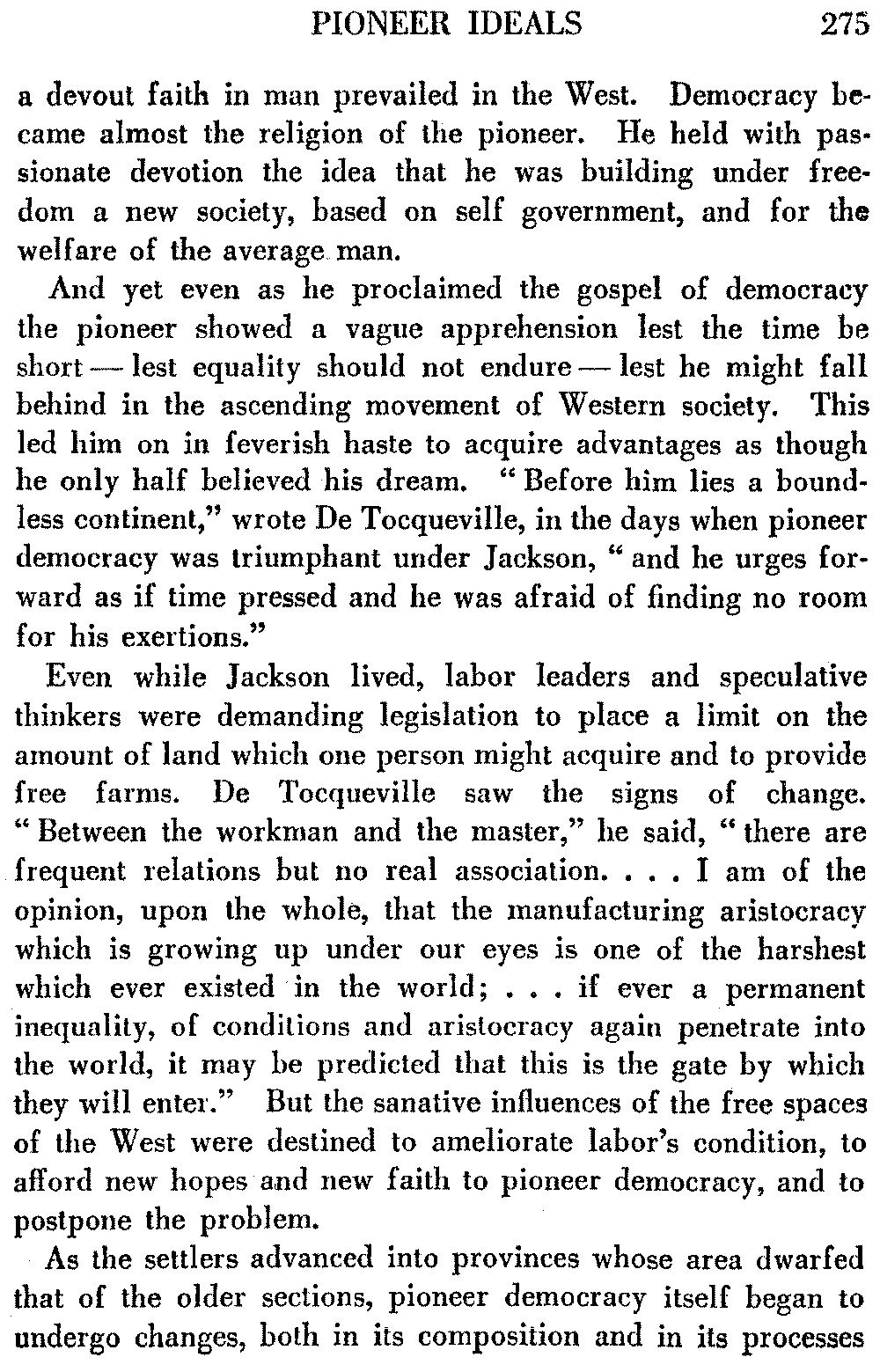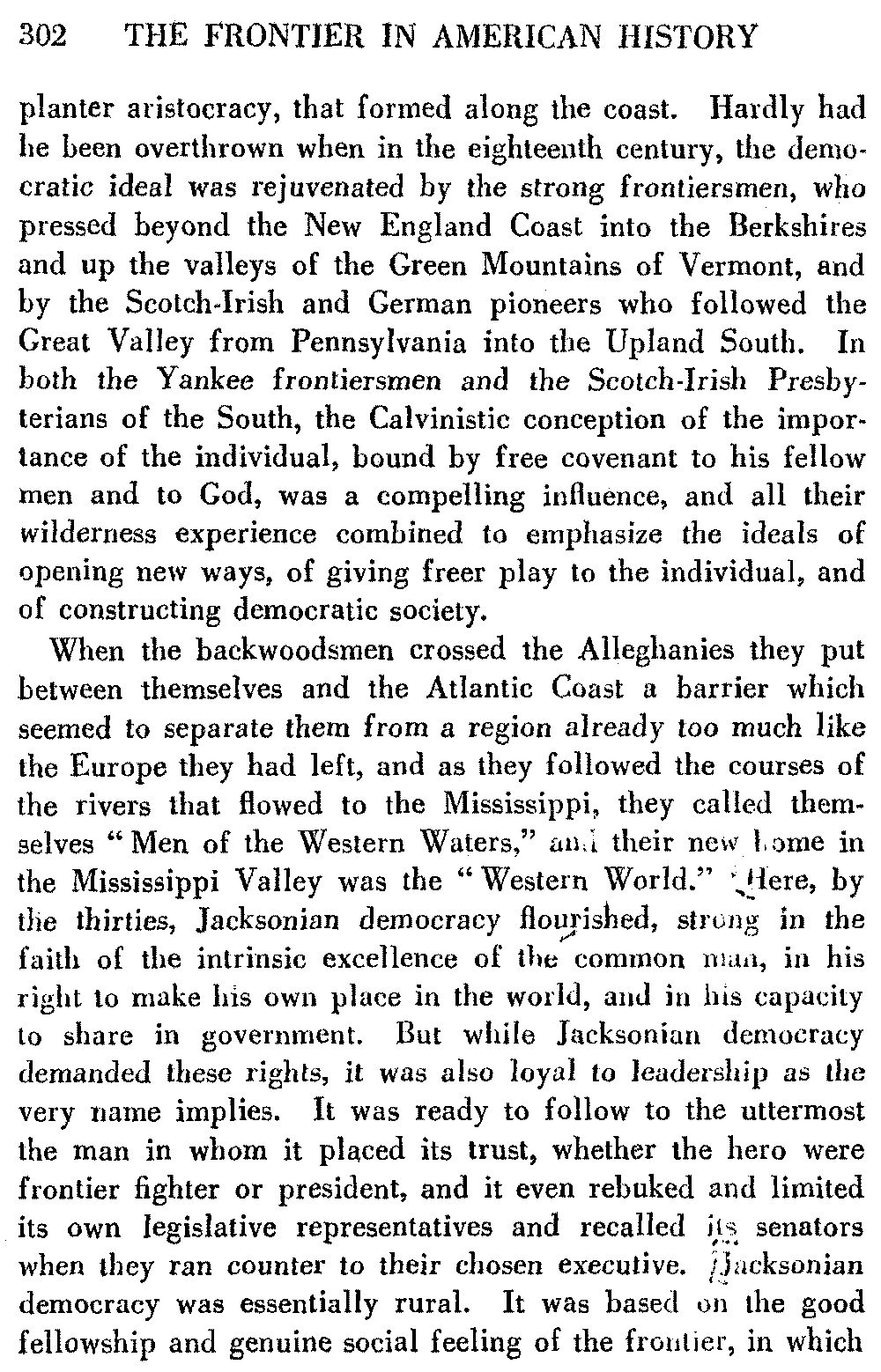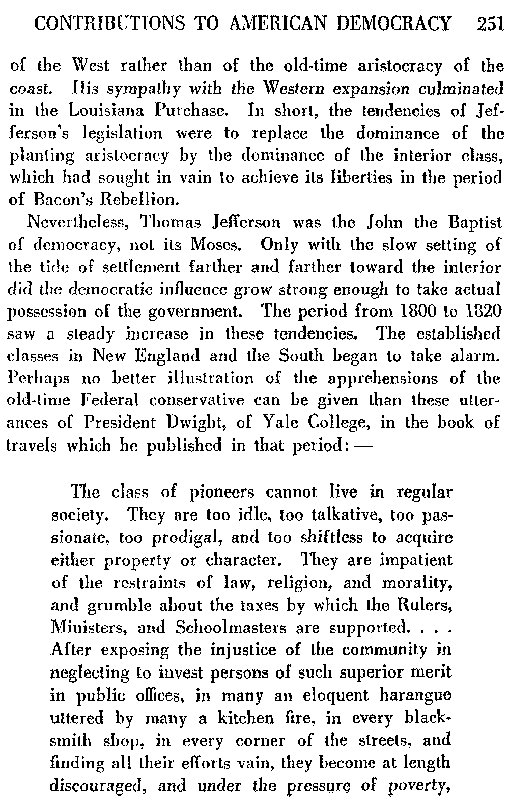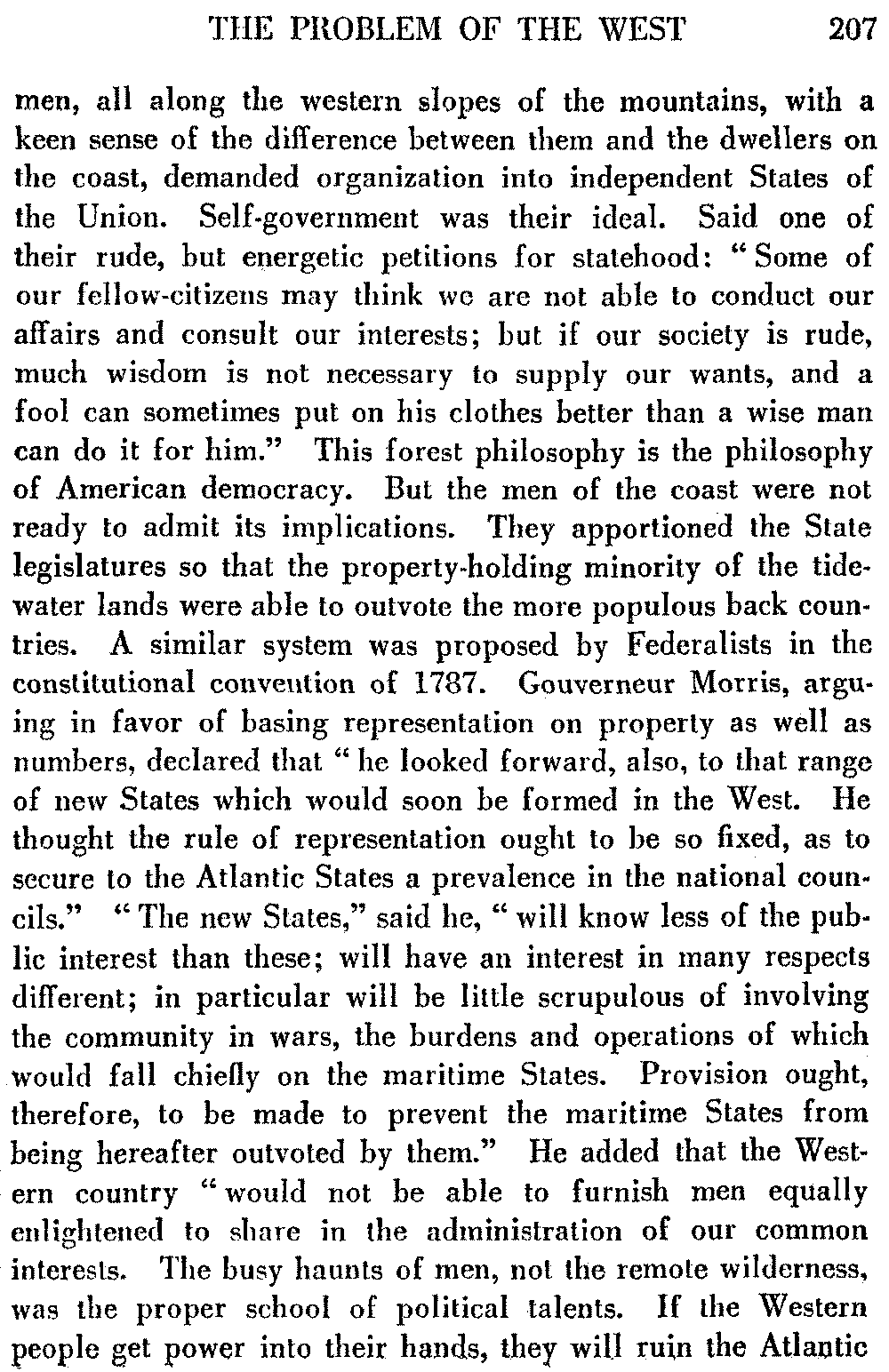 The frontier States that came into the Union in the first quarter of a century of its existence came in with democratic suffrage provisions, and had reactive effects of the highest importance upon the older States whose peoples were being attracted there. An extension of the franchise became essential. It was western New York that forced an extension of suffrage in the constitutional convention of that State in 1821; and it was western Virginia that compelled the tide-water [31]region to put a more liberal suffrage provision in the constitution framed in 1830, and to give to the frontier region a more nearly proportionate representation with the tide-water aristocracy. The rise of democracy as an effective force in the nation came in with western preponderance under Jackson and William Henry Harrison, and it meant the triumph of the frontier—with all of its good and with all of its evil elements.[31:1] An interesting illustration of the tone of frontier democracy in 1830 comes from the same debates in the Virginia convention already referred to. A representative from western Virginia declared: