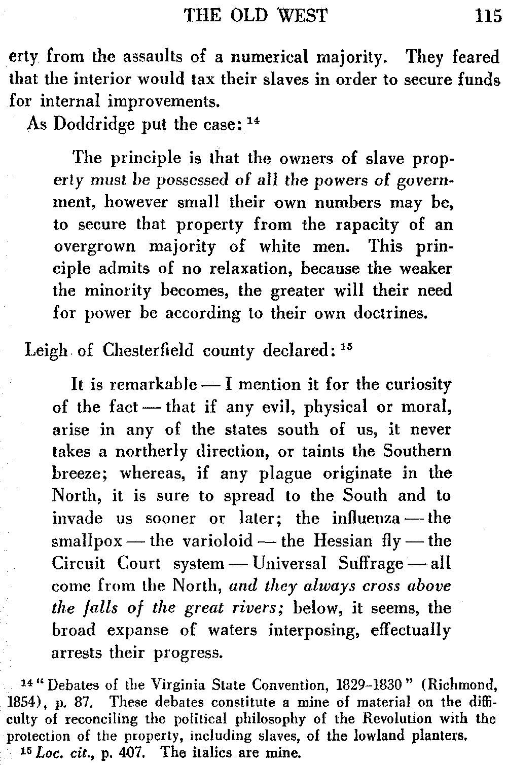 The spread of cotton culture into the interior of the South finally broke down the contrast between the "tide-water" region and the rest of the State, and based Southern interests on slavery. Before this process revealed its results the western portion of the South, which was akin to Pennsylvania in stock, society, and industry, showed tendencies to fall away from the faith of the fathers into internal improvement legislation and nationalism. In the Virginia convention of 1829-30, called to revise the constitution, Mr. Leigh, of Chesterfield, one of the tide-water counties, declared: