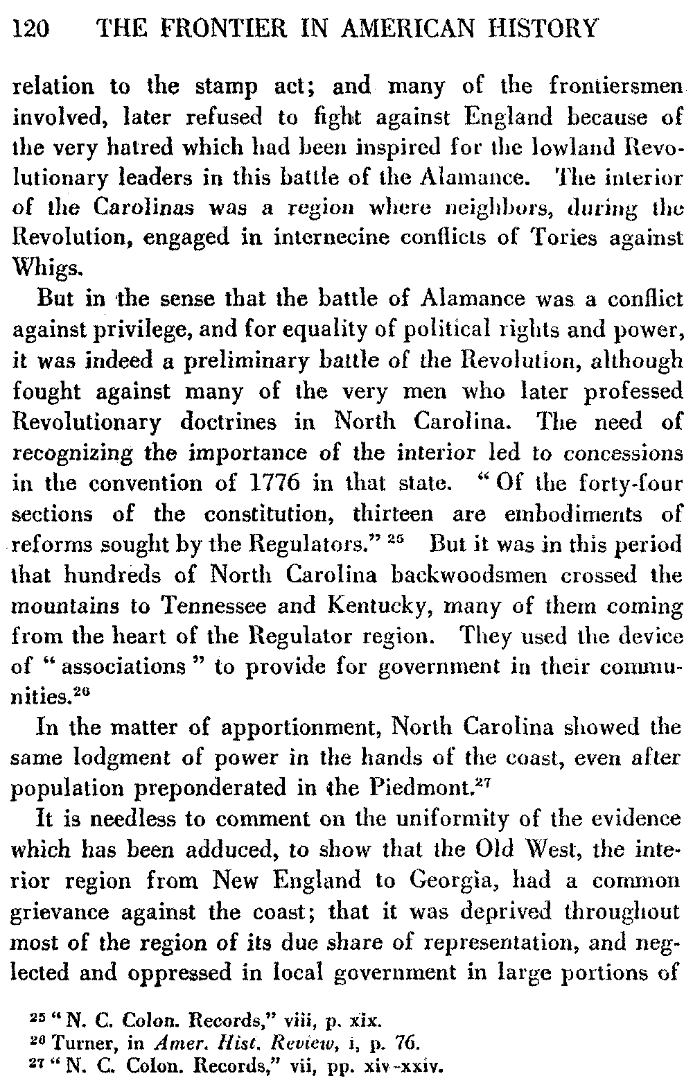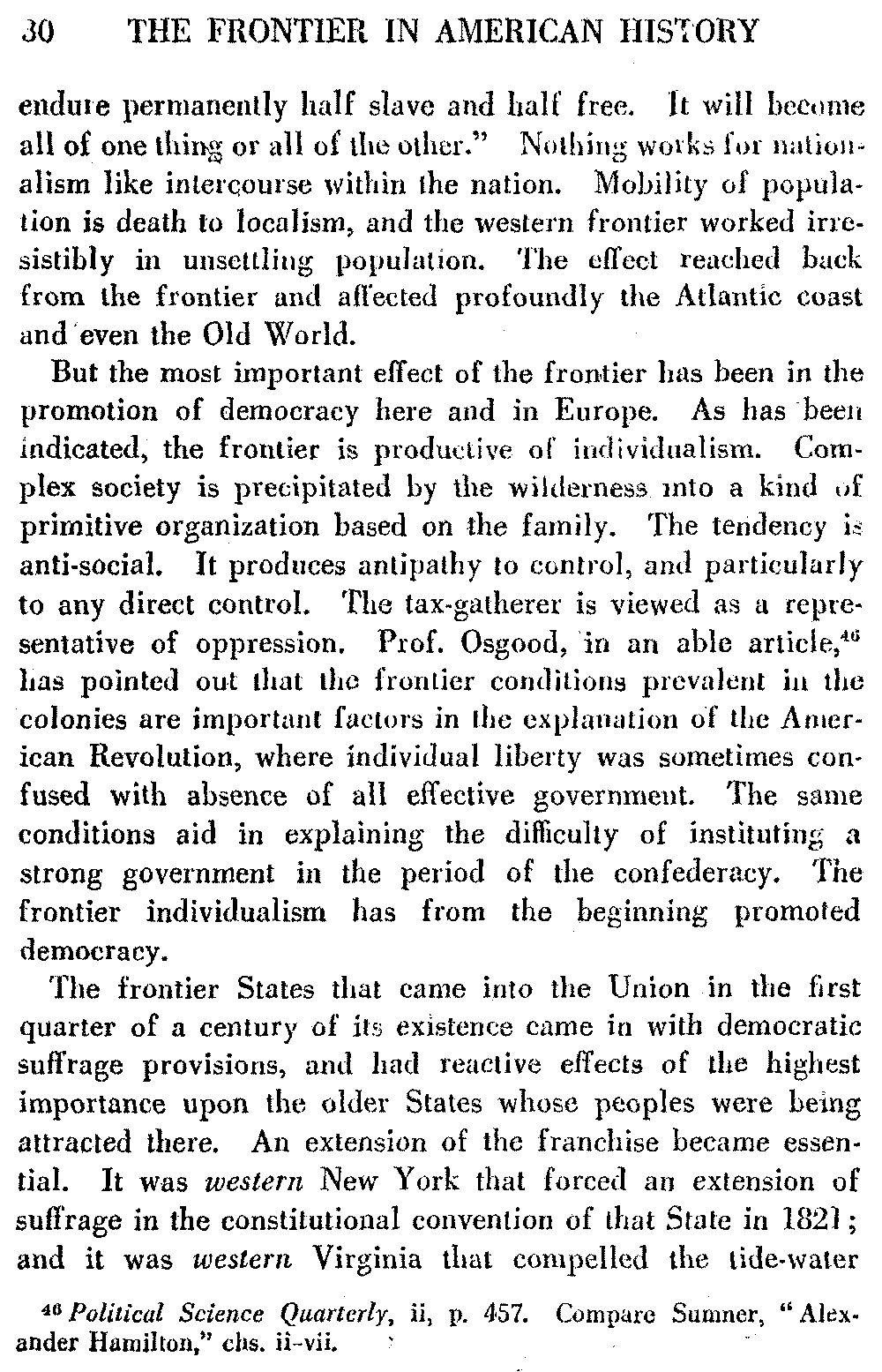 But the most important effect of the frontier has been in the promotion of democracy here and in Europe. As has been indicated, the frontier is productive of individualism. Complex society is precipitated by the wilderness into a kind of primitive organization based on the family. The tendency is anti-social. It produces antipathy to control, and particularly to any direct control. The tax-gatherer is viewed as a representative of oppression. Prof. Osgood, in an able article,[30:1] has pointed out that the frontier conditions prevalent in the colonies are important factors in the explanation of the American Revolution, where individual liberty was sometimes confused with absence of all effective government. The same conditions aid in explaining the difficulty of instituting a strong government in the period of the confederacy. The frontier individualism has from the beginning promoted democracy.