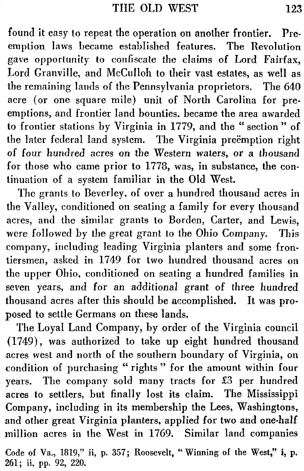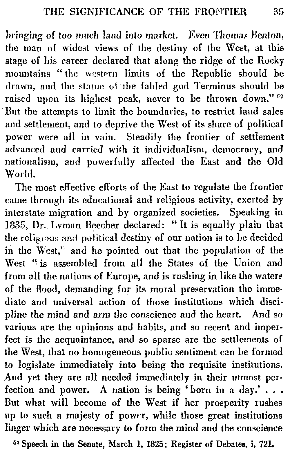 "No subject," said Henry Clay, "which has presented itself to the present, or perhaps any preceding, Congress, is of greater magnitude than that of the public lands." When we [27]consider the far-reaching effects of the government's land policy upon political, economic, and social aspects of American life, we are disposed to agree with him. But this legislation was framed under frontier influences, and under the lead of Western statesmen like Benton and Jackson. Said Senator Scott of Indiana in 1841: "I consider the preëmption law merely declaratory of the custom or common law of the settlers."