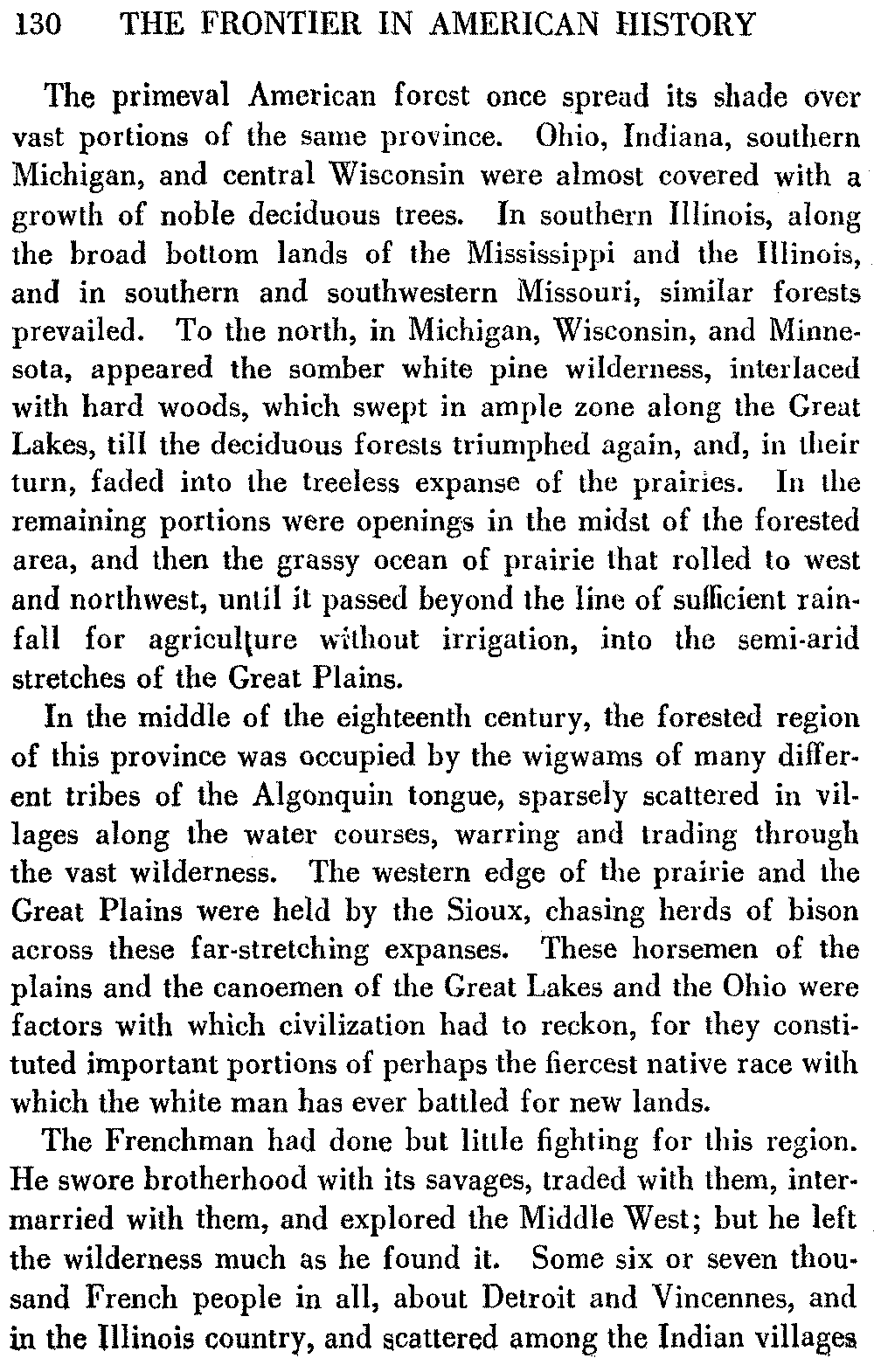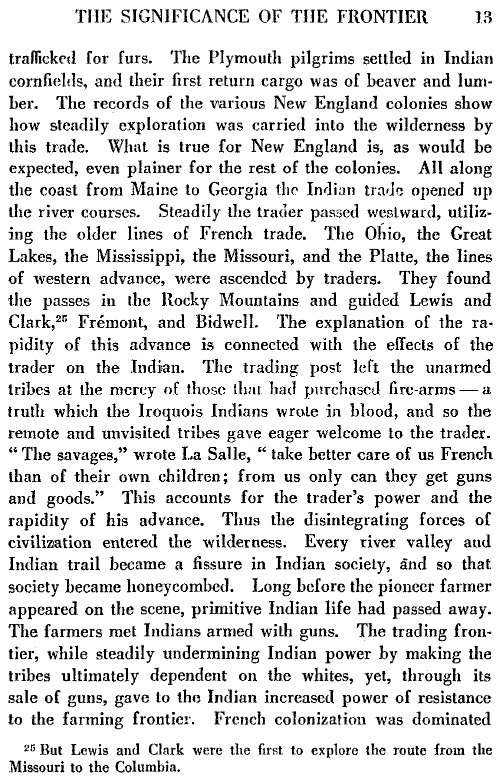 Why was it that the Indian trader passed so rapidly across the continent? What effects followed from the trader's frontier? The trade was coeval with American discovery. The Norsemen, Vespuccius, Verrazani, Hudson, John Smith, all [13]trafficked for furs. The Plymouth pilgrims settled in Indian cornfields, and their first return cargo was of beaver and lumber. The records of the various New England colonies show how steadily exploration was carried into the wilderness by this trade. What is true for New England is, as would be expected, even plainer for the rest of the colonies. All along the coast from Maine to Georgia the Indian trade opened up the river courses. Steadily the trader passed westward, utilizing the older lines of French trade. The Ohio, the Great Lakes, the Mississippi, the Missouri, and the Platte, the lines of western advance, were ascended by traders. They found the passes in the Rocky Mountains and guided Lewis and Clark,[13:1] Frémont, and Bidwell. The explanation of the rapidity of this advance is connected with the effects of the trader on the Indian. The trading post left the unarmed tribes at the mercy of those that had purchased fire-arms—a truth which the Iroquois Indians wrote in blood, and so the remote and unvisited tribes gave eager welcome to the trader. "The savages," wrote La Salle, "take better care of us French than of their own children; from us only can they get guns and goods." This accounts for the trader's power and the rapidity of his advance. Thus the disintegrating forces of civilization entered the wilderness. Every river valley and Indian trail became a fissure in Indian society, and so that society became honeycombed. Long before the pioneer farmer appeared on the scene, primitive Indian life had passed away. The farmers met Indians armed with guns. The trading frontier, while steadily undermining Indian power by making the tribes ultimately dependent on the whites, yet, through its sale of guns, gave to the Indian increased power of resistance to the farming frontier. French colonization was dominated [14]by its trading frontier; English colonization by its farming frontier. There was an antagonism between the two frontiers as between the two nations. Said Duquesne to the Iroquois, "Are you ignorant of the difference between the king of England and the king of France? Go see the forts that our king has established and you will see that you can still hunt under their very walls. They have been placed for your advantage in places which you frequent. The English, on the contrary, are no sooner in possession of a place than the game is driven away. The forest falls before them as they advance, and the soil is laid bare so that you can scarce find the wherewithal to erect a shelter for the night."