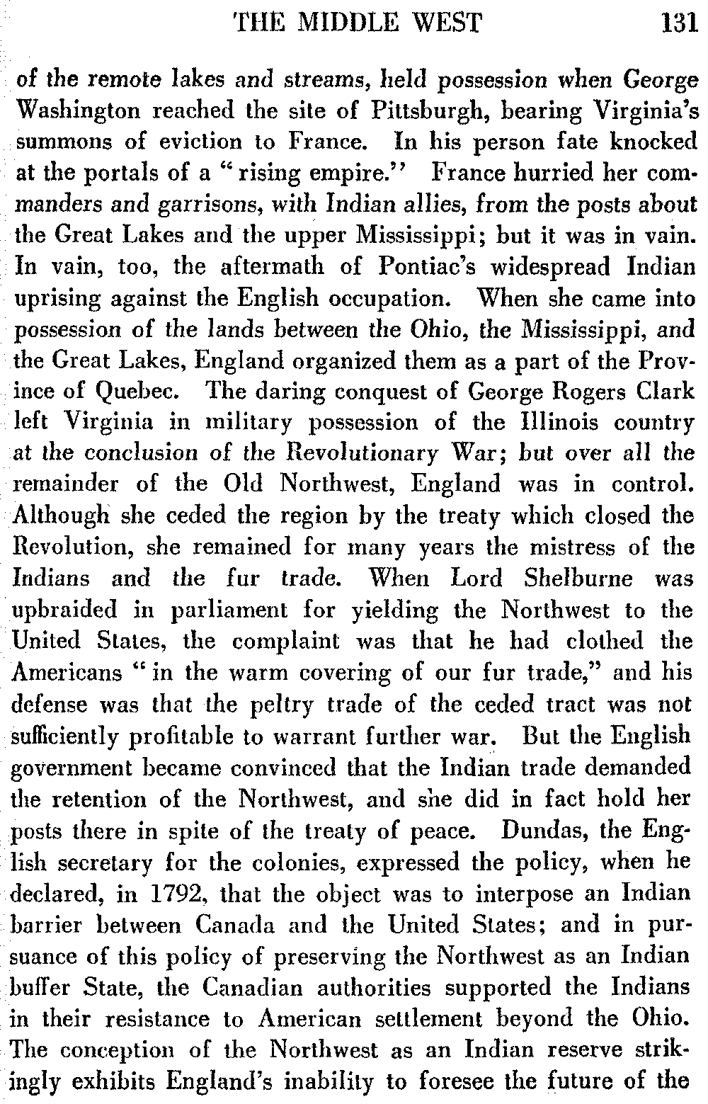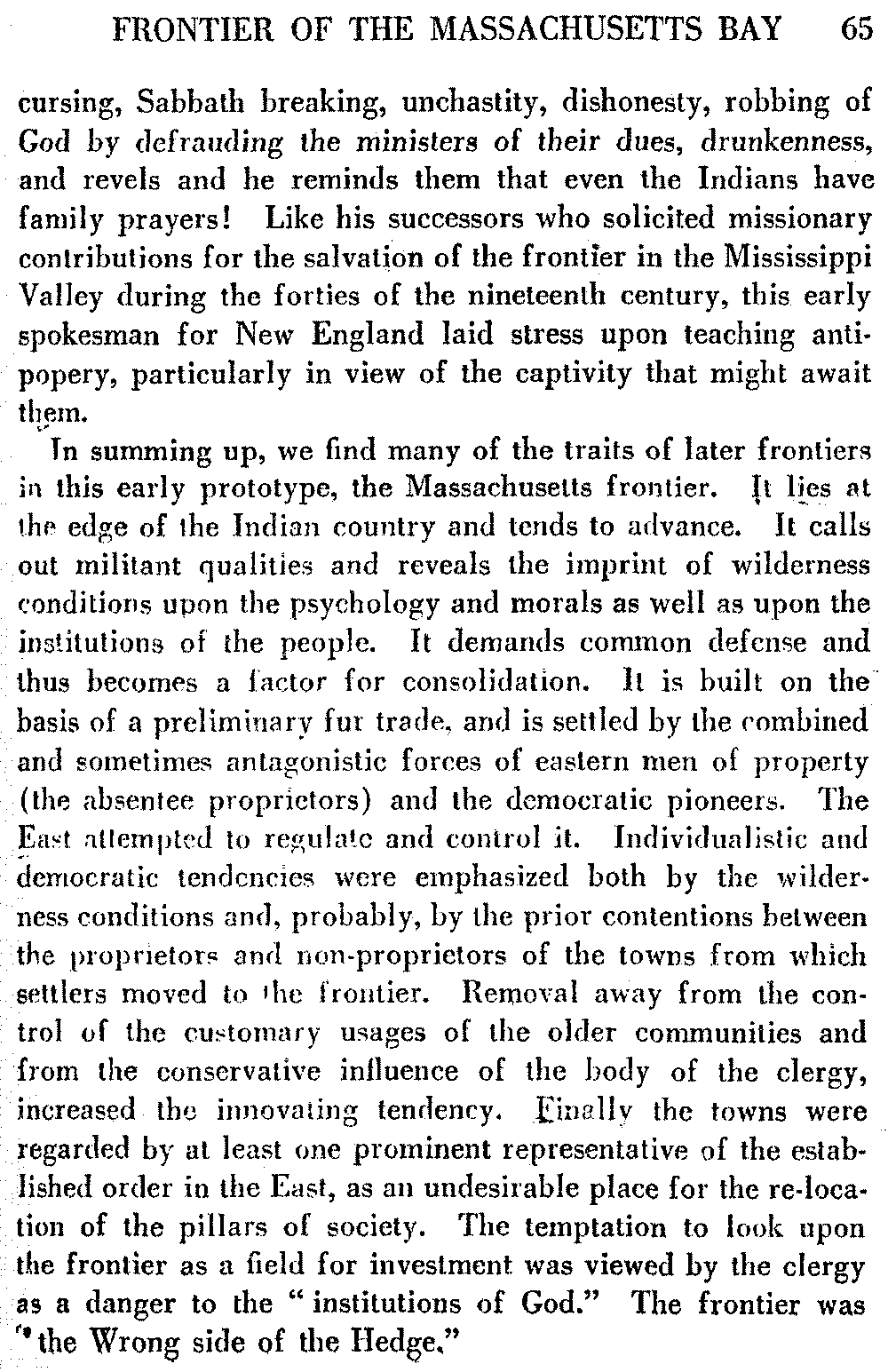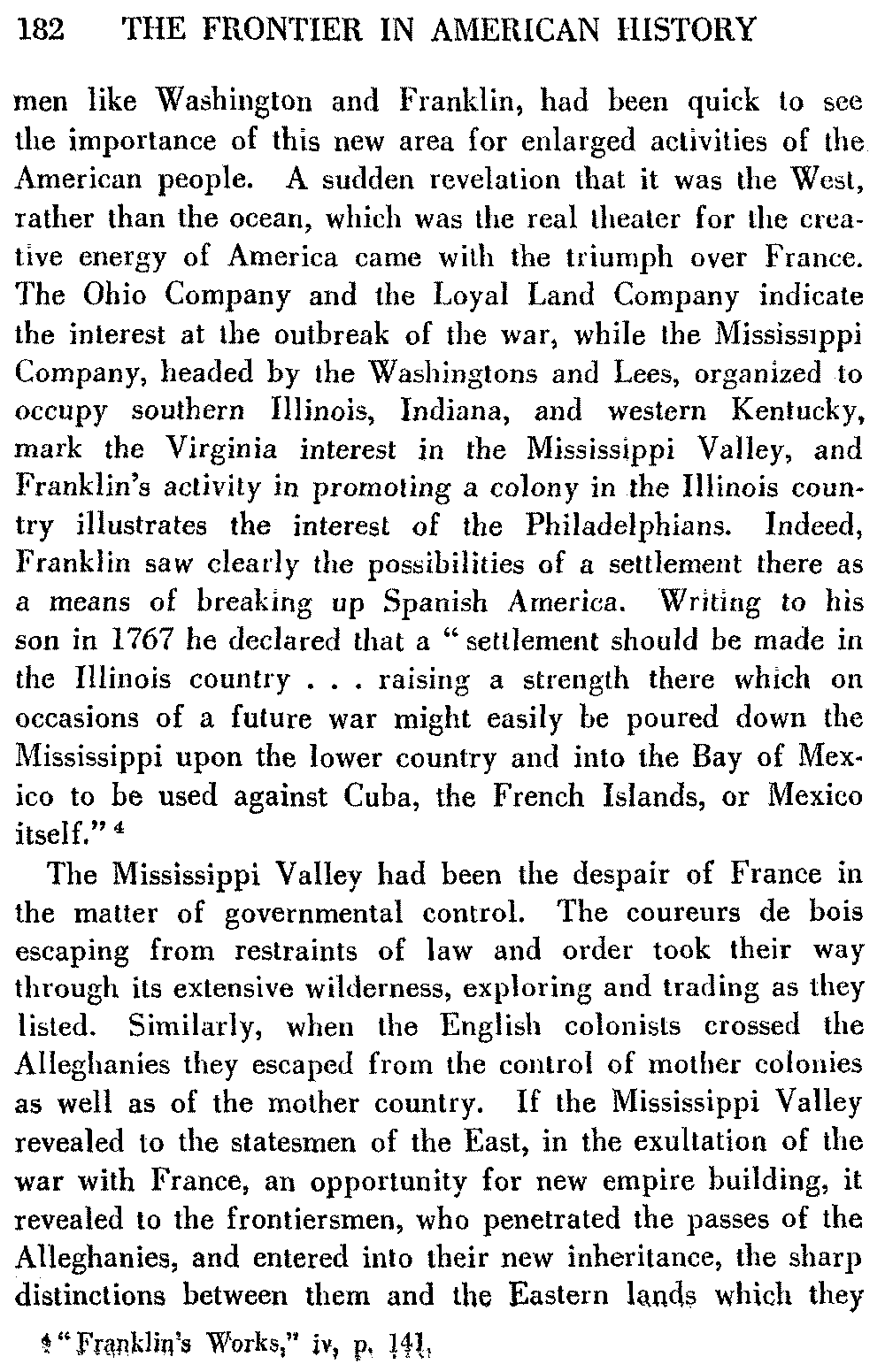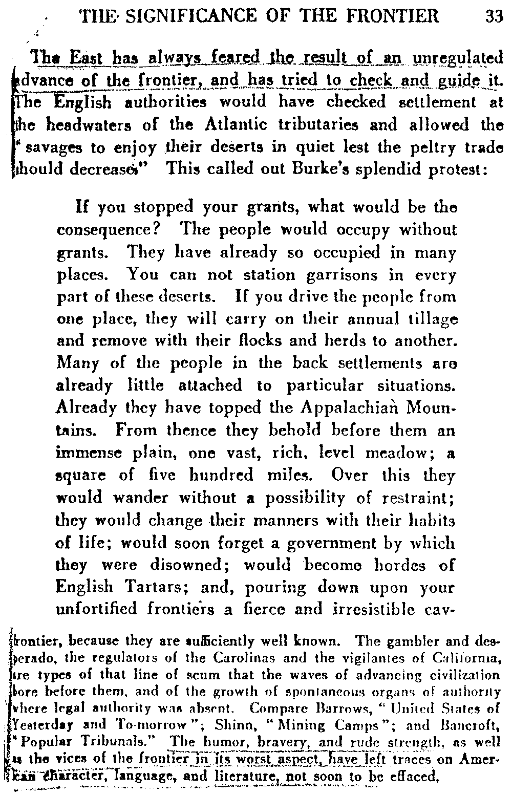 The East has always feared the result of an unregulated advance of the frontier, and has tried to check and guide it. The English authorities would have checked settlement at the headwaters of the Atlantic tributaries and allowed the "savages to enjoy their deserts in quiet lest the peltry trade should decrease." This called out Burke's splendid protest:
