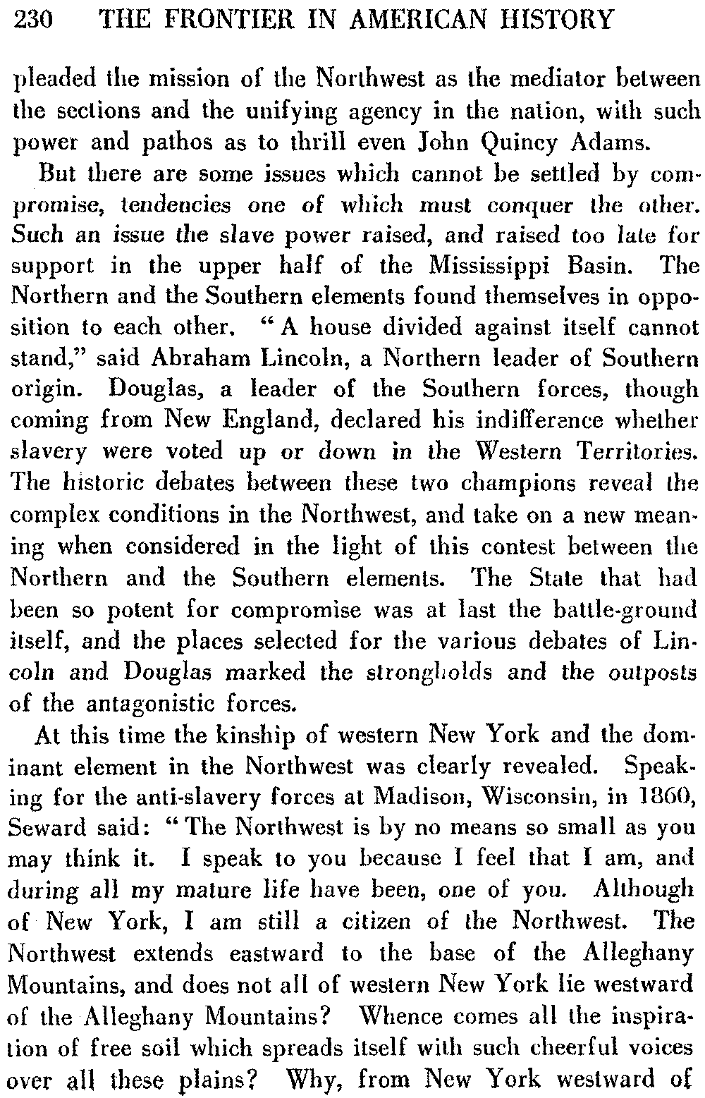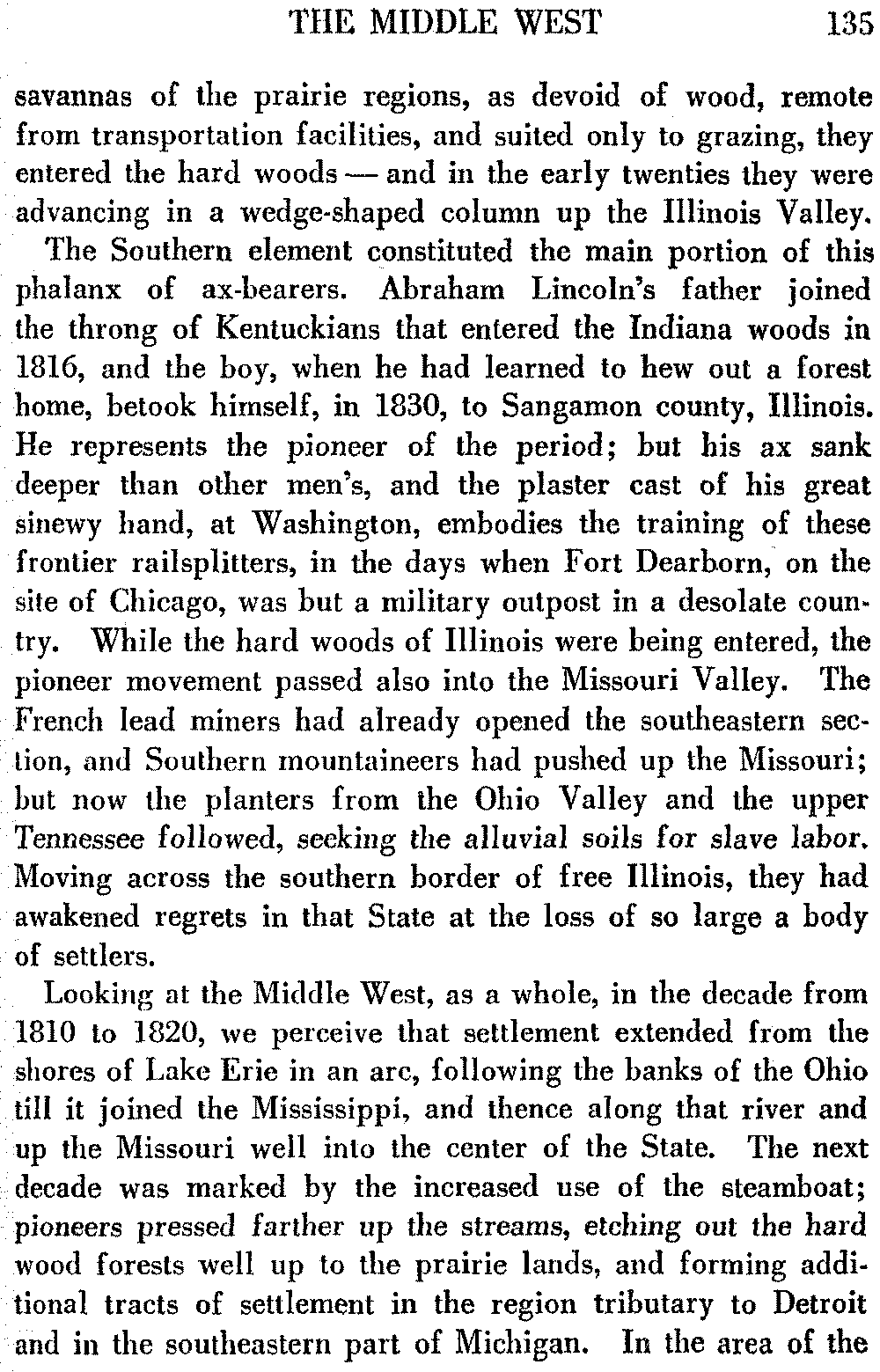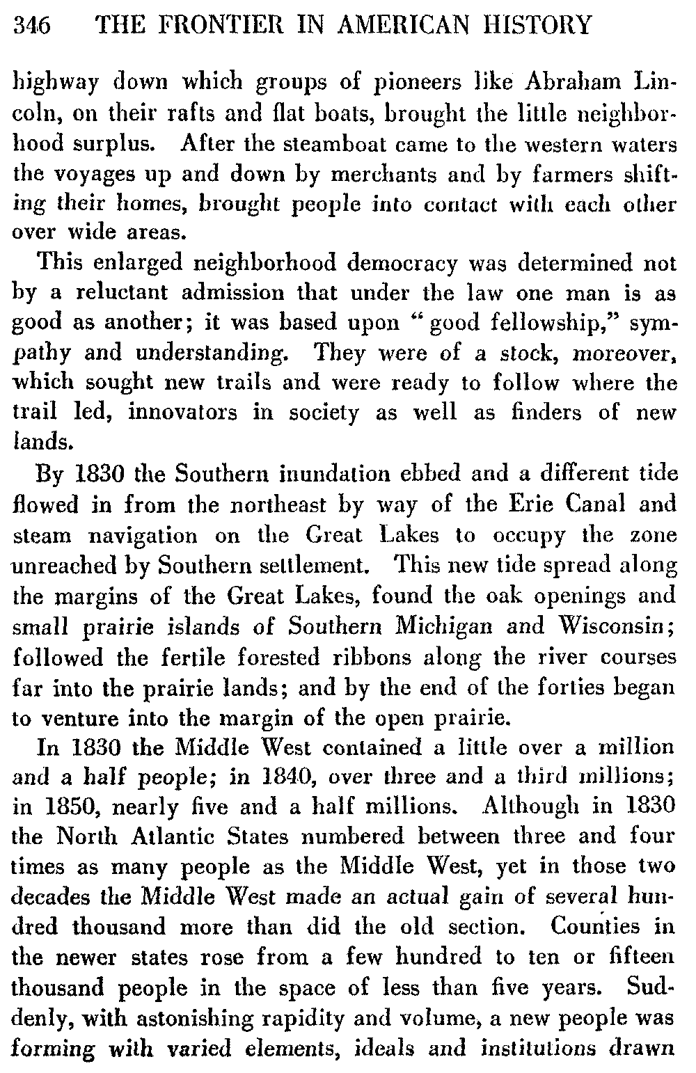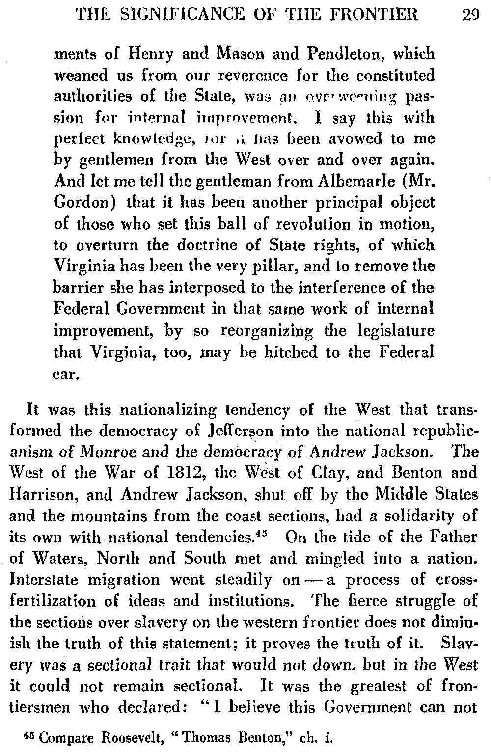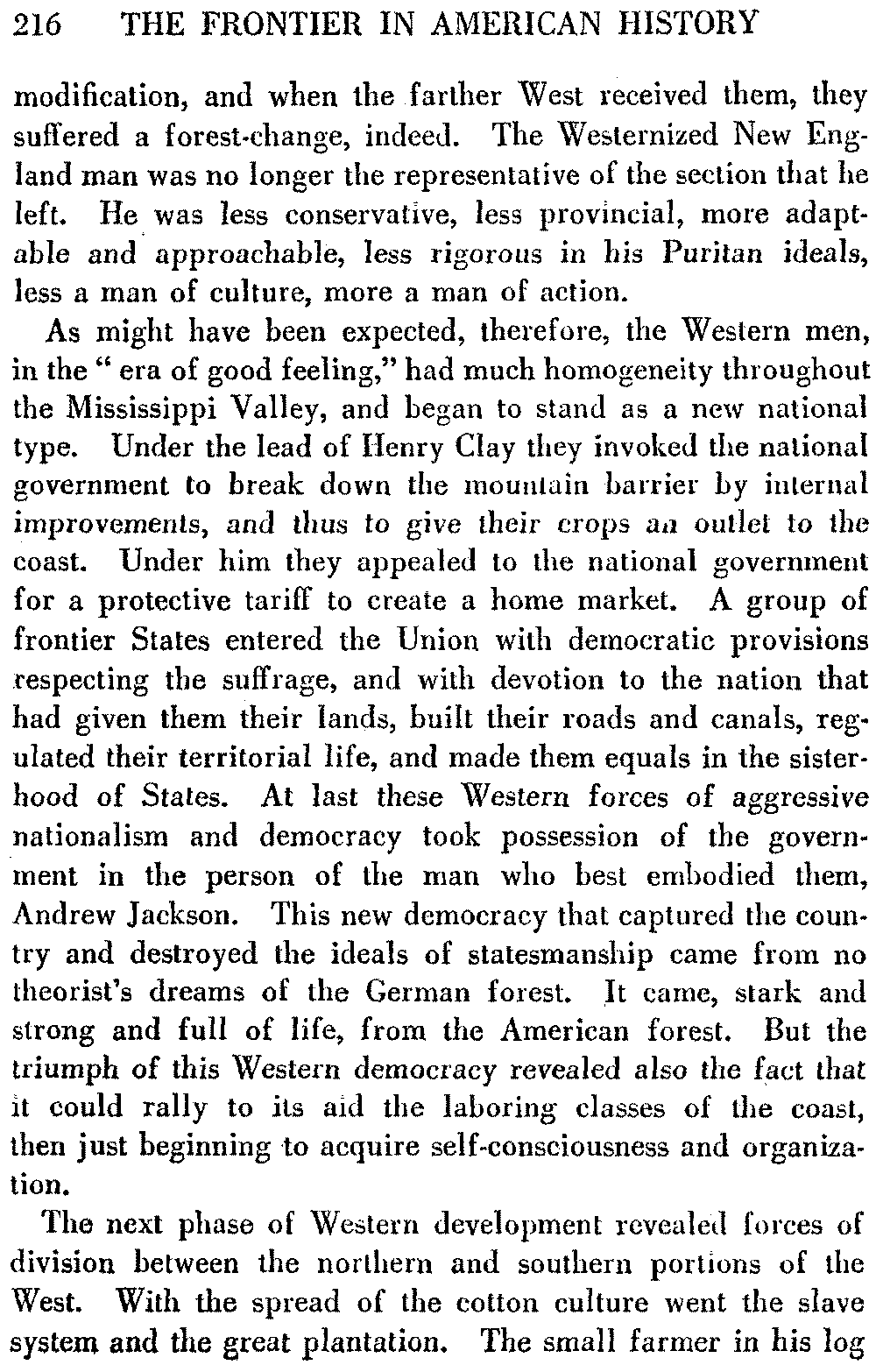 It was this nationalizing tendency of the West that transformed the democracy of Jefferson into the national republicanism of Monroe and the democracy of Andrew Jackson. The West of the War of 1812, the West of Clay, and Benton and Harrison, and Andrew Jackson, shut off by the Middle States and the mountains from the coast sections, had a solidarity of its own with national tendencies.[29:1] On the tide of the Father of Waters, North and South met and mingled into a nation. Interstate migration went steadily on—a process of cross-fertilization of ideas and institutions. The fierce struggle of the sections over slavery on the western frontier does not diminish the truth of this statement; it proves the truth of it. Slavery was a sectional trait that would not down, but in the West it could not remain sectional. It was the greatest of frontiersmen who declared: "I believe this Government can not [30]endure permanently half slave and half free. It will become all of one thing or all of the other." Nothing works for nationalism like intercourse within the nation. Mobility of population is death to localism, and the western frontier worked irresistibly in unsettling population. The effect reached back from the frontier and affected profoundly the Atlantic coast and even the Old World.