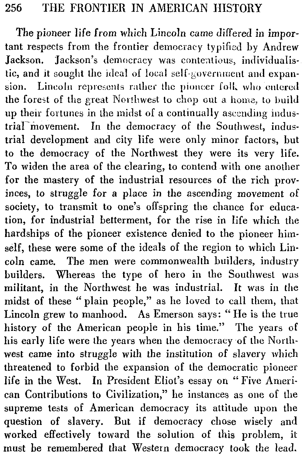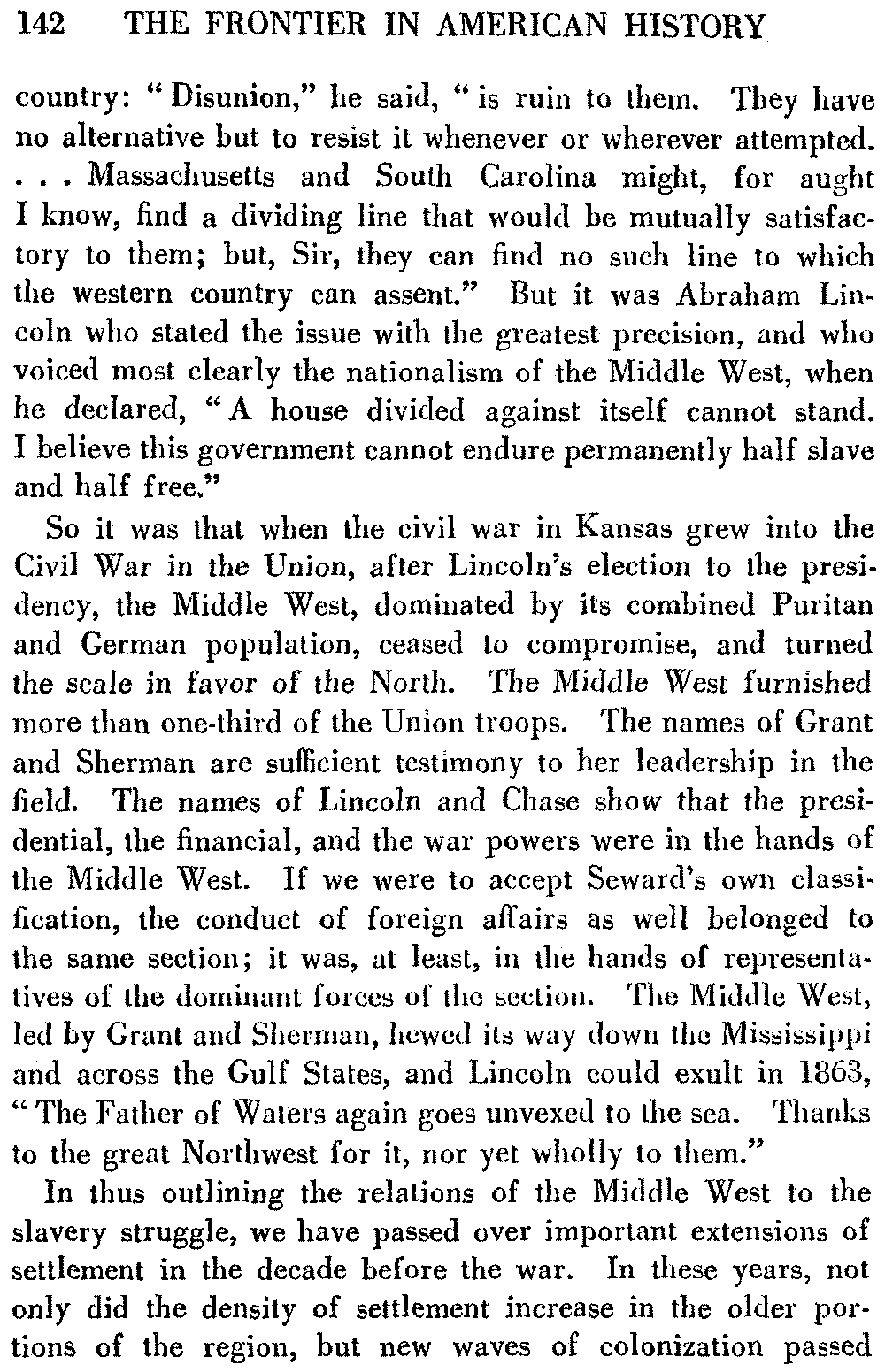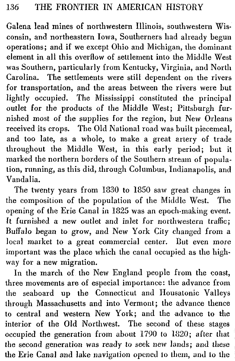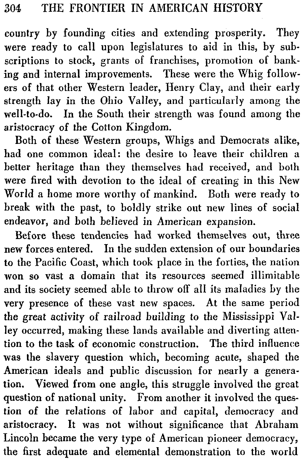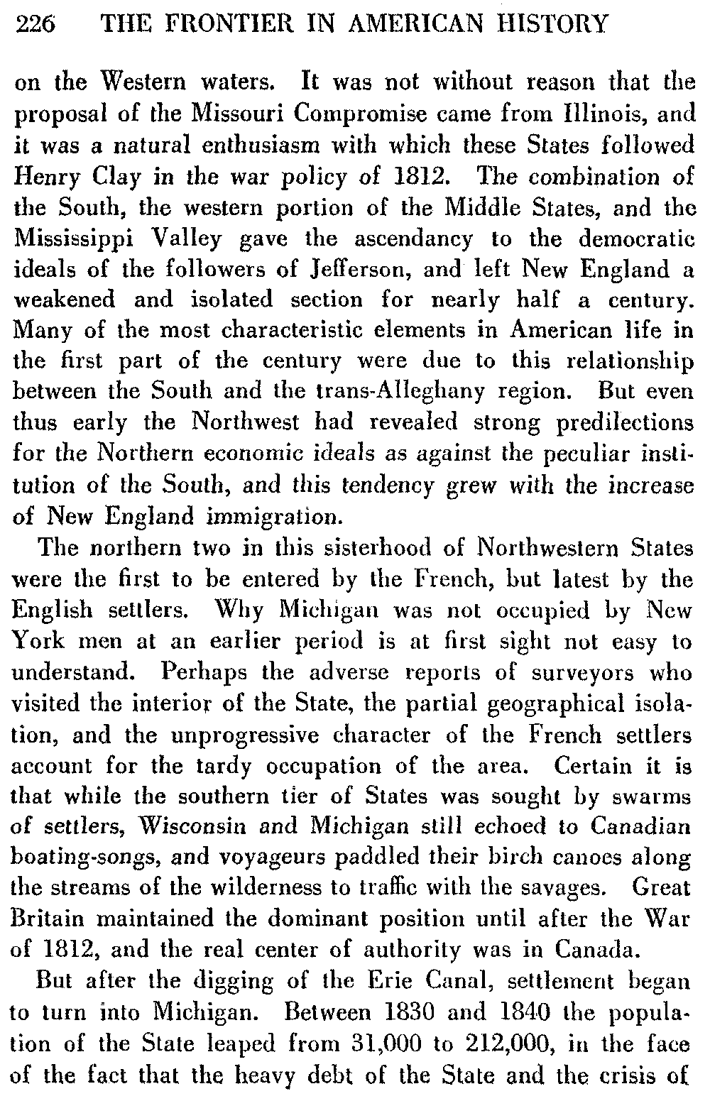 It was this nationalizing tendency of the West that transformed the democracy of Jefferson into the national republicanism of Monroe and the democracy of Andrew Jackson. The West of the War of 1812, the West of Clay, and Benton and Harrison, and Andrew Jackson, shut off by the Middle States and the mountains from the coast sections, had a solidarity of its own with national tendencies.[29:1] On the tide of the Father of Waters, North and South met and mingled into a nation. Interstate migration went steadily on—a process of cross-fertilization of ideas and institutions. The fierce struggle of the sections over slavery on the western frontier does not diminish the truth of this statement; it proves the truth of it. Slavery was a sectional trait that would not down, but in the West it could not remain sectional. It was the greatest of frontiersmen who declared: "I believe this Government can not [30]endure permanently half slave and half free. It will become all of one thing or all of the other." Nothing works for nationalism like intercourse within the nation. Mobility of population is death to localism, and the western frontier worked irresistibly in unsettling population. The effect reached back from the frontier and affected profoundly the Atlantic coast and even the Old World.