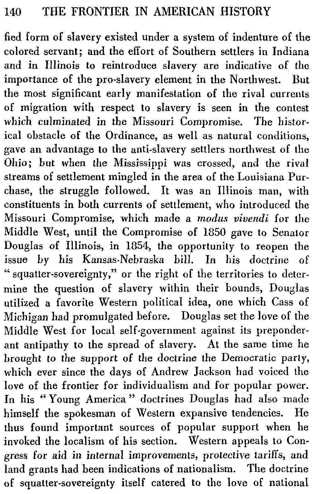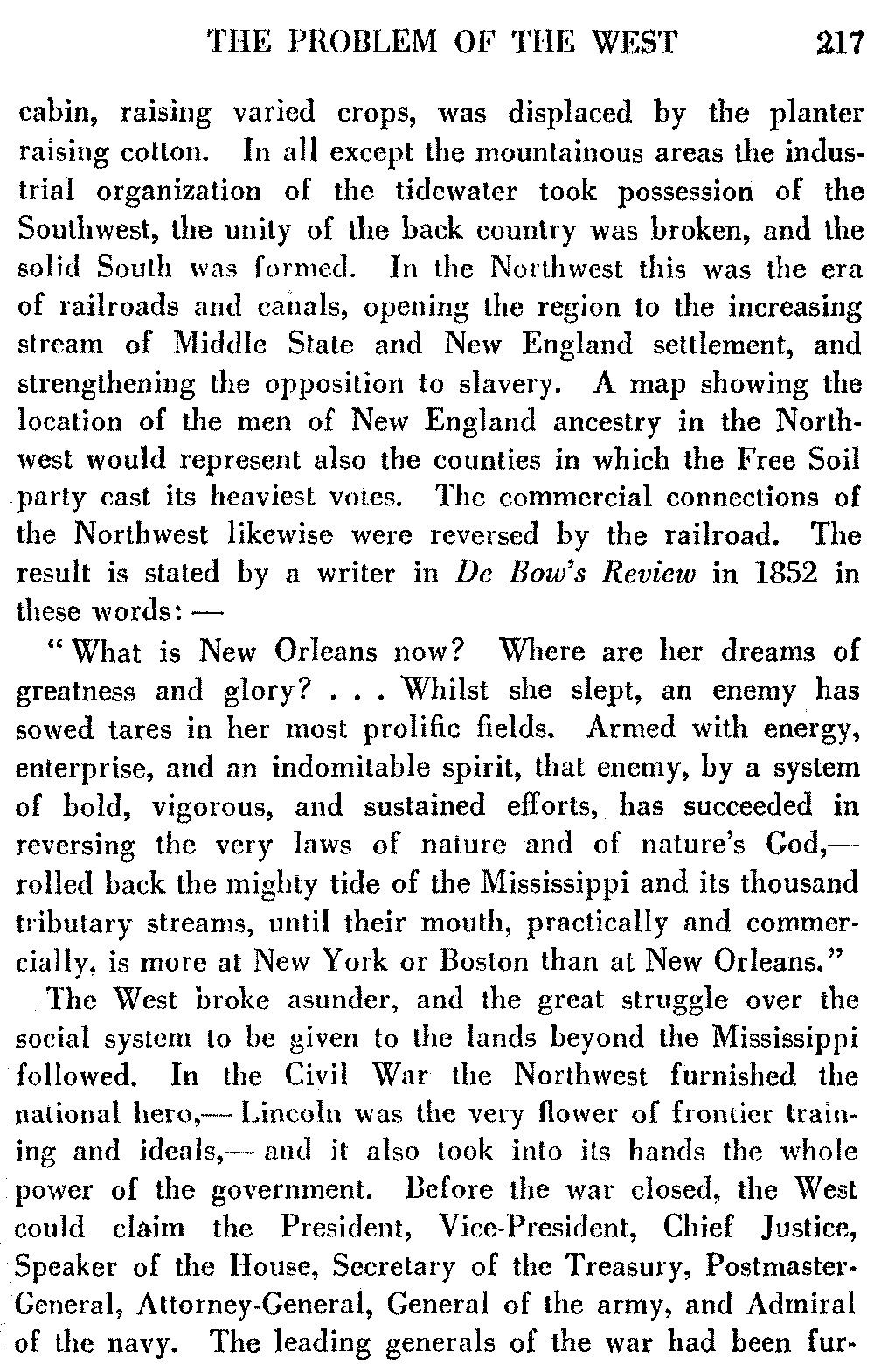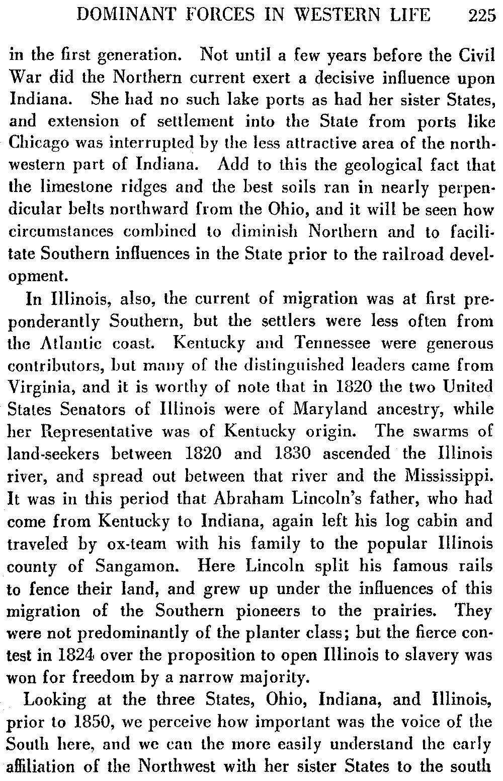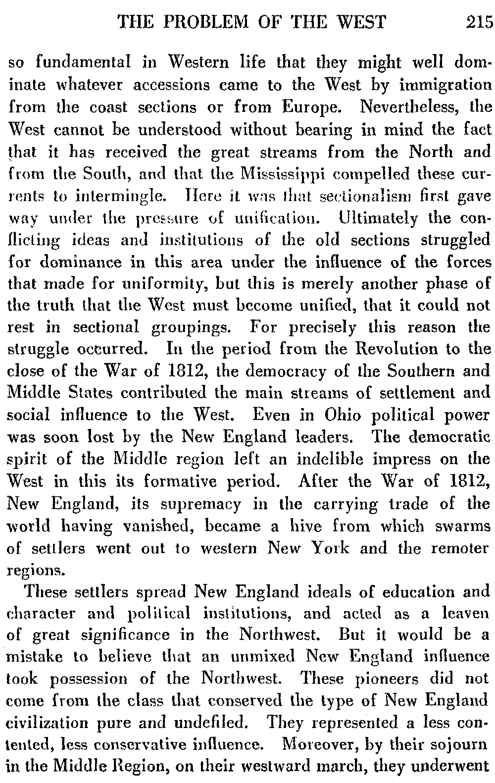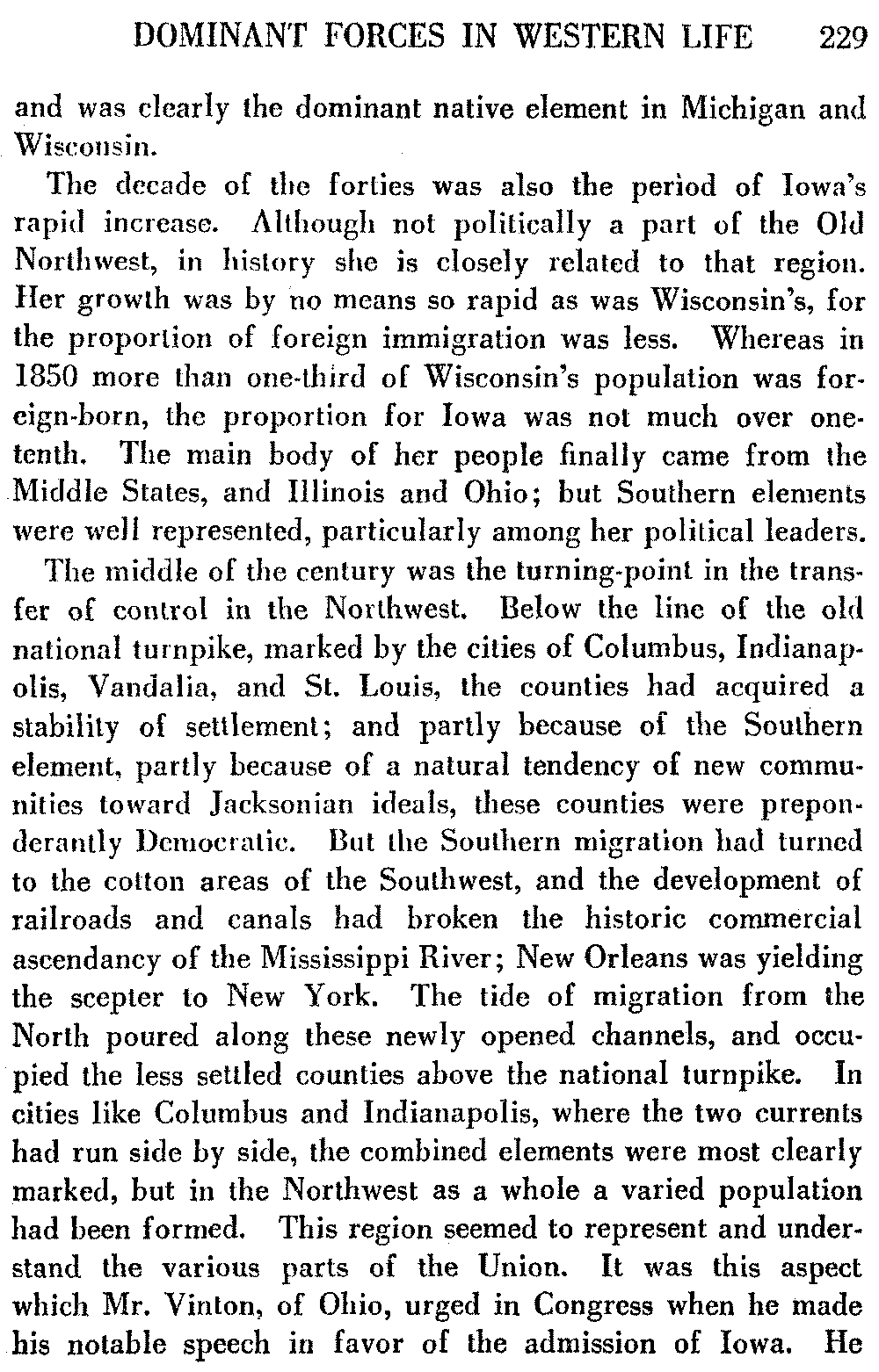 It was this nationalizing tendency of the West that transformed the democracy of Jefferson into the national republicanism of Monroe and the democracy of Andrew Jackson. The West of the War of 1812, the West of Clay, and Benton and Harrison, and Andrew Jackson, shut off by the Middle States and the mountains from the coast sections, had a solidarity of its own with national tendencies.[29:1] On the tide of the Father of Waters, North and South met and mingled into a nation. Interstate migration went steadily on—a process of cross-fertilization of ideas and institutions. The fierce struggle of the sections over slavery on the western frontier does not diminish the truth of this statement; it proves the truth of it. Slavery was a sectional trait that would not down, but in the West it could not remain sectional. It was the greatest of frontiersmen who declared: "I believe this Government can not [30]endure permanently half slave and half free. It will become all of one thing or all of the other." Nothing works for nationalism like intercourse within the nation. Mobility of population is death to localism, and the western frontier worked irresistibly in unsettling population. The effect reached back from the frontier and affected profoundly the Atlantic coast and even the Old World.
