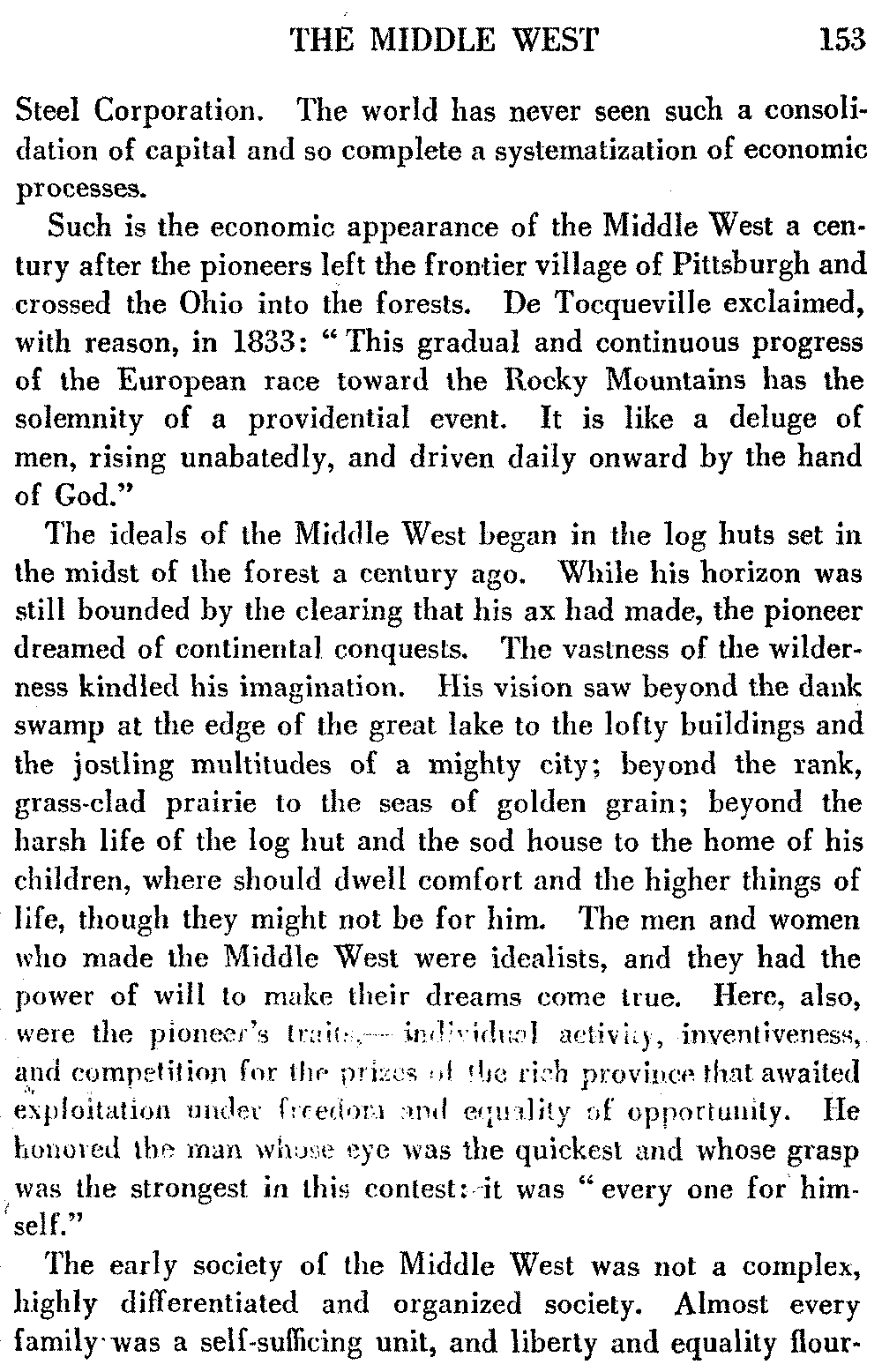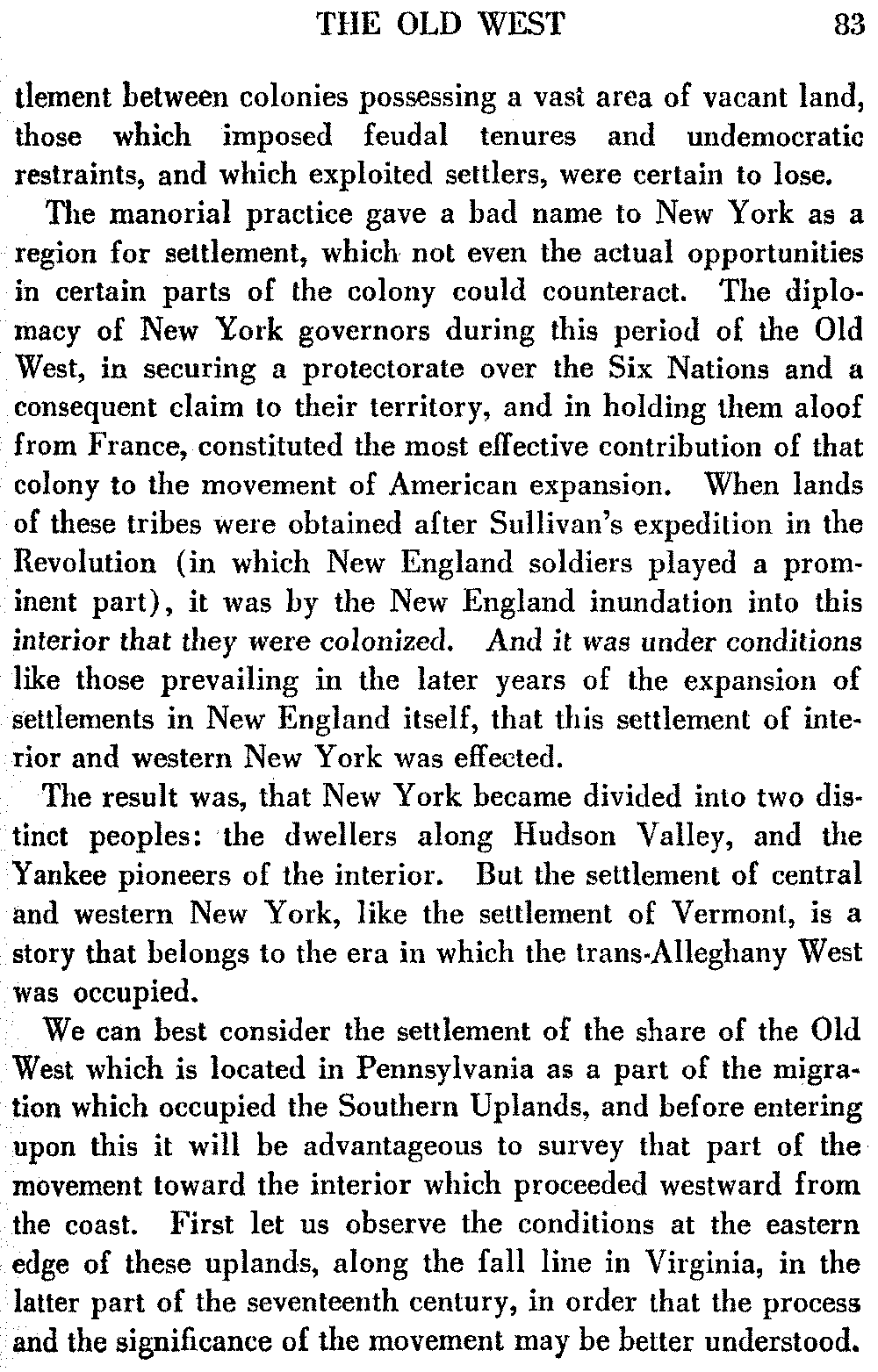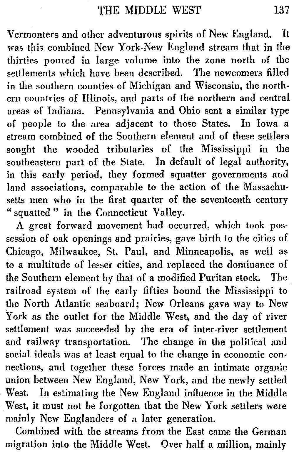 The Middle region, entered by New York harbor, was an open door to all Europe. The tide-water part of the South represented typical Englishmen, modified by a warm climate and servile labor, and living in baronial fashion on great plantations; New England stood for a special English movement—Puritanism. The Middle region was less English than the other sections. It had a wide mixture of nationalities, a varied society, the mixed town and county system of local government, a varied economic life, many religious sects. In short, it was a region mediating between New England and the South, [28]and the East and the West. It represented that composite nationality which the contemporary United States exhibits, that juxtaposition of non-English groups, occupying a valley or a little settlement, and presenting reflections of the map of Europe in their variety. It was democratic and nonsectional, if not national; "easy, tolerant, and contented;" rooted strongly in material prosperity. It was typical of the modern United States. It was least sectional, not only because it lay between North and South, but also because with no barriers to shut out its frontiers from its settled region, and with a system of connecting waterways, the Middle region mediated between East and West as well as between North and South. Thus it became the typically American region. Even the New Englander, who was shut out from the frontier by the Middle region, tarrying in New York or Pennsylvania on his westward march, lost the acuteness of his sectionalism on the way.[28:1]