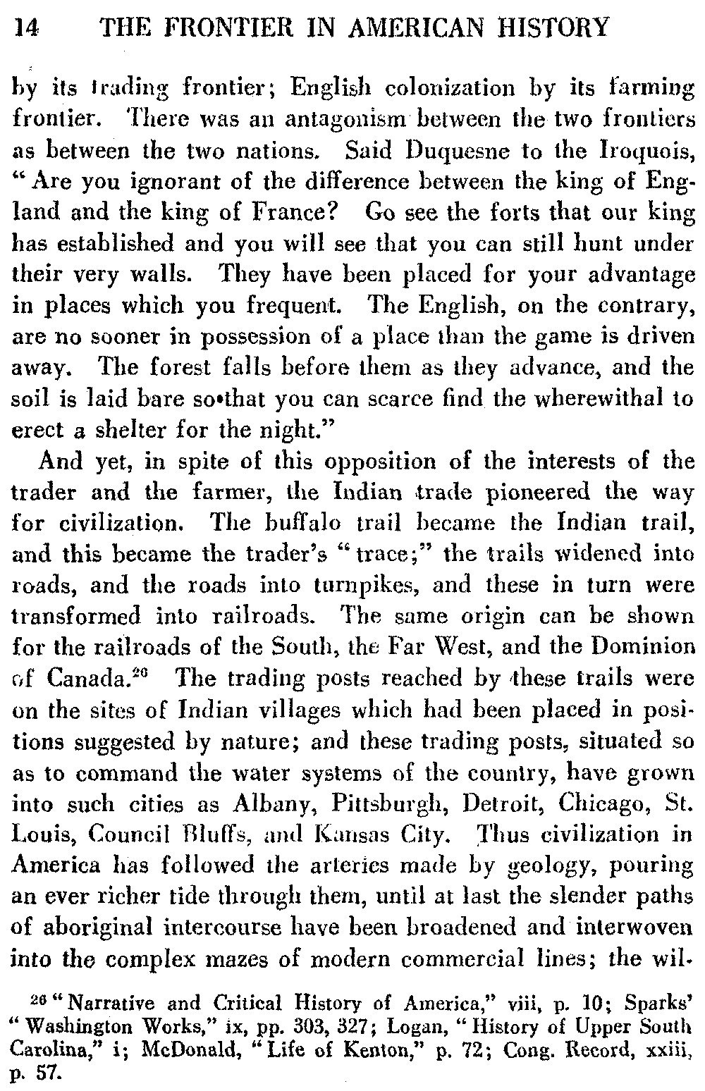 And yet, in spite of this opposition of the interests of the trader and the farmer, the Indian trade pioneered the way for civilization. The buffalo trail became the Indian trail, and this became the trader's "trace;" the trails widened into roads, and the roads into turnpikes, and these in turn were transformed into railroads. The same origin can be shown for the railroads of the South, the Far West, and the Dominion of Canada.[14:1] The trading posts reached by these trails were on the sites of Indian villages which had been placed in positions suggested by nature; and these trading posts, situated so as to command the water systems of the country, have grown into such cities as Albany, Pittsburgh, Detroit, Chicago, St. Louis, Council Bluffs, and Kansas City. Thus civilization in America has followed the arteries made by geology, pouring an ever richer tide through them, until at last the slender paths of aboriginal intercourse have been broadened and interwoven into the complex mazes of modern commercial lines; the [15]wilderness has been interpenetrated by lines of civilization growing ever more numerous. It is like the steady growth of a complex nervous system for the originally simple, inert continent. If one would understand why we are to-day one nation, rather than a collection of isolated states, he must study this economic and social consolidation of the country. In this progress from savage conditions lie topics for the evolutionist.[15:1]
