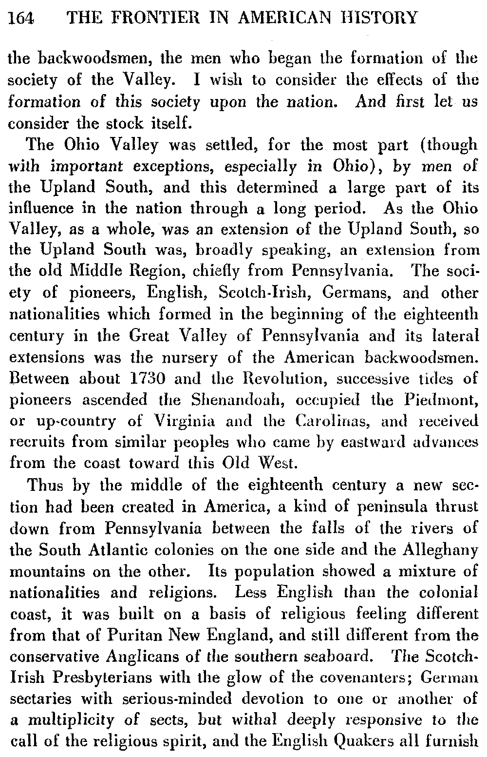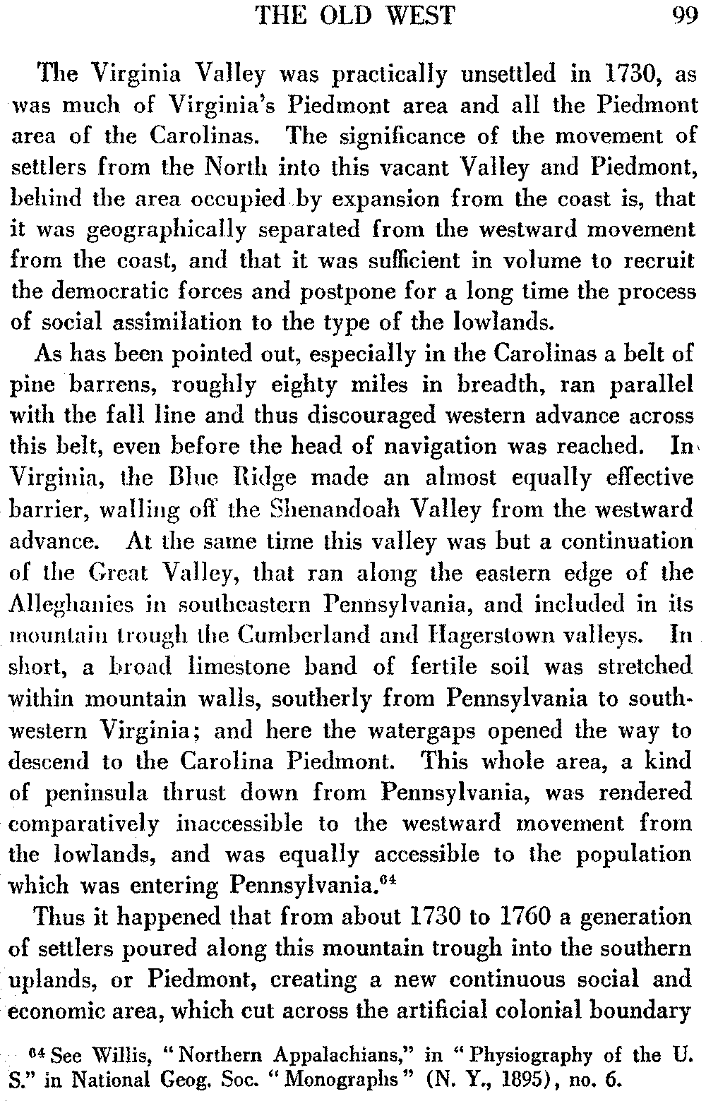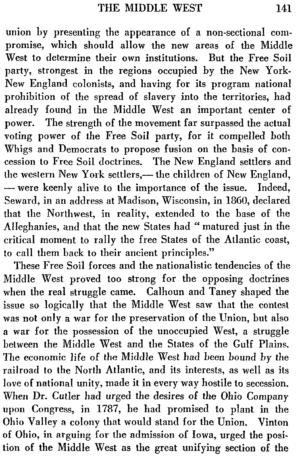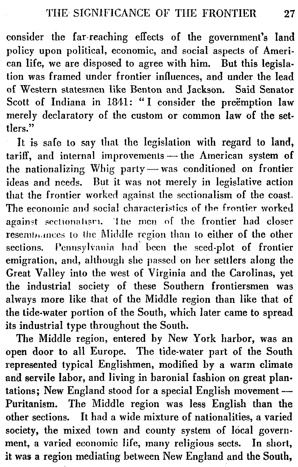 It is safe to say that the legislation with regard to land, tariff, and internal improvements—the American system of the nationalizing Whig party—was conditioned on frontier ideas and needs. But it was not merely in legislative action that the frontier worked against the sectionalism of the coast. The economic and social characteristics of the frontier worked against sectionalism. The men of the frontier had closer resemblances to the Middle region than to either of the other sections. Pennsylvania had been the seed-plot of frontier emigration, and, although she passed on her settlers along the Great Valley into the west of Virginia and the Carolinas, yet the industrial society of these Southern frontiersmen was always more like that of the Middle region than like that of the tide-water portion of the South, which later came to spread its industrial type throughout the South.