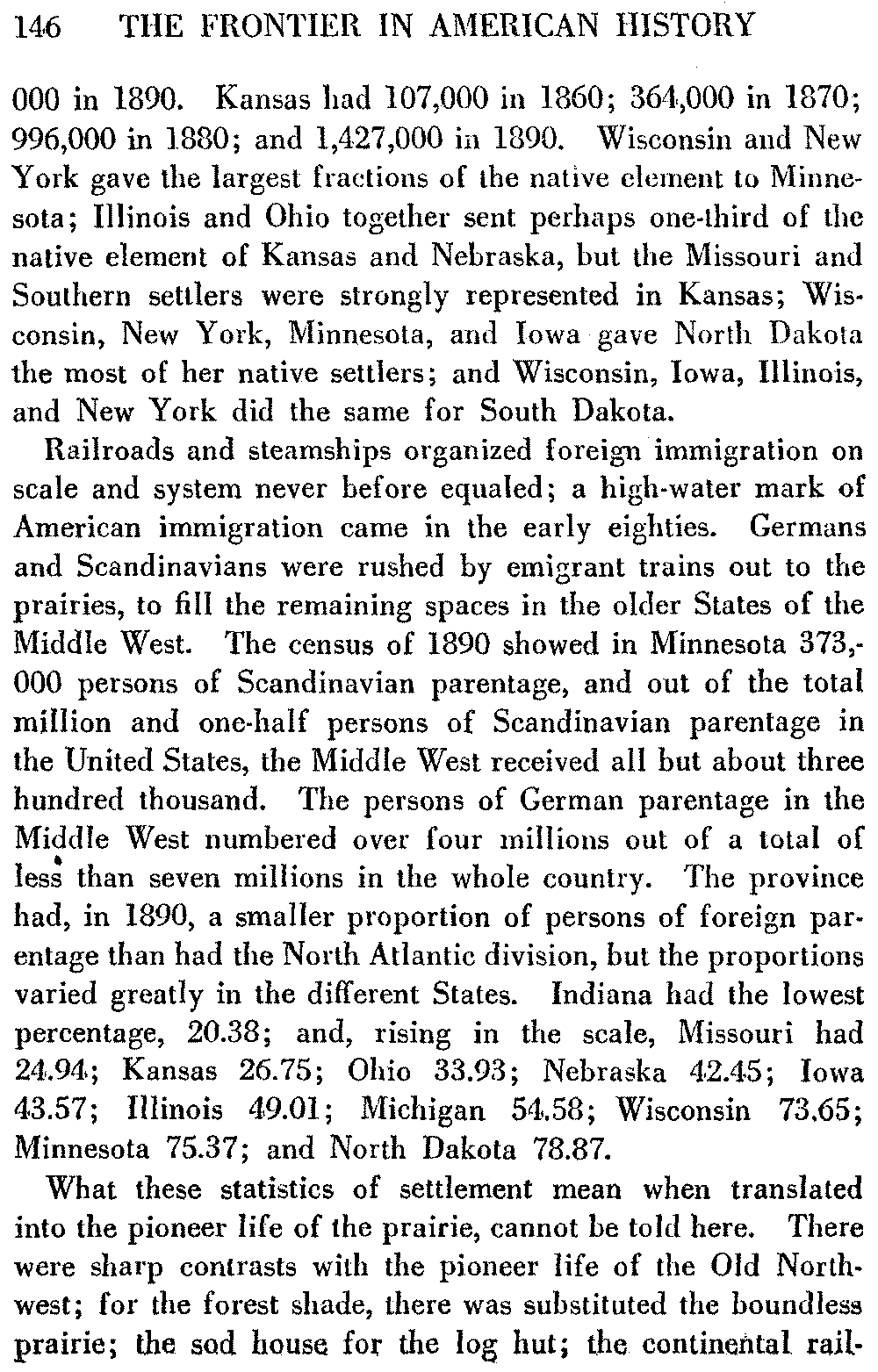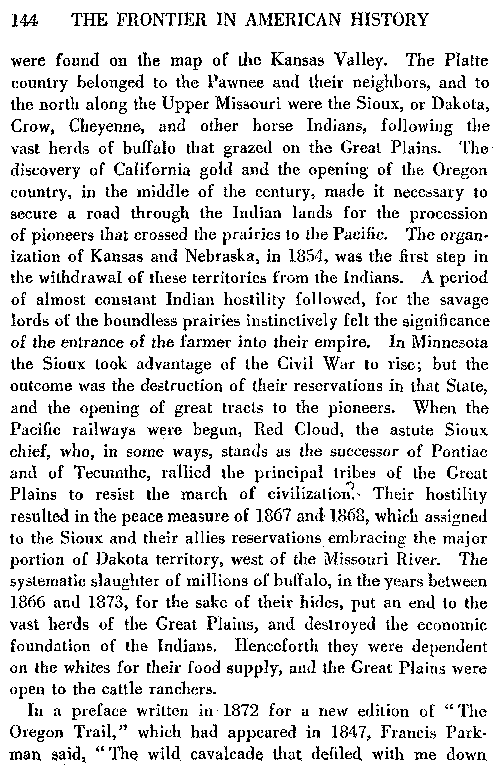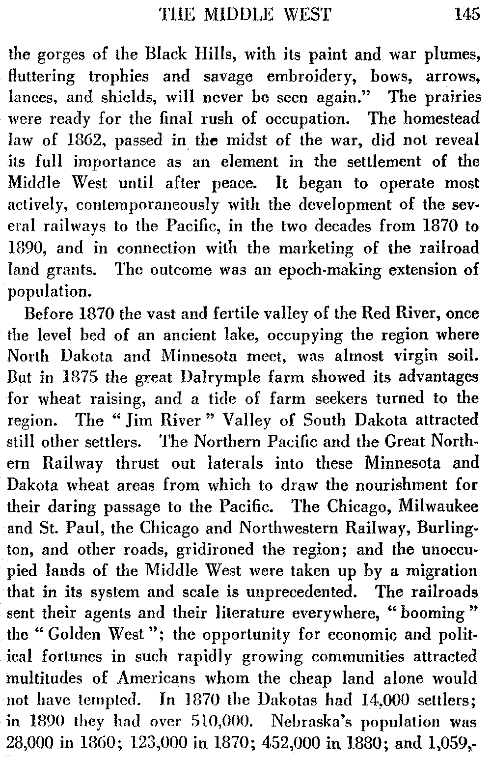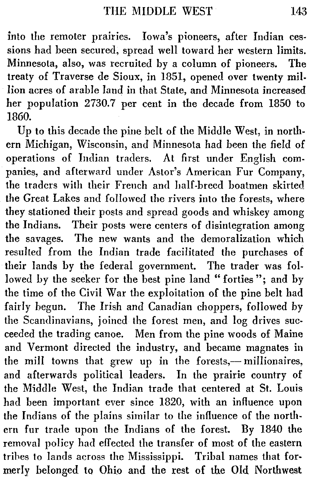 In the middle of this century the line indicated by the present eastern boundary of Indian Territory, Nebraska, and Kansas marked the frontier of the Indian country.[8:1] Minnesota and Wisconsin still exhibited frontier conditions,[8:2] but the distinctive frontier of the period is found in California, where the gold discoveries had sent a sudden tide of adventurous miners, and in Oregon, and the settlements in Utah.[8:3] As the frontier had leaped over the Alleghanies, so now it skipped the Great Plains and the Rocky Mountains; and in the same way that the advance of the frontiersmen beyond the Alleghanies had caused the rise of important questions of transportation and internal improvement, so now the settlers beyond the Rocky Mountains needed means of communication with the East, and in the furnishing of these arose the settlement of the Great Plains and the development of still another kind [9]of frontier life. Railroads, fostered by land grants, sent an increasing tide of immigrants into the Far West. The United States Army fought a series of Indian wars in Minnesota, Dakota, and the Indian Territory.