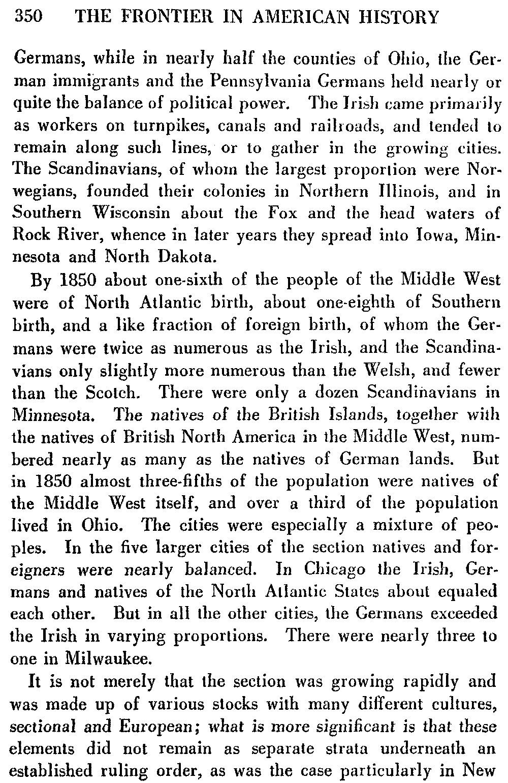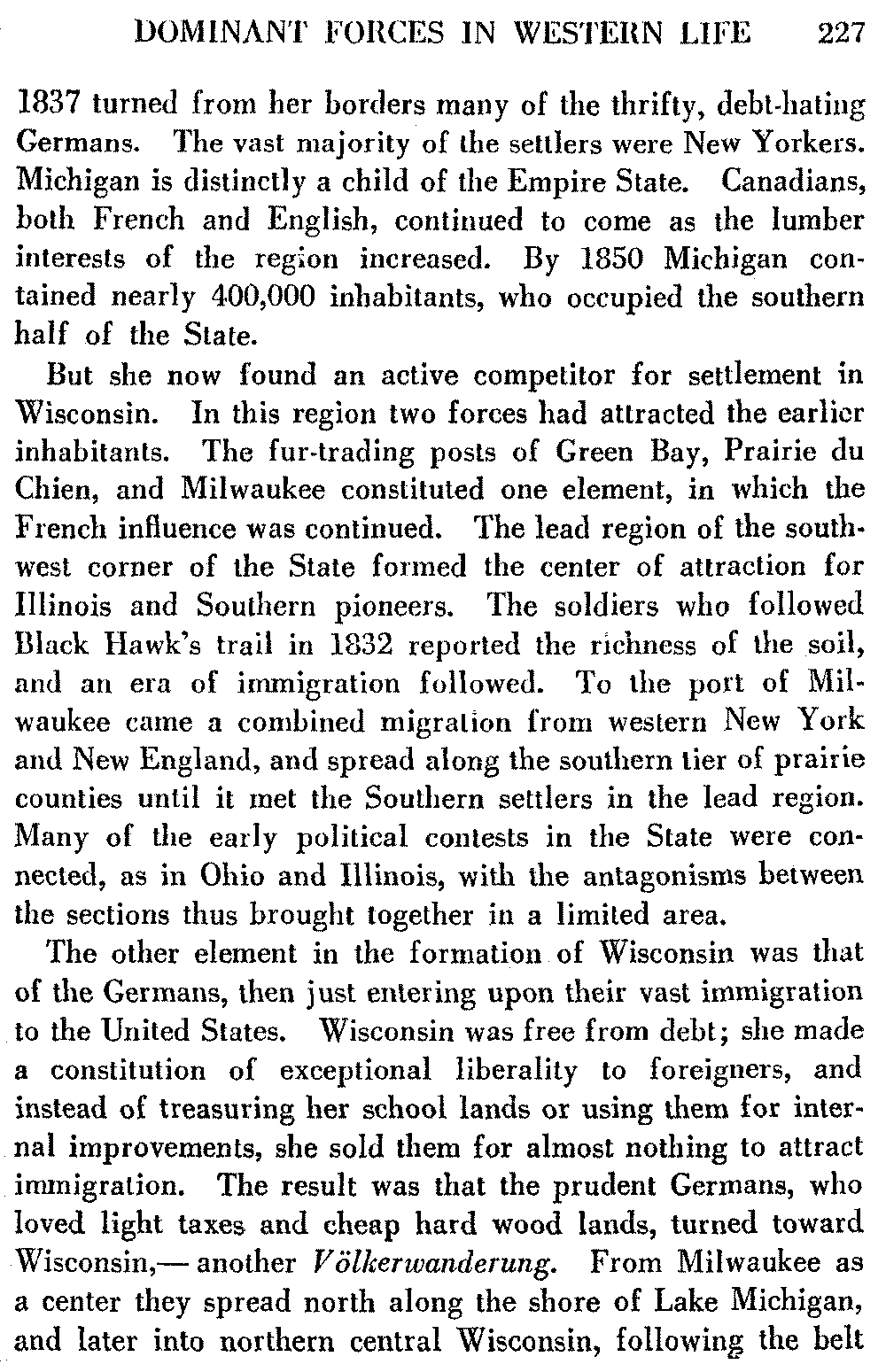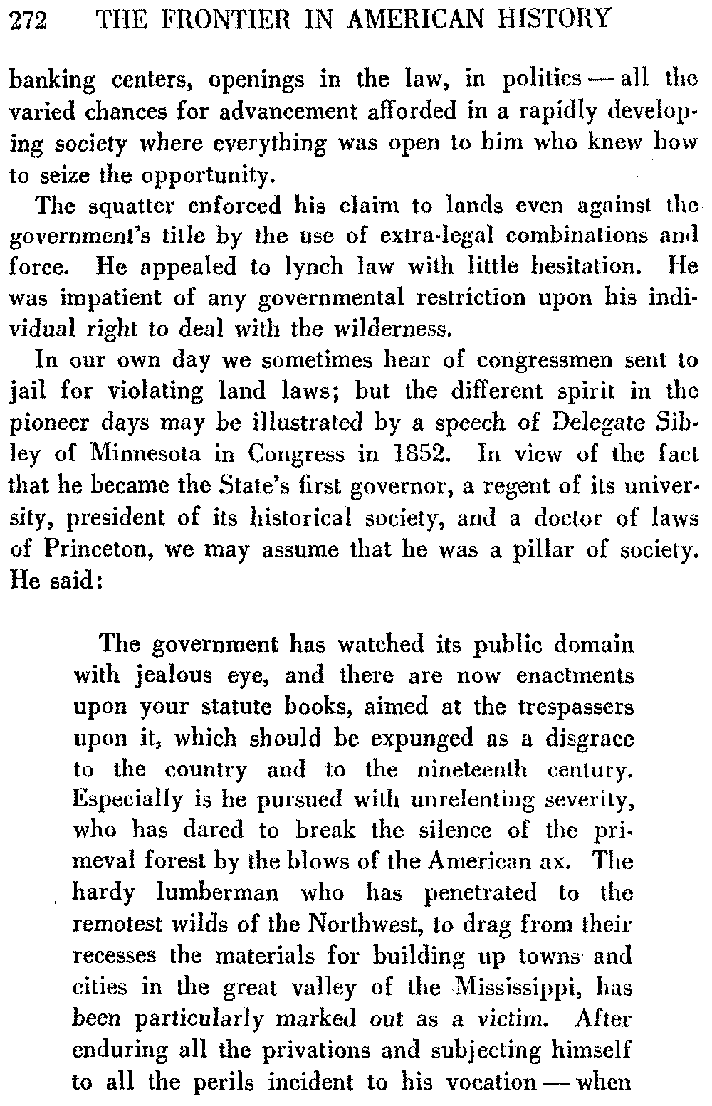 In the middle of this century the line indicated by the present eastern boundary of Indian Territory, Nebraska, and Kansas marked the frontier of the Indian country.[8:1] Minnesota and Wisconsin still exhibited frontier conditions,[8:2] but the distinctive frontier of the period is found in California, where the gold discoveries had sent a sudden tide of adventurous miners, and in Oregon, and the settlements in Utah.[8:3] As the frontier had leaped over the Alleghanies, so now it skipped the Great Plains and the Rocky Mountains; and in the same way that the advance of the frontiersmen beyond the Alleghanies had caused the rise of important questions of transportation and internal improvement, so now the settlers beyond the Rocky Mountains needed means of communication with the East, and in the furnishing of these arose the settlement of the Great Plains and the development of still another kind [9]of frontier life. Railroads, fostered by land grants, sent an increasing tide of immigrants into the Far West. The United States Army fought a series of Indian wars in Minnesota, Dakota, and the Indian Territory.