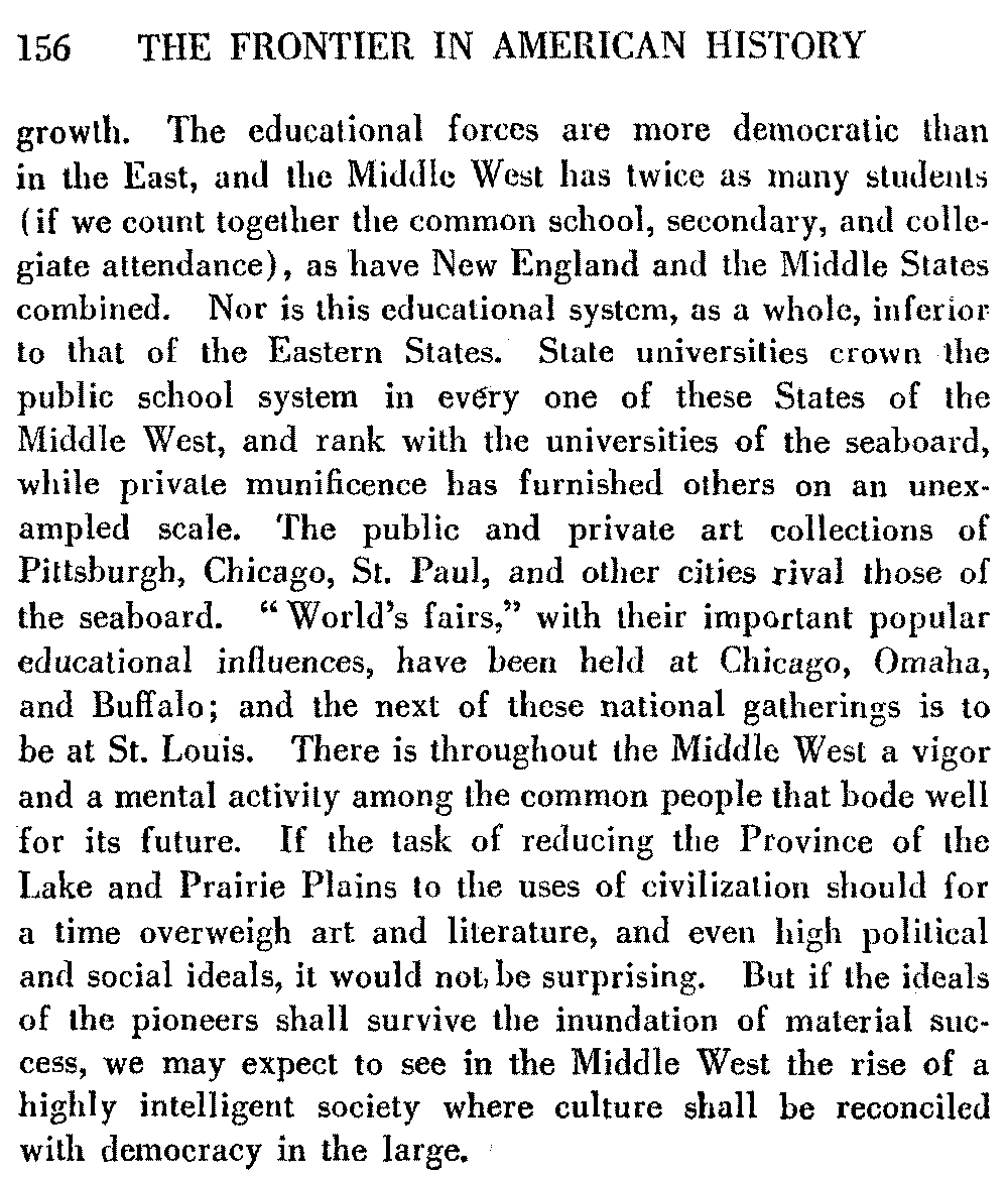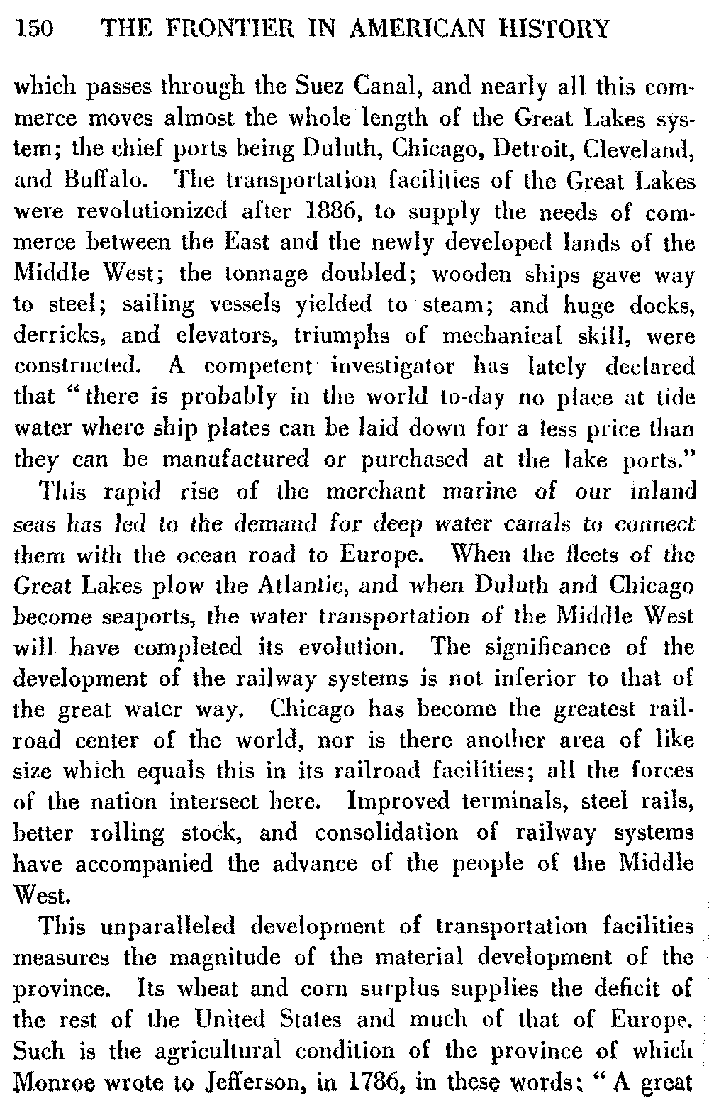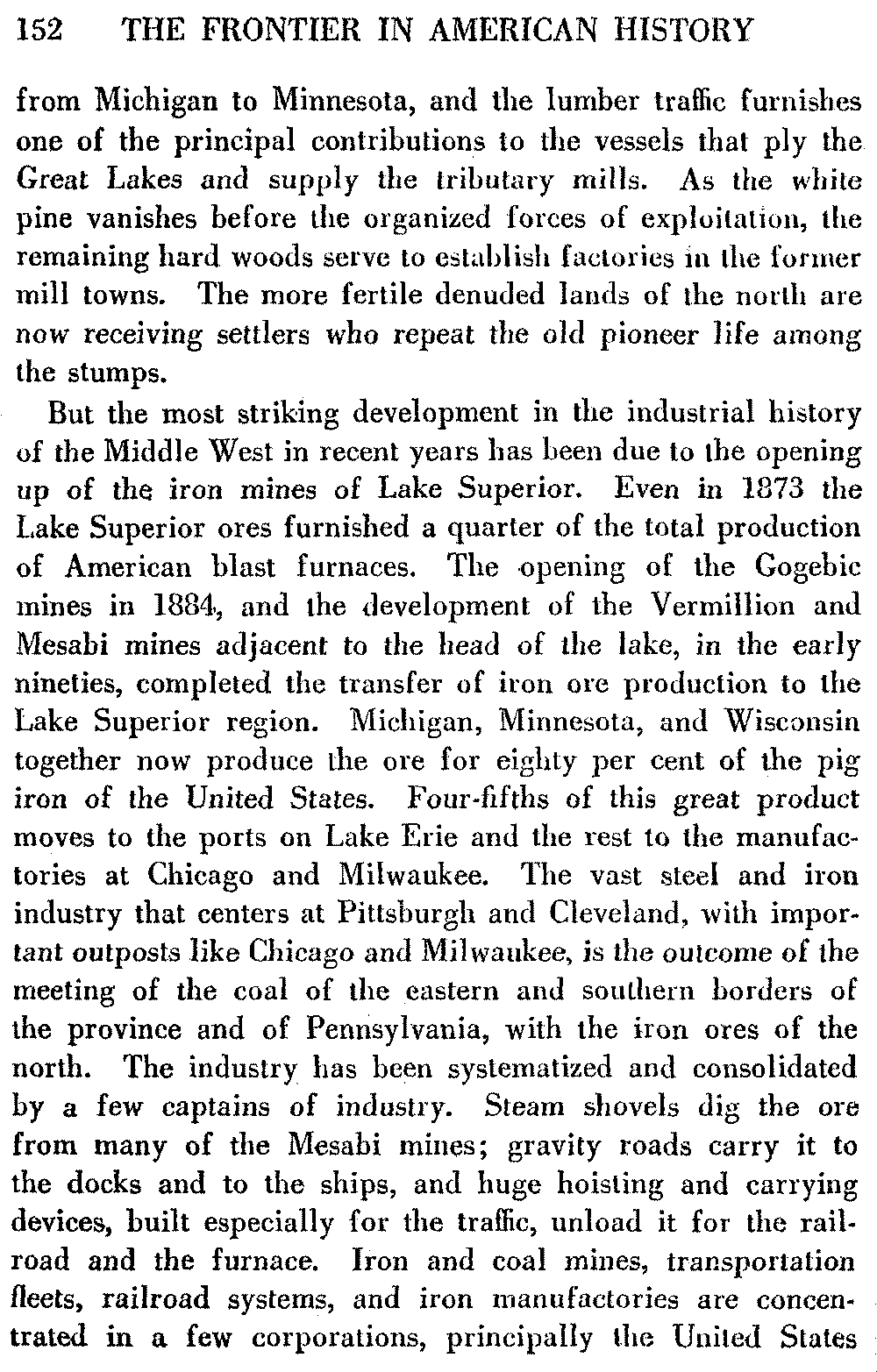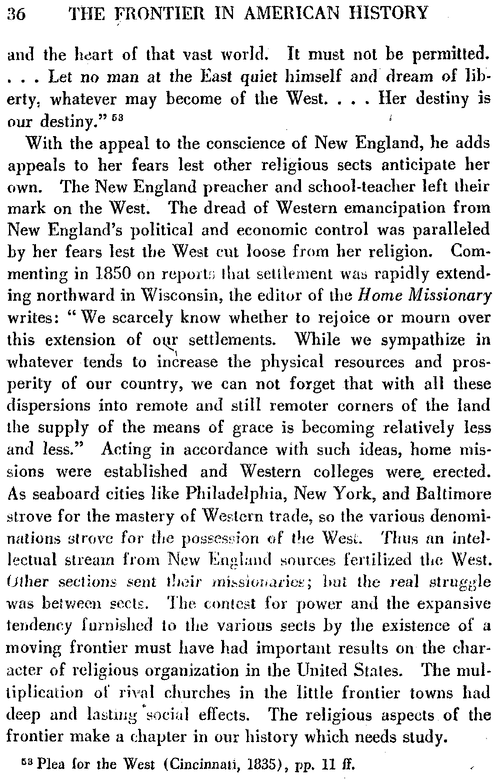 In the middle of this century the line indicated by the present eastern boundary of Indian Territory, Nebraska, and Kansas marked the frontier of the Indian country.[8:1] Minnesota and Wisconsin still exhibited frontier conditions,[8:2] but the distinctive frontier of the period is found in California, where the gold discoveries had sent a sudden tide of adventurous miners, and in Oregon, and the settlements in Utah.[8:3] As the frontier had leaped over the Alleghanies, so now it skipped the Great Plains and the Rocky Mountains; and in the same way that the advance of the frontiersmen beyond the Alleghanies had caused the rise of important questions of transportation and internal improvement, so now the settlers beyond the Rocky Mountains needed means of communication with the East, and in the furnishing of these arose the settlement of the Great Plains and the development of still another kind [9]of frontier life. Railroads, fostered by land grants, sent an increasing tide of immigrants into the Far West. The United States Army fought a series of Indian wars in Minnesota, Dakota, and the Indian Territory.