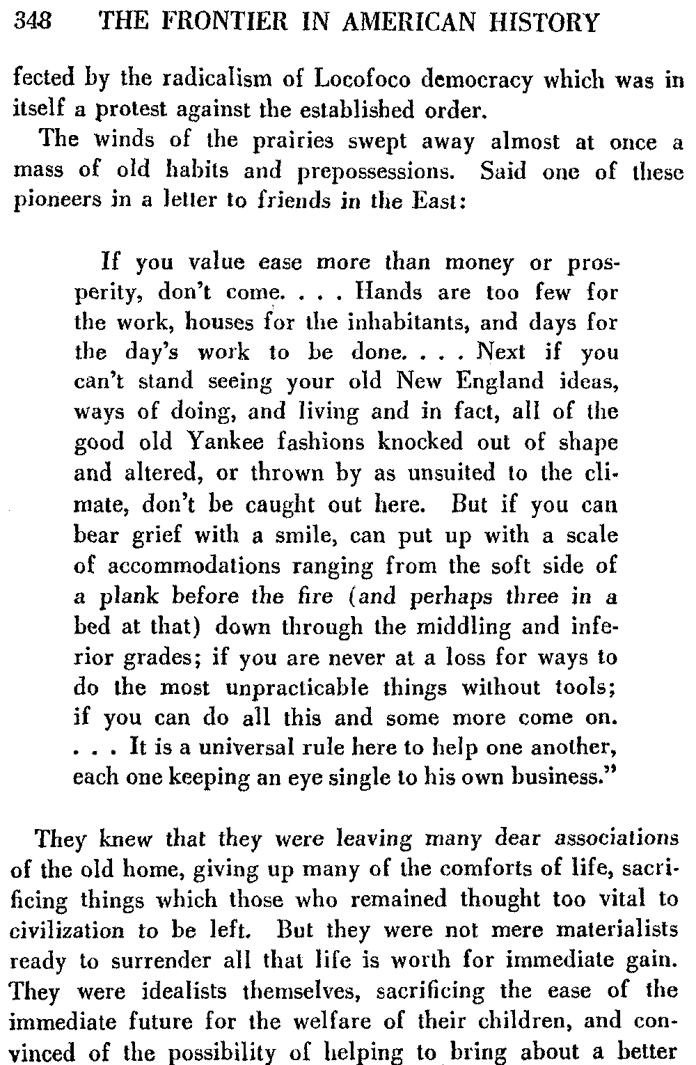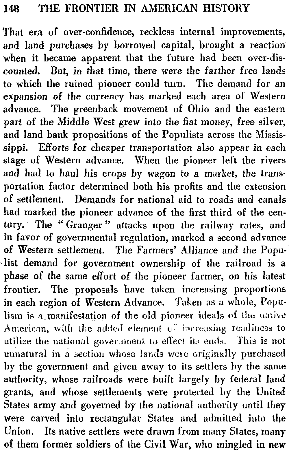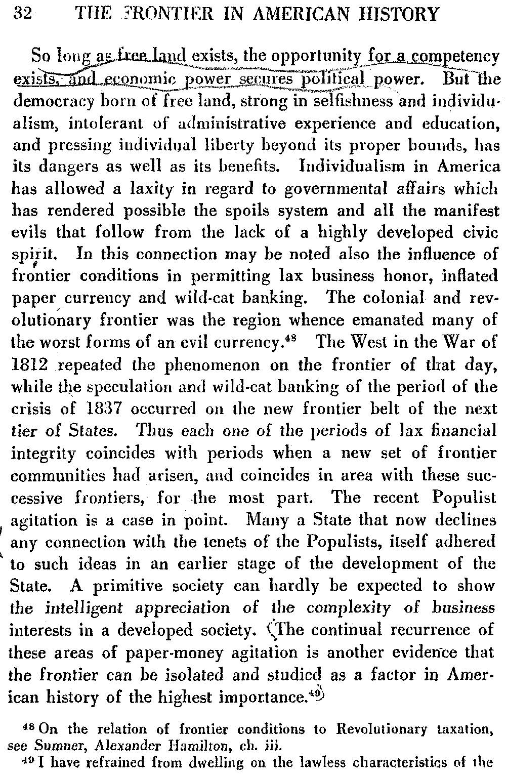 So long as free land exists, the opportunity for a competency exists, and economic power secures political power. But the democracy born of free land, strong in selfishness and individualism, intolerant of administrative experience and education, and pressing individual liberty beyond its proper bounds, has its dangers as well as its benefits. Individualism in America has allowed a laxity in regard to governmental affairs which has rendered possible the spoils system and all the manifest evils that follow from the lack of a highly developed civic spirit. In this connection may be noted also the influence of frontier conditions in permitting lax business honor, inflated paper currency and wild-cat banking. The colonial and revolutionary frontier was the region whence emanated many of the worst forms of an evil currency.[32:1] The West in the War of 1812 repeated the phenomenon on the frontier of that day, while the speculation and wild-cat banking of the period of the crisis of 1837 occurred on the new frontier belt of the next tier of States. Thus each one of the periods of lax financial integrity coincides with periods when a new set of frontier communities had arisen, and coincides in area with these successive frontiers, for the most part. The recent Populist agitation is a case in point. Many a State that now declines any connection with the tenets of the Populists, itself adhered to such ideas in an earlier stage of the development of the State. A primitive society can hardly be expected to show the intelligent appreciation of the complexity of business interests in a developed society. The continual recurrence of these areas of paper-money agitation is another evidence that the frontier can be isolated and studied as a factor in American history of the highest importance.[32:2]