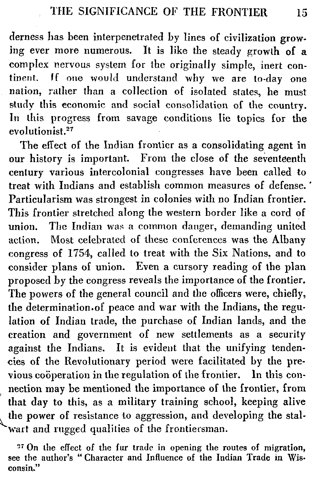 The effect of the Indian frontier as a consolidating agent in our history is important. From the close of the seventeenth century various intercolonial congresses have been called to treat with Indians and establish common measures of defense. Particularism was strongest in colonies with no Indian frontier. This frontier stretched along the western border like a cord of union. The Indian was a common danger, demanding united action. Most celebrated of these conferences was the Albany congress of 1754, called to treat with the Six Nations, and to consider plans of union. Even a cursory reading of the plan proposed by the congress reveals the importance of the frontier. The powers of the general council and the officers were, chiefly, the determination of peace and war with the Indians, the regulation of Indian trade, the purchase of Indian lands, and the creation and government of new settlements as a security against the Indians. It is evident that the unifying tendencies of the Revolutionary period were facilitated by the previous coöperation in the regulation of the frontier. In this connection may be mentioned the importance of the frontier, from that day to this, as a military training school, keeping alive the power of resistance to aggression, and developing the stalwart and rugged qualities of the frontiersman.