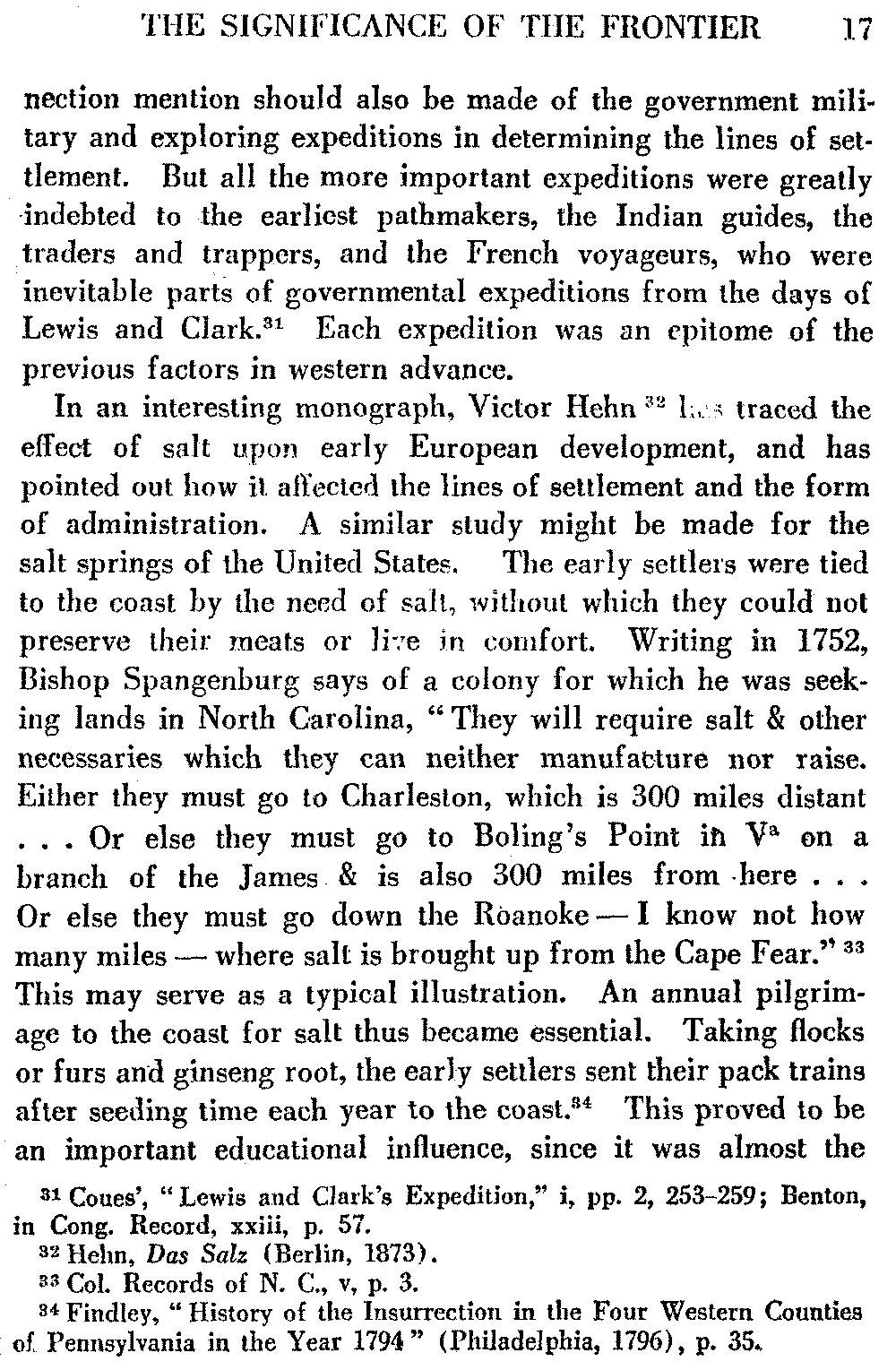 In an interesting monograph, Victor Hehn[17:2] has traced the effect of salt upon early European development, and has pointed out how it affected the lines of settlement and the form of administration. A similar study might be made for the salt springs of the United States. The early settlers were tied to the coast by the need of salt, without which they could not preserve their meats or live in comfort. Writing in 1752, Bishop Spangenburg says of a colony for which he was seeking lands in North Carolina, "They will require salt & other necessaries which they can neither manufacture nor raise. Either they must go to Charleston, which is 300 miles distant . . . Or else they must go to Boling's Point in Va on a branch of the James & is also 300 miles from here . . Or else they must go down the Roanoke—I know not how many miles—where salt is brought up from the Cape Fear."[17:3] This may serve as a typical illustration. An annual pilgrimage to the coast for salt thus became essential. Taking flocks or furs and ginseng root, the early settlers sent their pack trains after seeding time each year to the coast.[17:4] This proved to be an important educational influence, since it was almost the [18]only way in which the pioneer learned what was going on in the East. But when discovery was made of the salt springs of the Kanawha, and the Holston, and Kentucky, and central New York, the West began to be freed from dependence on the coast. It was in part the effect of finding these salt springs that enabled settlement to cross the mountains.