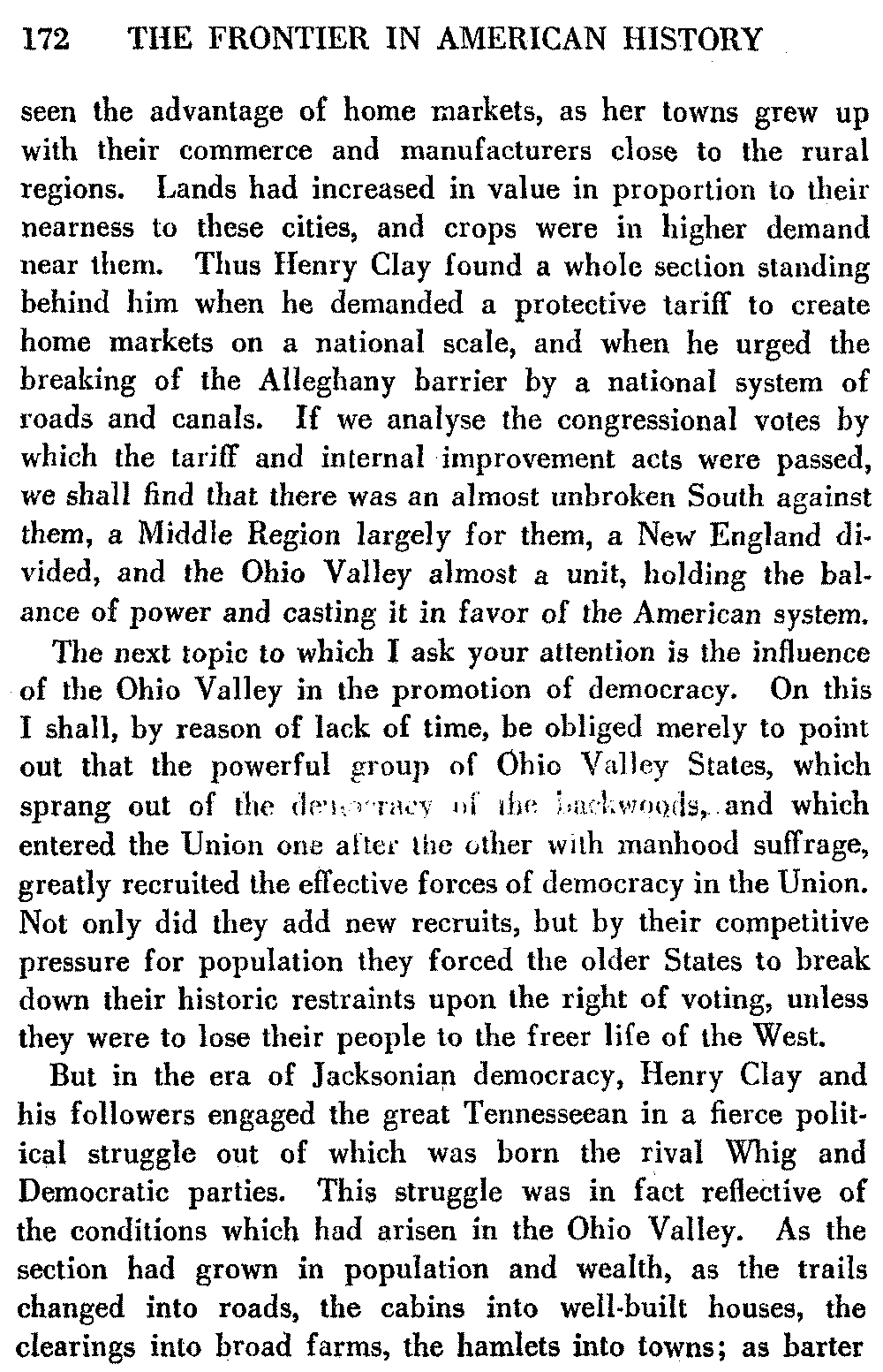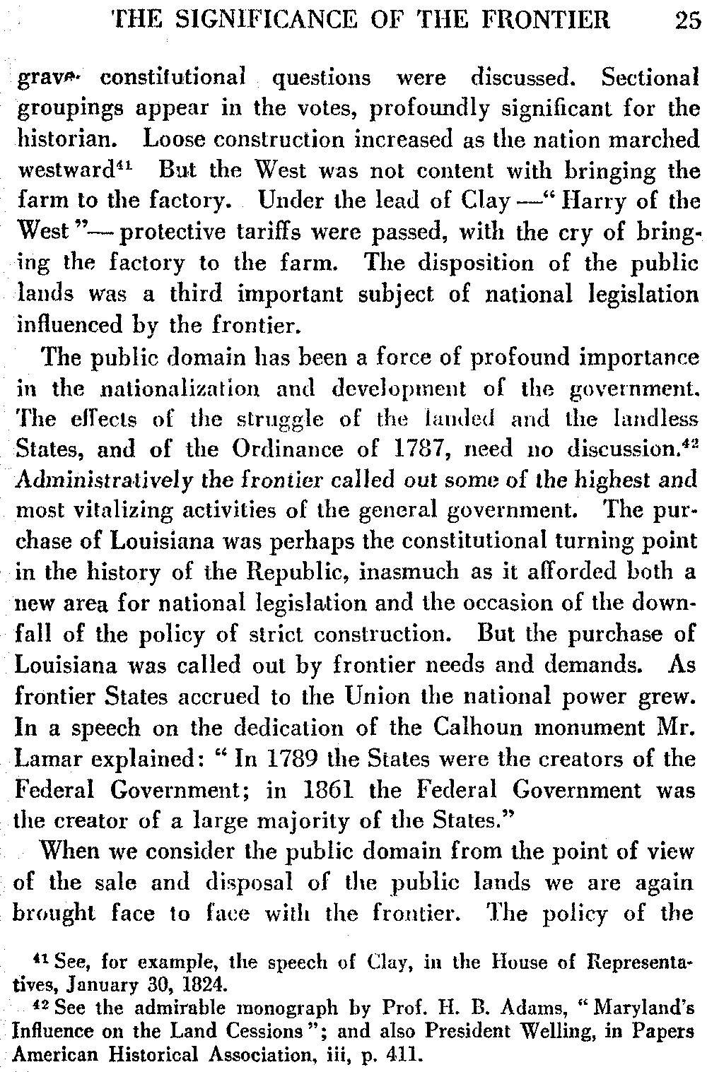 This is a wrong perspective. The pioneer needed the goods of the coast, and so the grand series of internal improvement and railroad legislation began, with potent nationalizing effects. Over internal improvements occurred great debates, in which [25]grave constitutional questions were discussed. Sectional groupings appear in the votes, profoundly significant for the historian. Loose construction increased as the nation marched westward.[25:1] But the West was not content with bringing the farm to the factory. Under the lead of Clay—"Harry of the West"—protective tariffs were passed, with the cry of bringing the factory to the farm. The disposition of the public lands was a third important subject of national legislation influenced by the frontier.