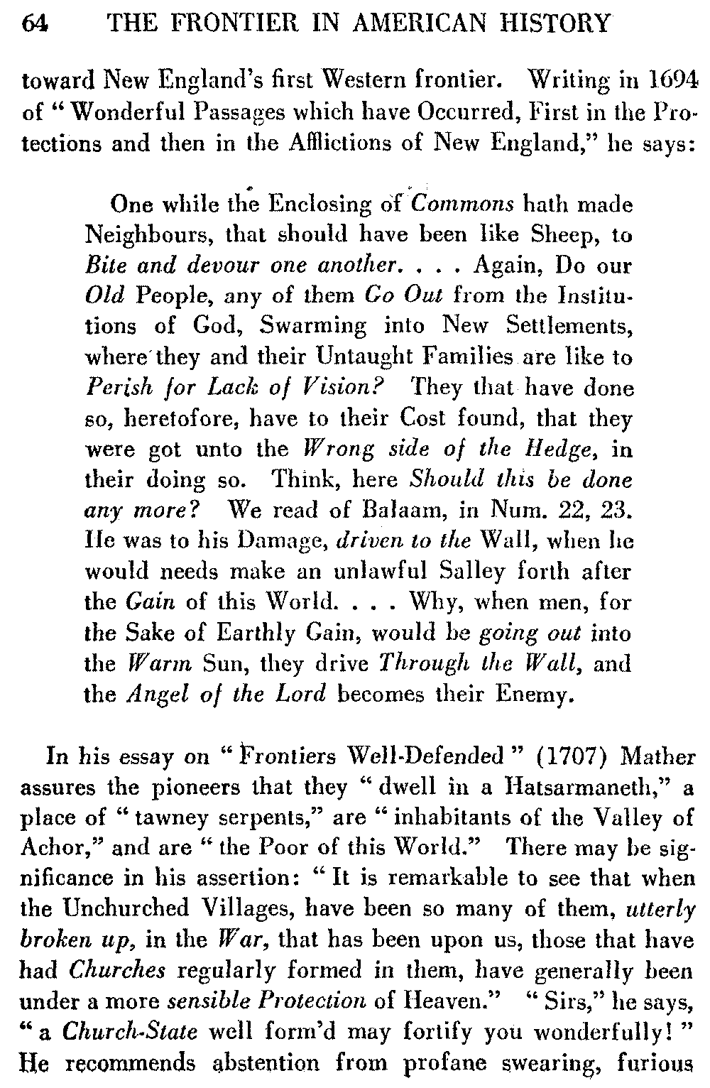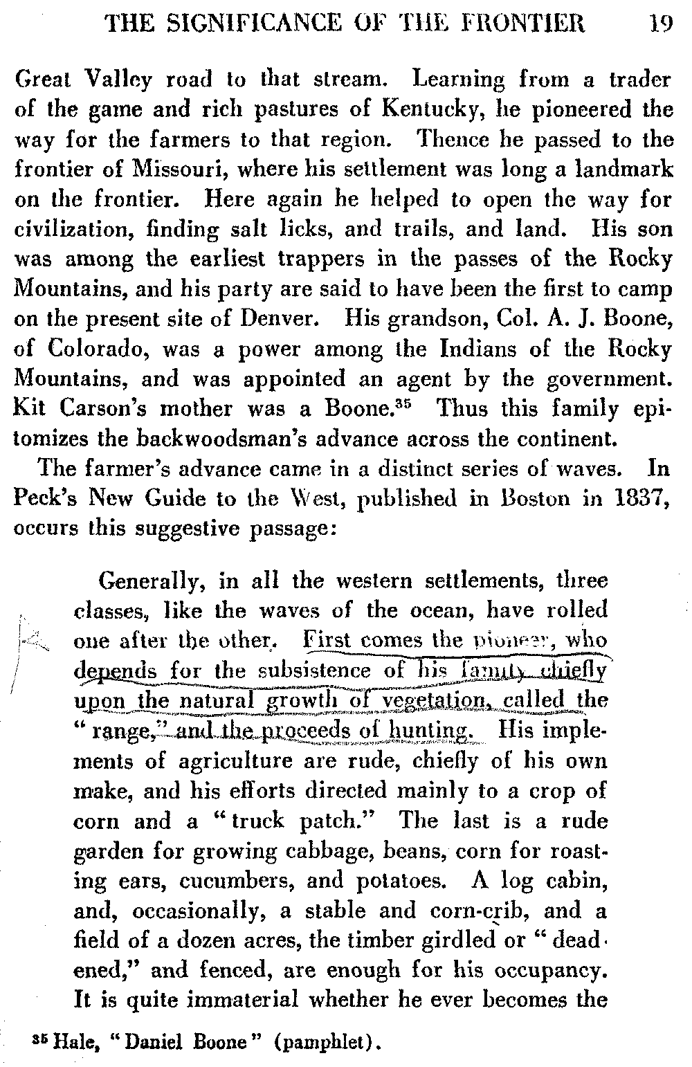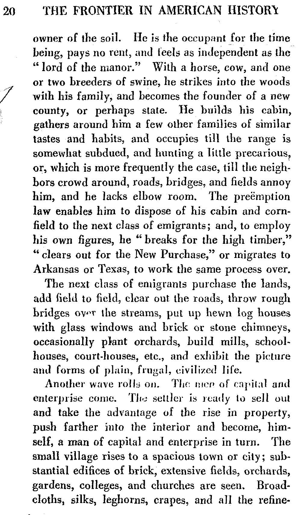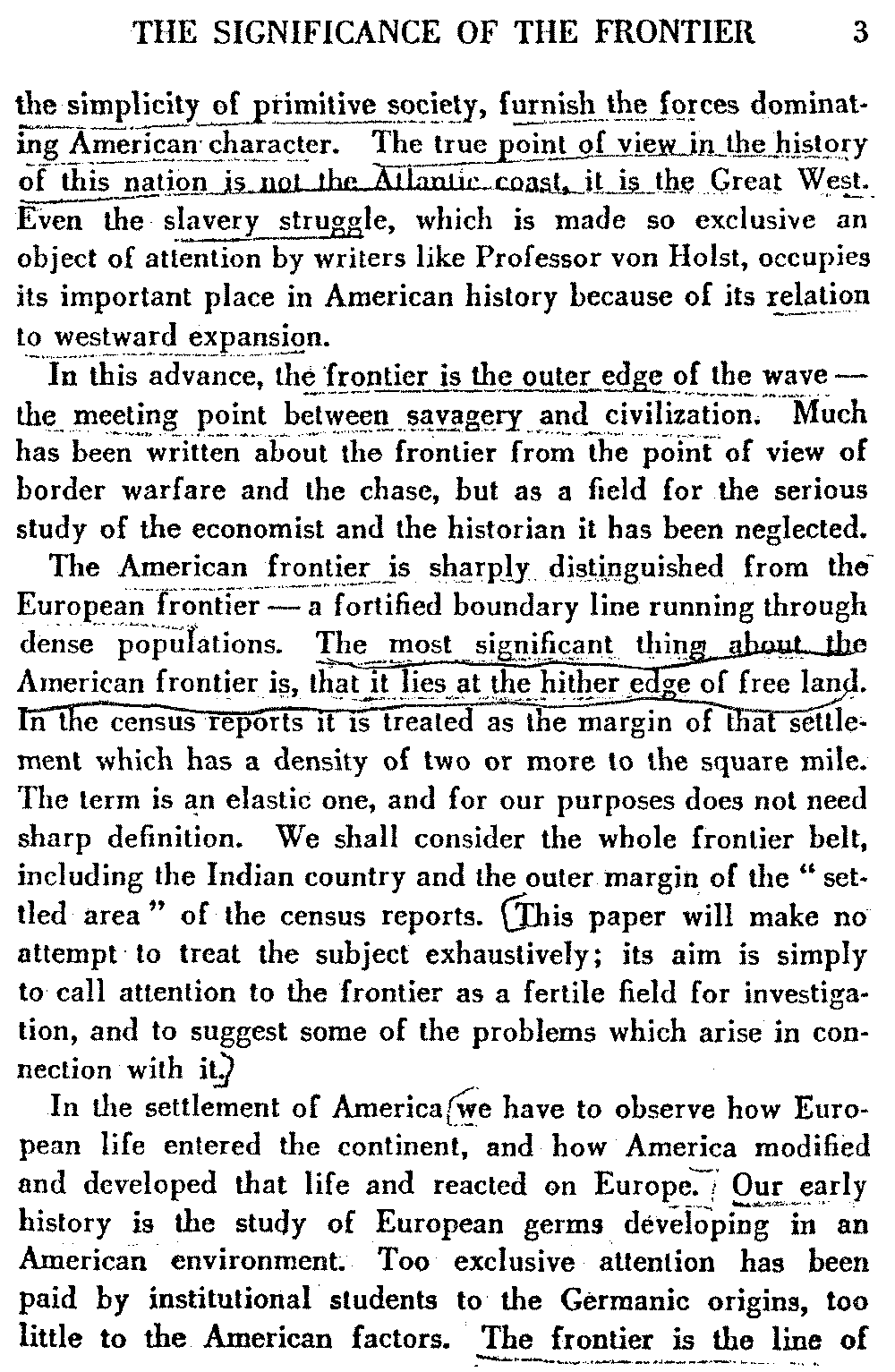 In this advance, the frontier is the outer edge of the wave—the meeting point between savagery and civilization. Much has been written about the frontier from the point of view of border warfare and the chase, but as a field for the serious study of the economist and the historian it has been neglected.