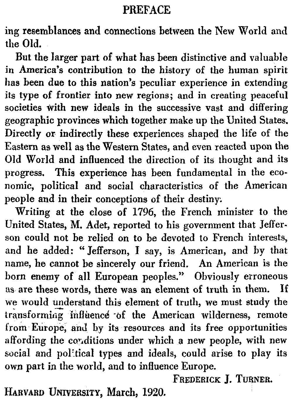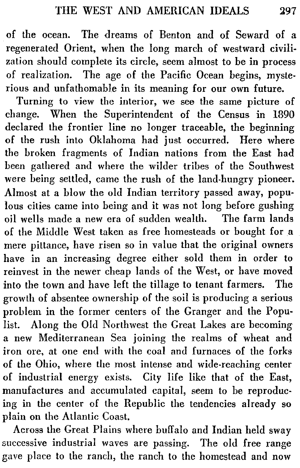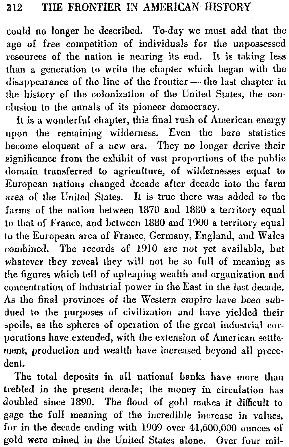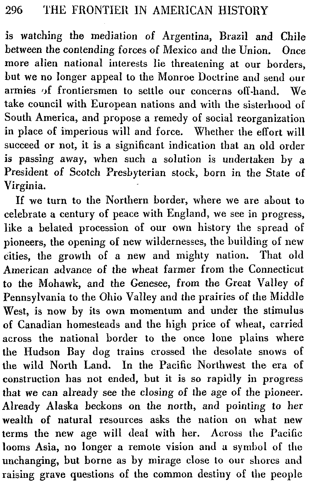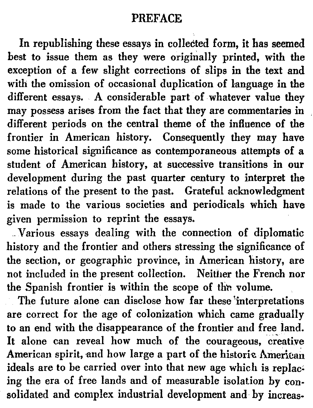 The future alone can disclose how far these interpretations are correct for the age of colonization which came gradually to an end with the disappearance of the frontier and free land. It alone can reveal how much of the courageous, creative American spirit, and how large a part of the historic American ideals are to be carried over into that new age which is replacing the era of free lands and of measurable isolation by consolidated and complex industrial development and by increasing [vi]resemblances and connections between the New World and the Old.