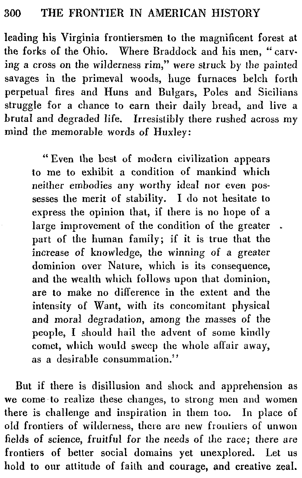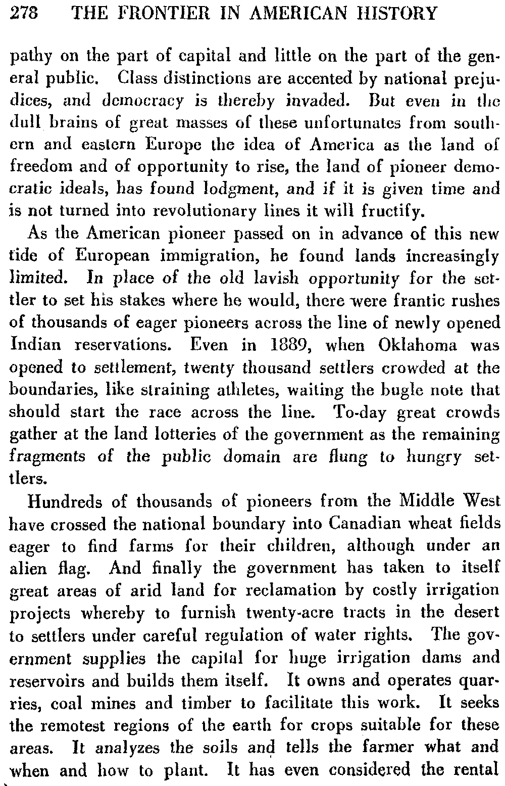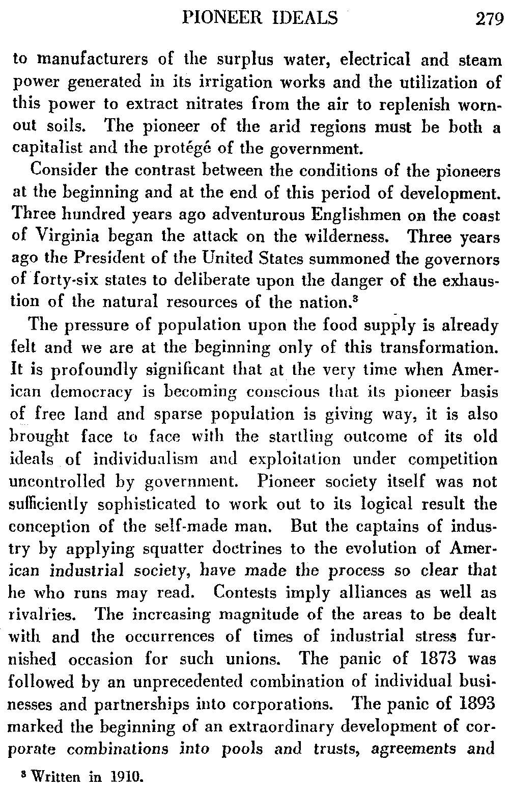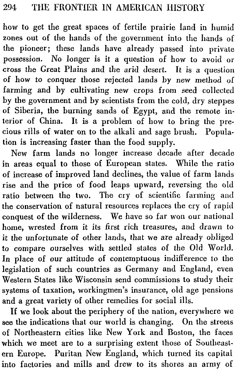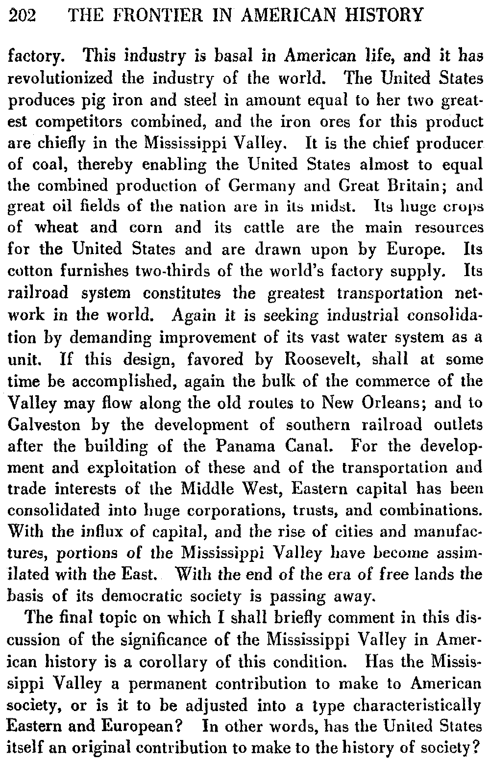 The future alone can disclose how far these interpretations are correct for the age of colonization which came gradually to an end with the disappearance of the frontier and free land. It alone can reveal how much of the courageous, creative American spirit, and how large a part of the historic American ideals are to be carried over into that new age which is replacing the era of free lands and of measurable isolation by consolidated and complex industrial development and by increasing [vi]resemblances and connections between the New World and the Old.