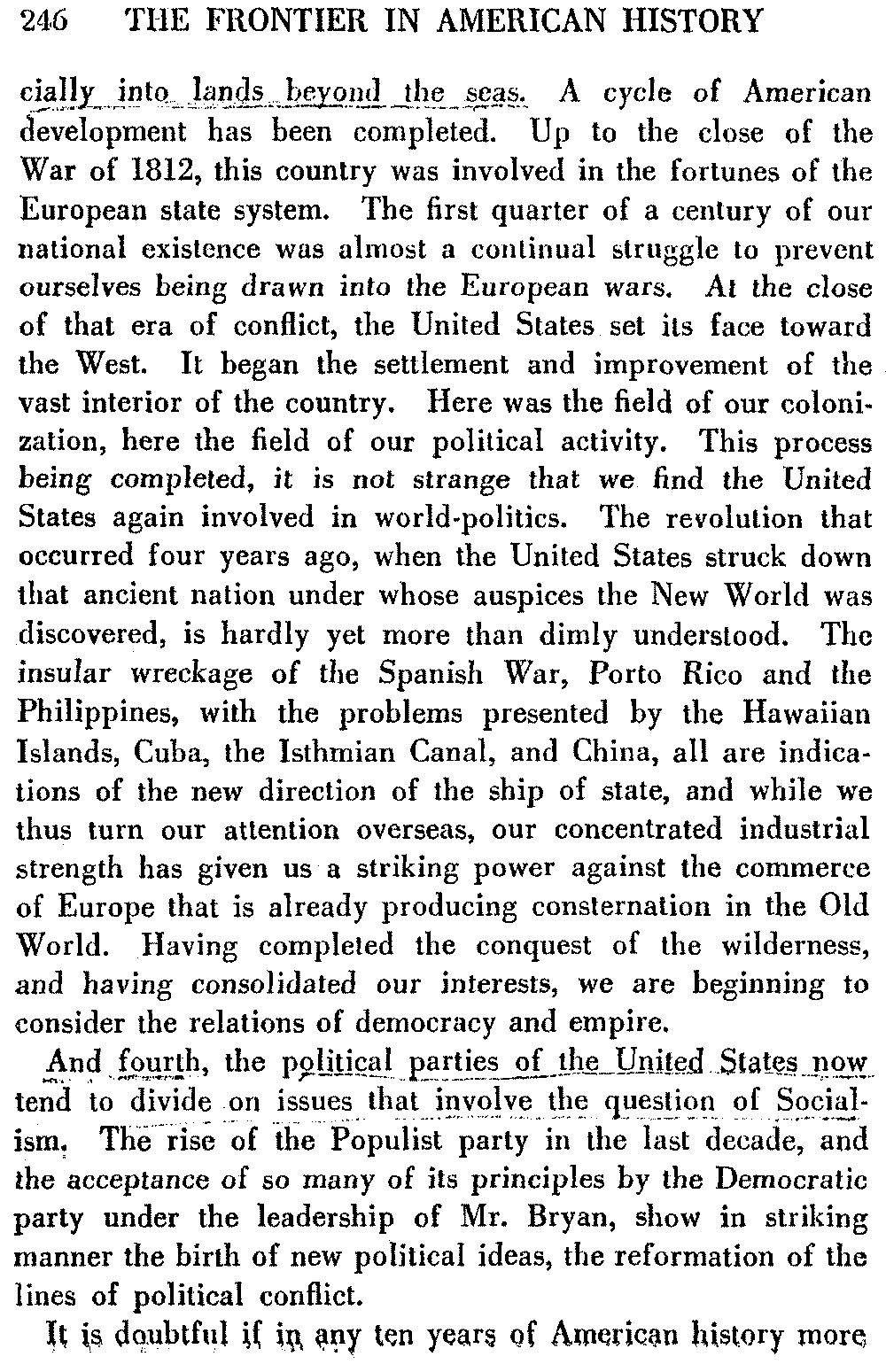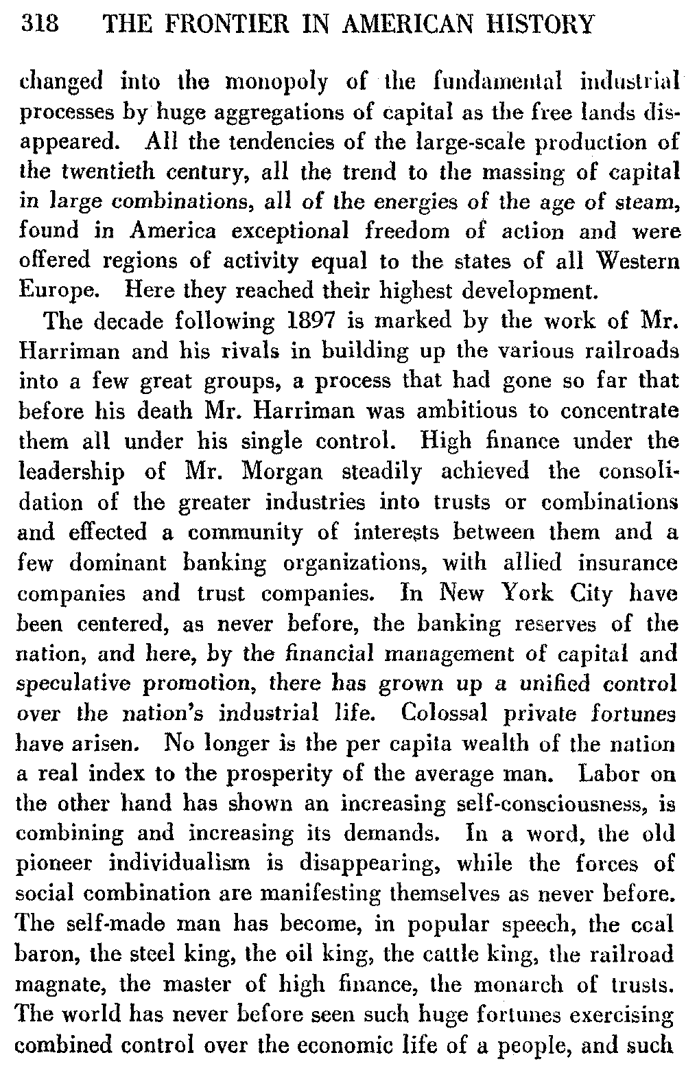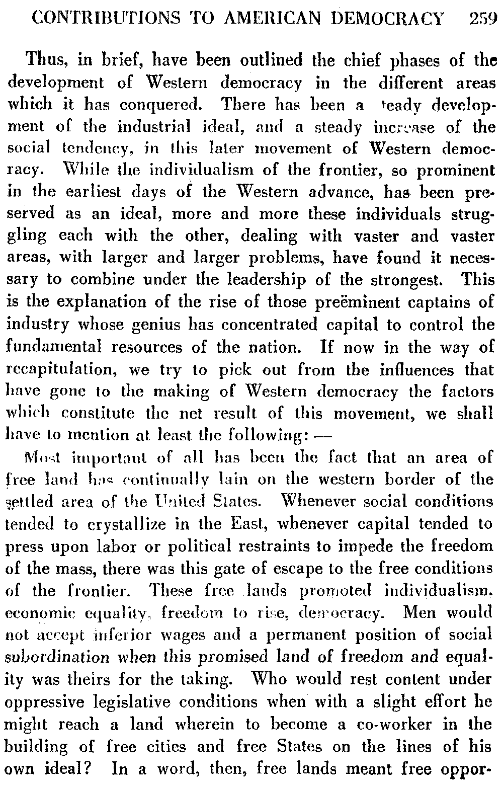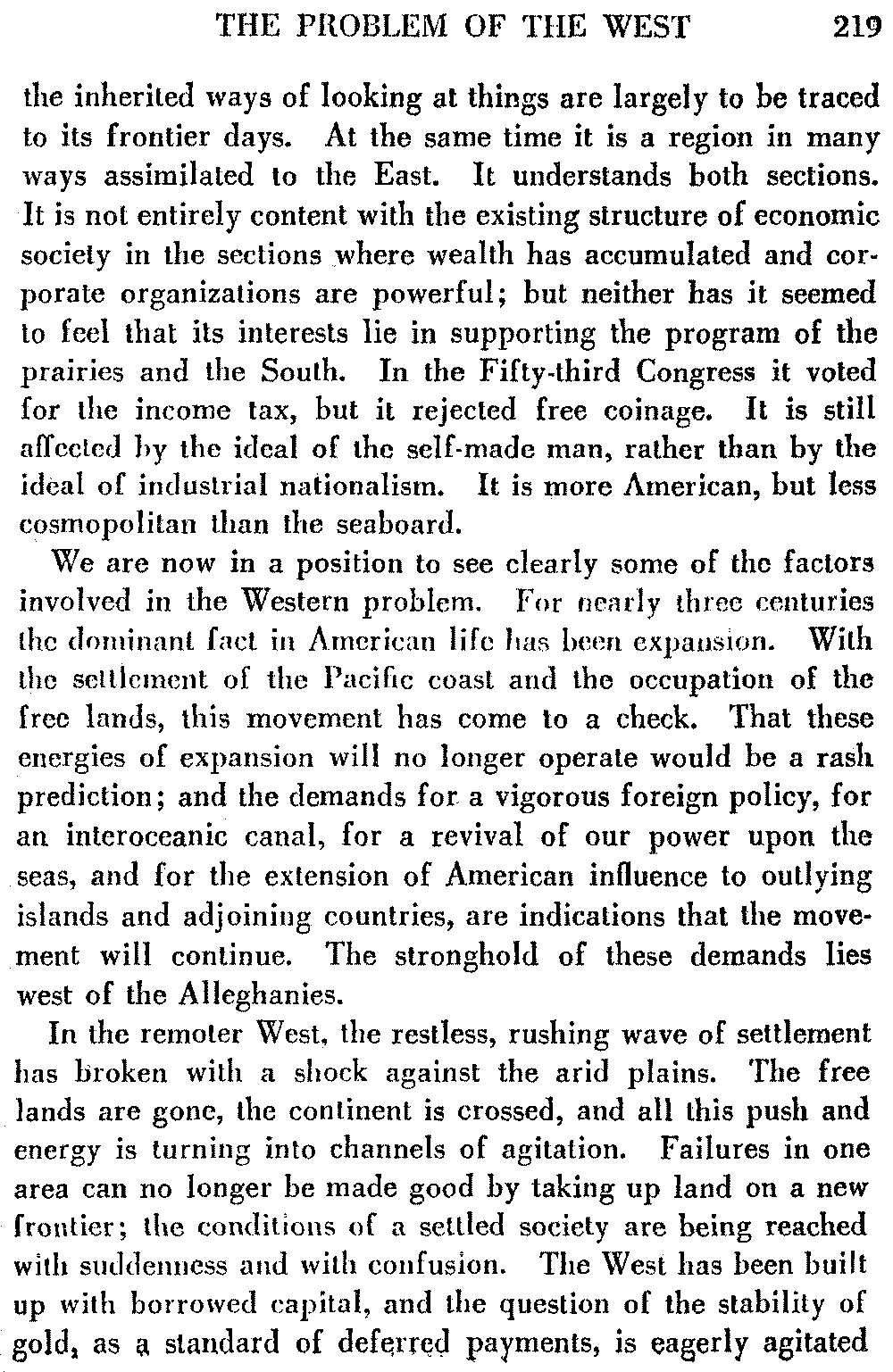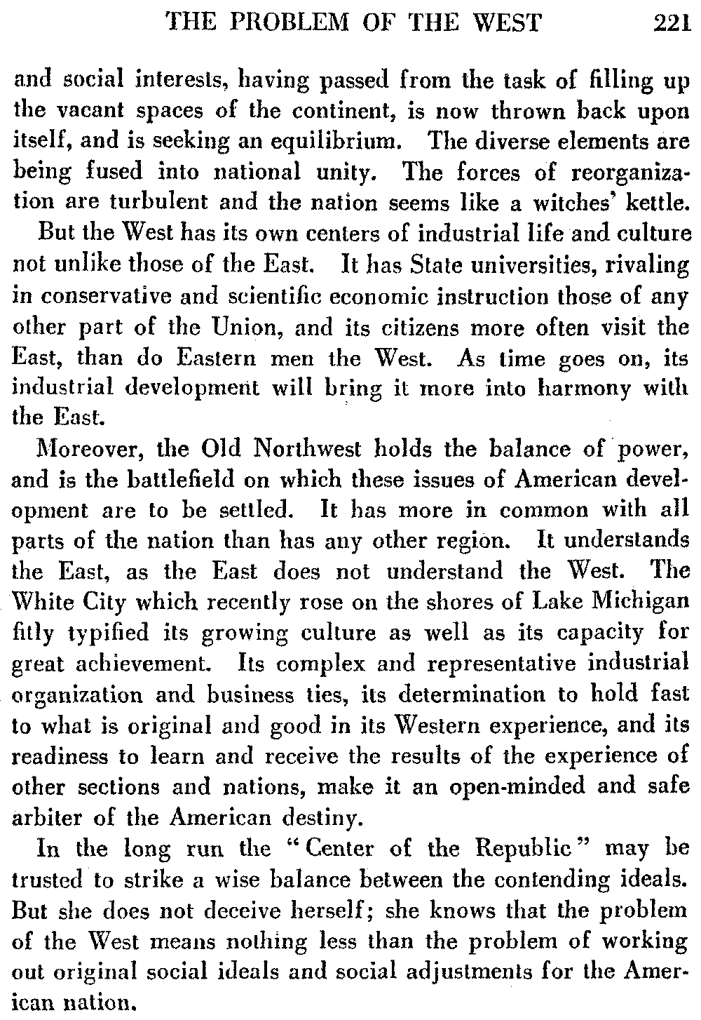 The future alone can disclose how far these interpretations are correct for the age of colonization which came gradually to an end with the disappearance of the frontier and free land. It alone can reveal how much of the courageous, creative American spirit, and how large a part of the historic American ideals are to be carried over into that new age which is replacing the era of free lands and of measurable isolation by consolidated and complex industrial development and by increasing [vi]resemblances and connections between the New World and the Old.