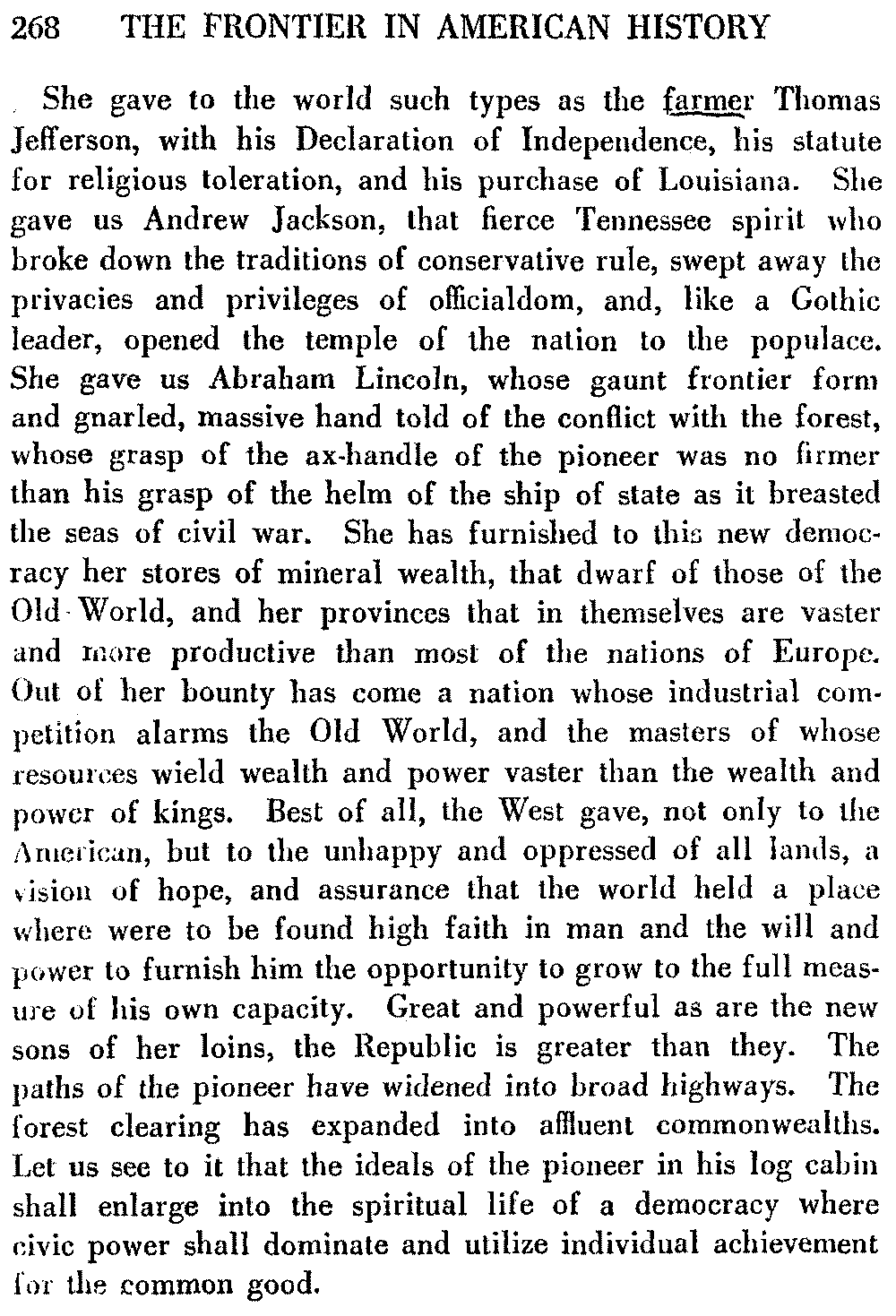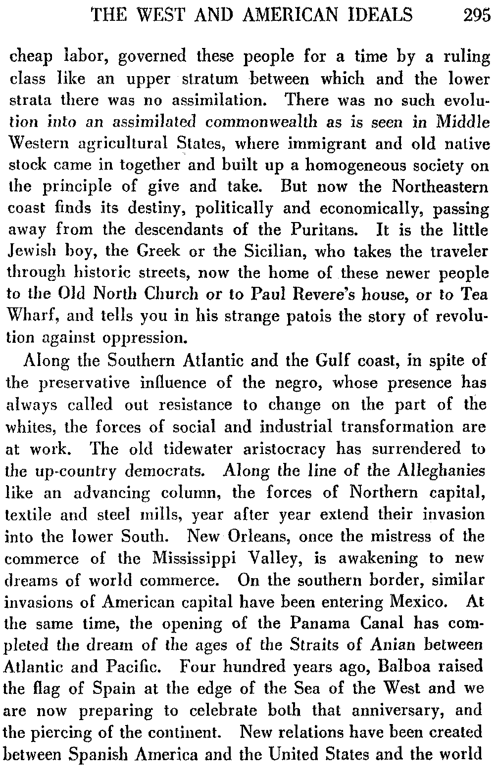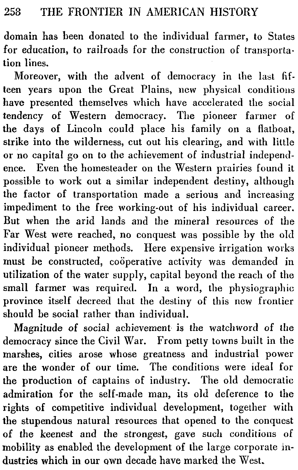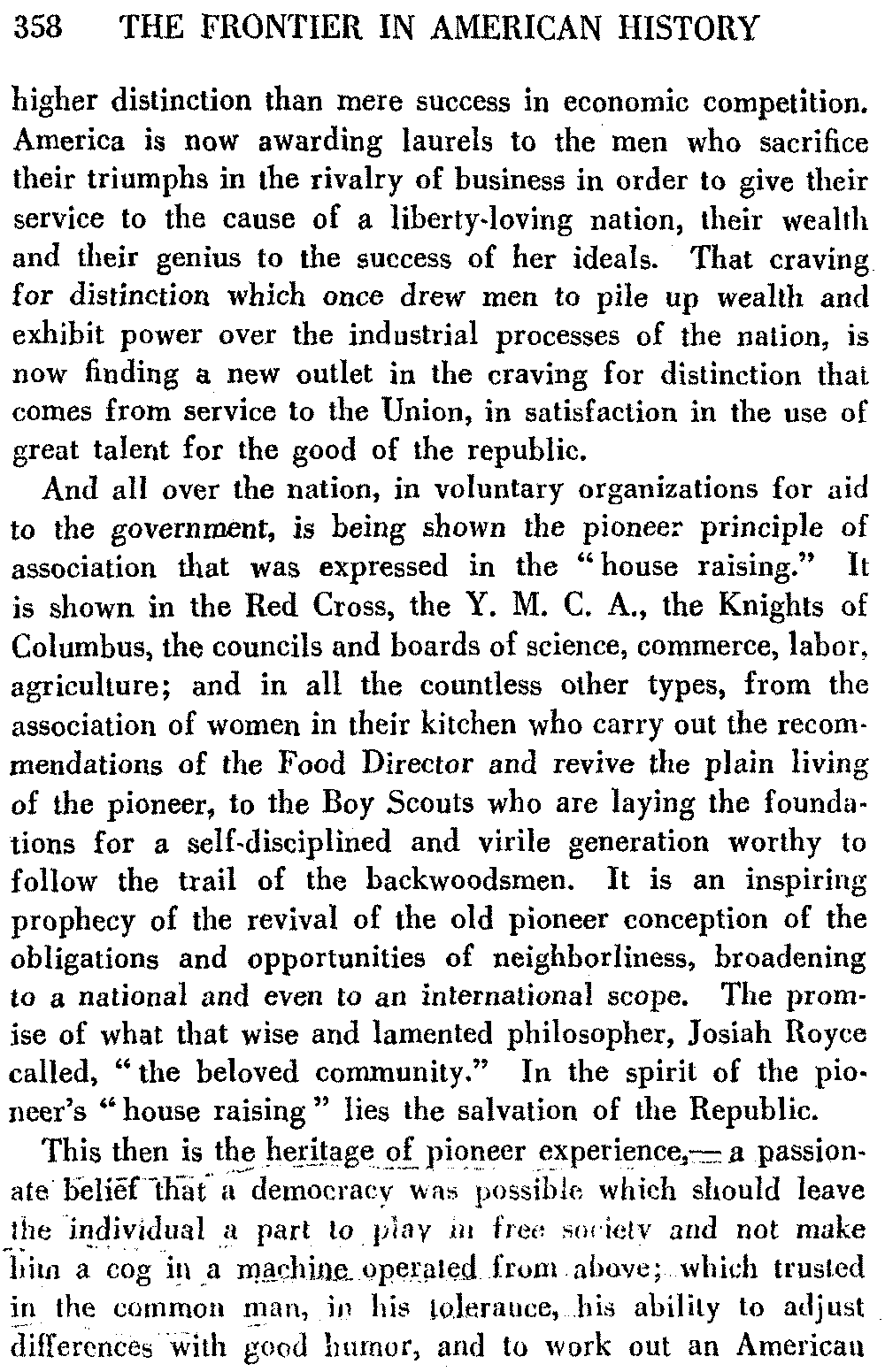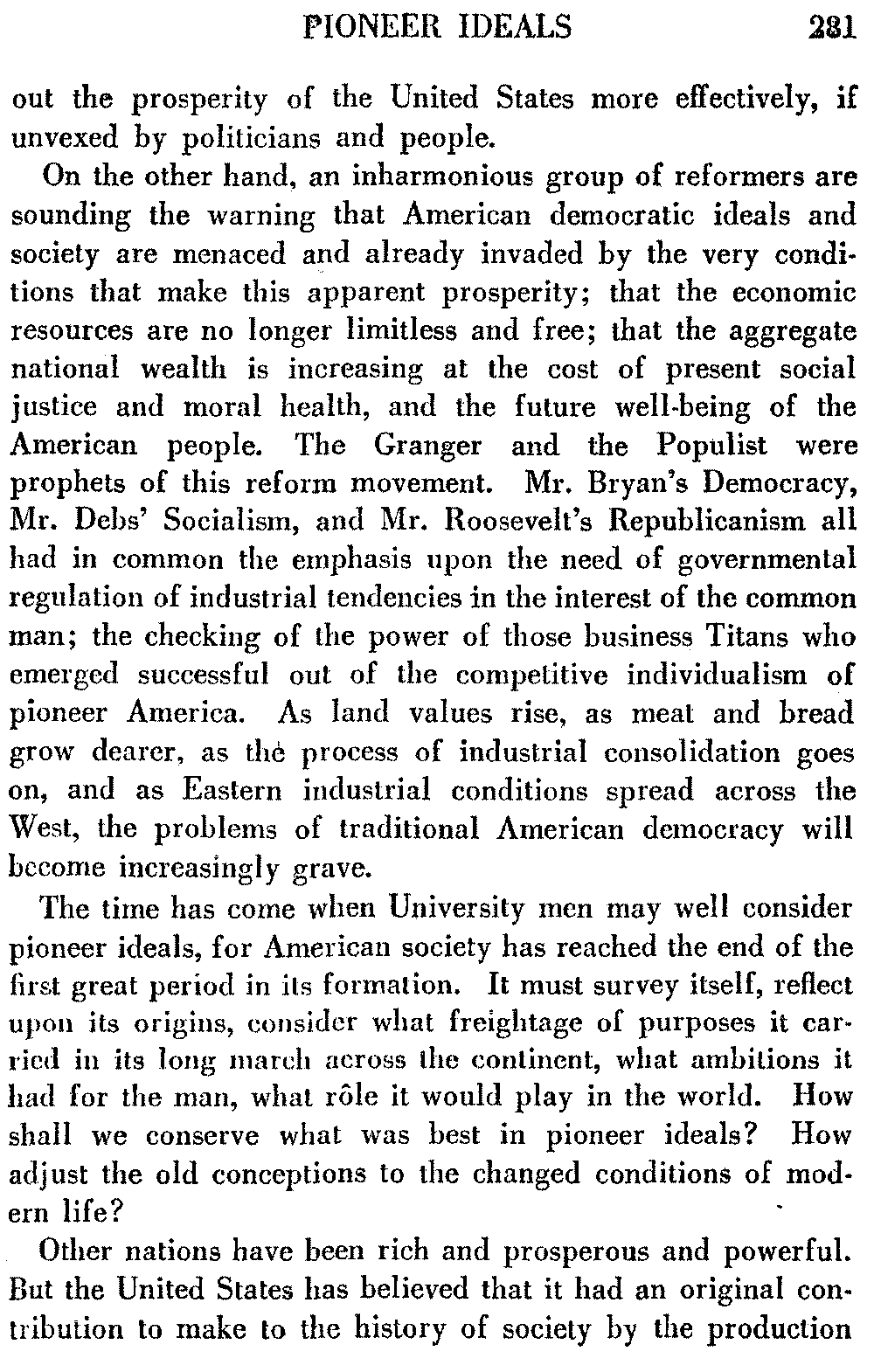 The future alone can disclose how far these interpretations are correct for the age of colonization which came gradually to an end with the disappearance of the frontier and free land. It alone can reveal how much of the courageous, creative American spirit, and how large a part of the historic American ideals are to be carried over into that new age which is replacing the era of free lands and of measurable isolation by consolidated and complex industrial development and by increasing [vi]resemblances and connections between the New World and the Old.