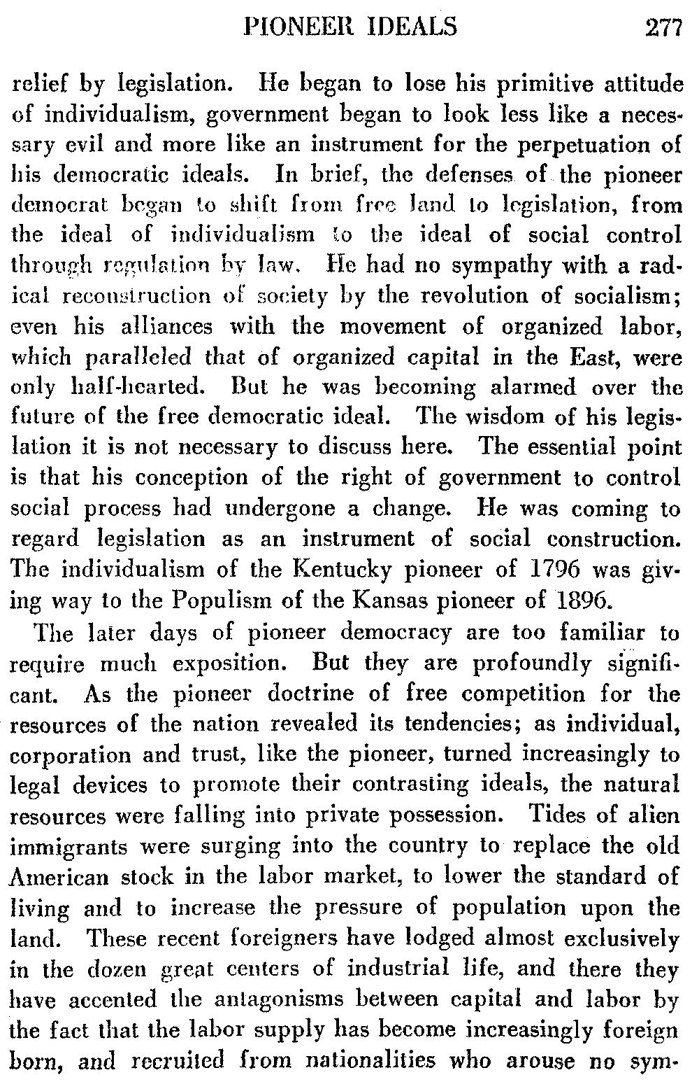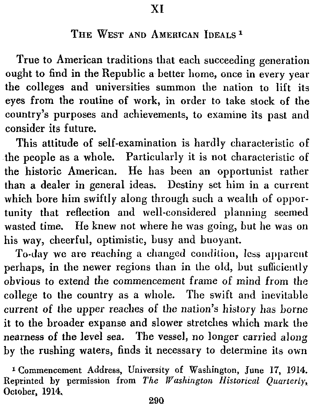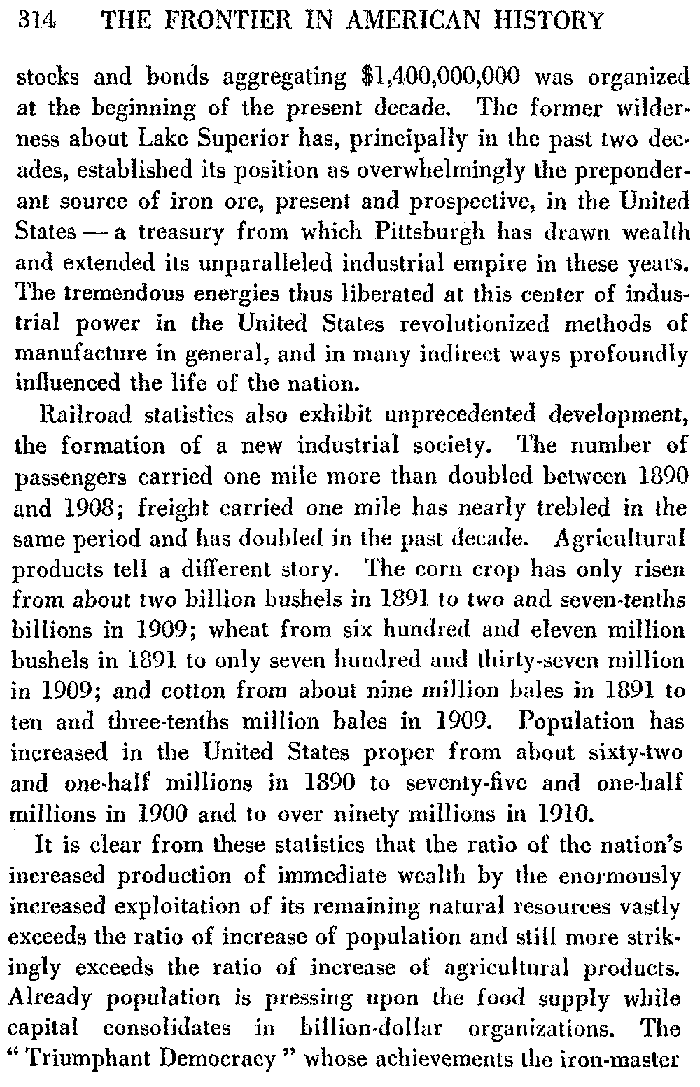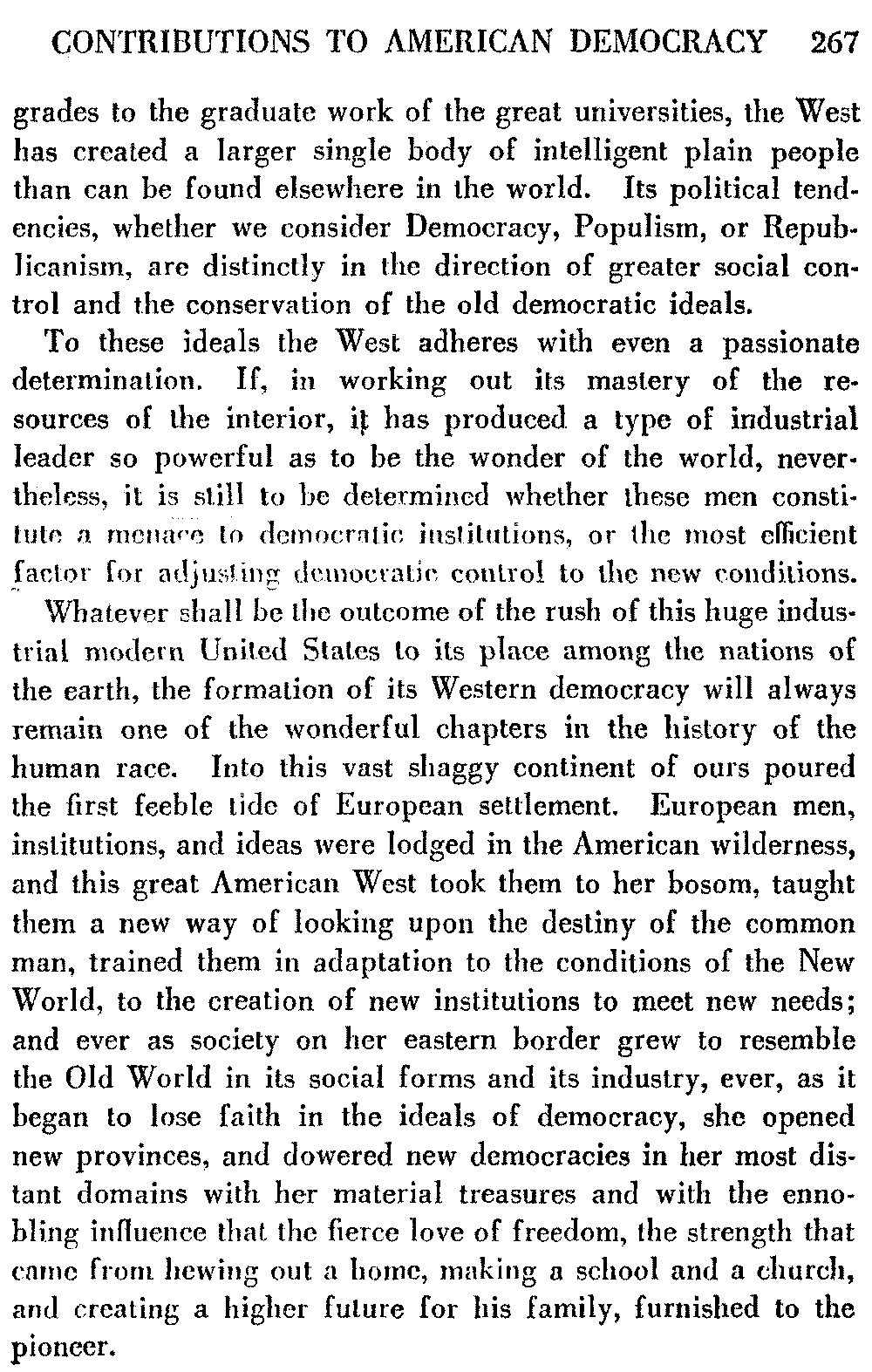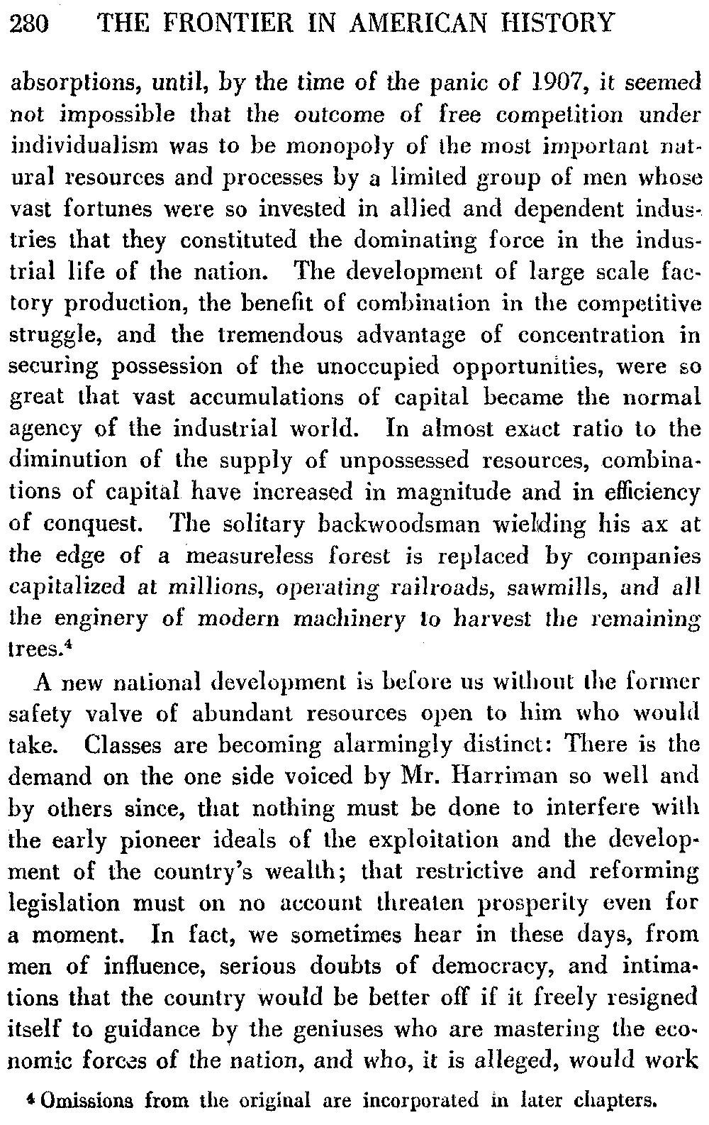 The future alone can disclose how far these interpretations are correct for the age of colonization which came gradually to an end with the disappearance of the frontier and free land. It alone can reveal how much of the courageous, creative American spirit, and how large a part of the historic American ideals are to be carried over into that new age which is replacing the era of free lands and of measurable isolation by consolidated and complex industrial development and by increasing [vi]resemblances and connections between the New World and the Old.