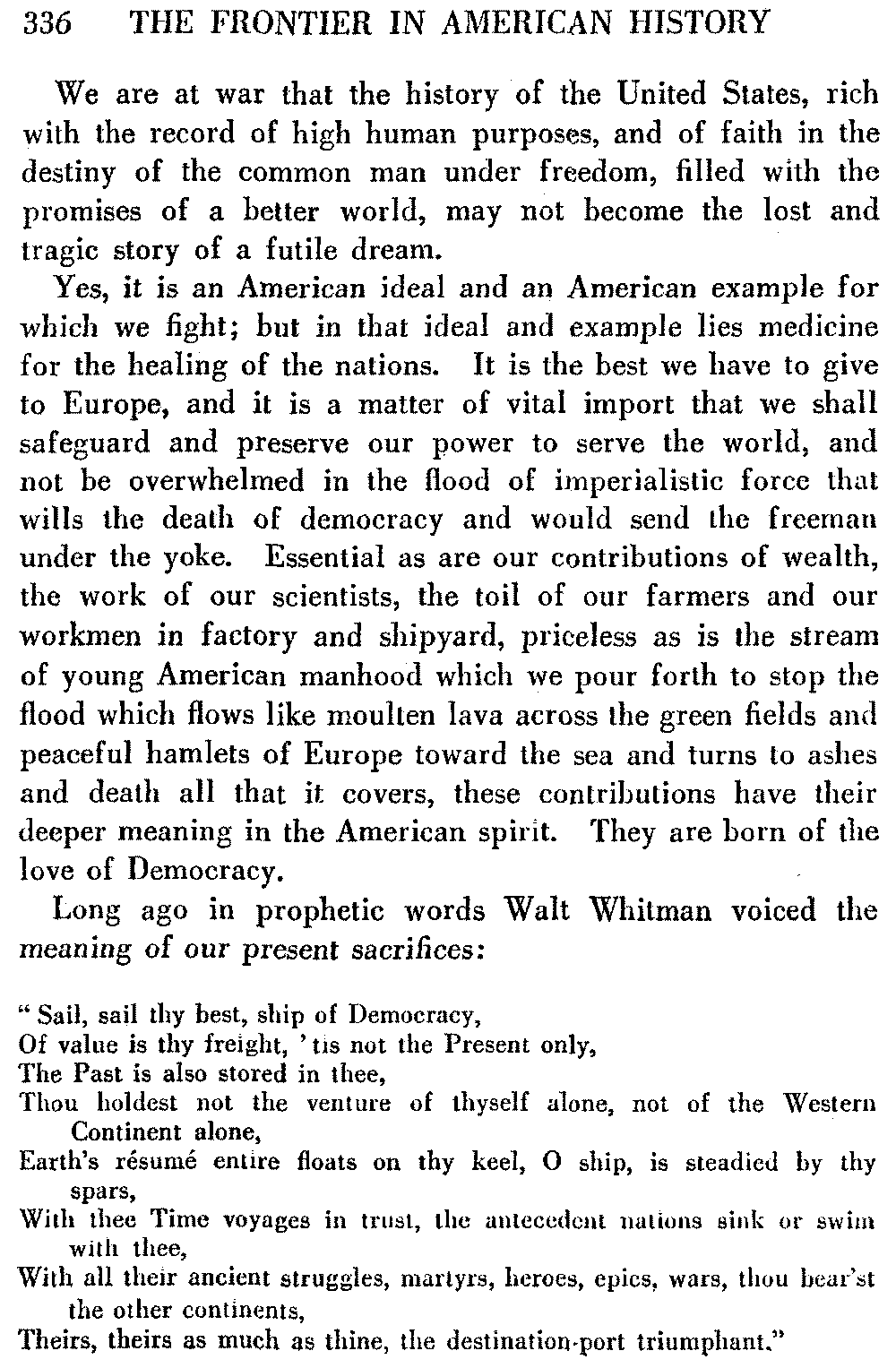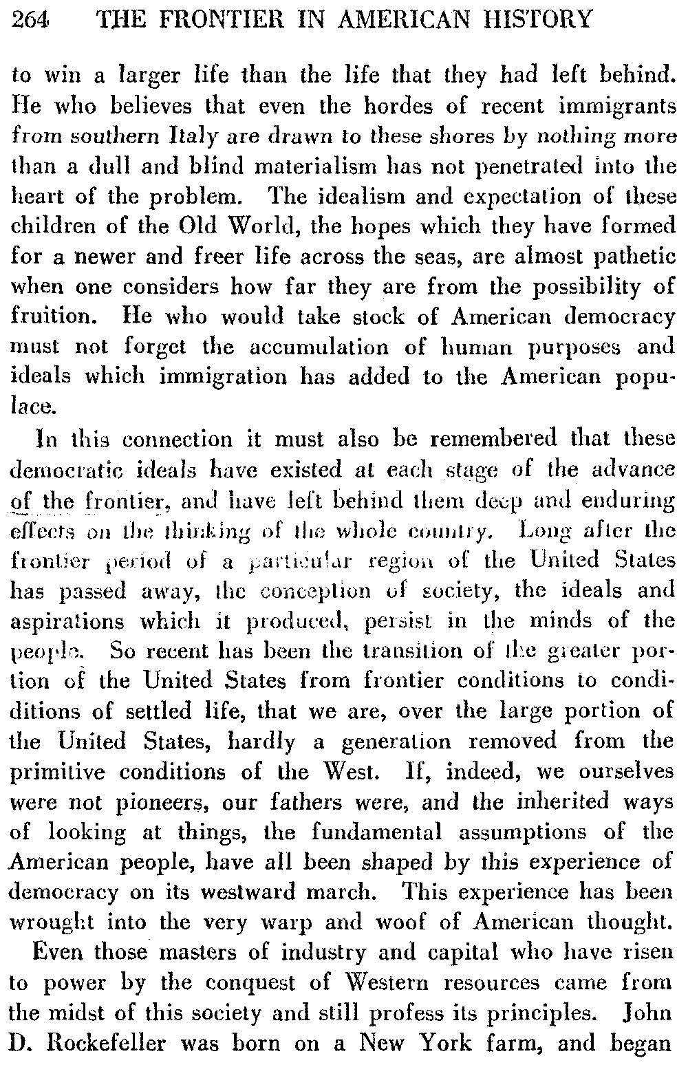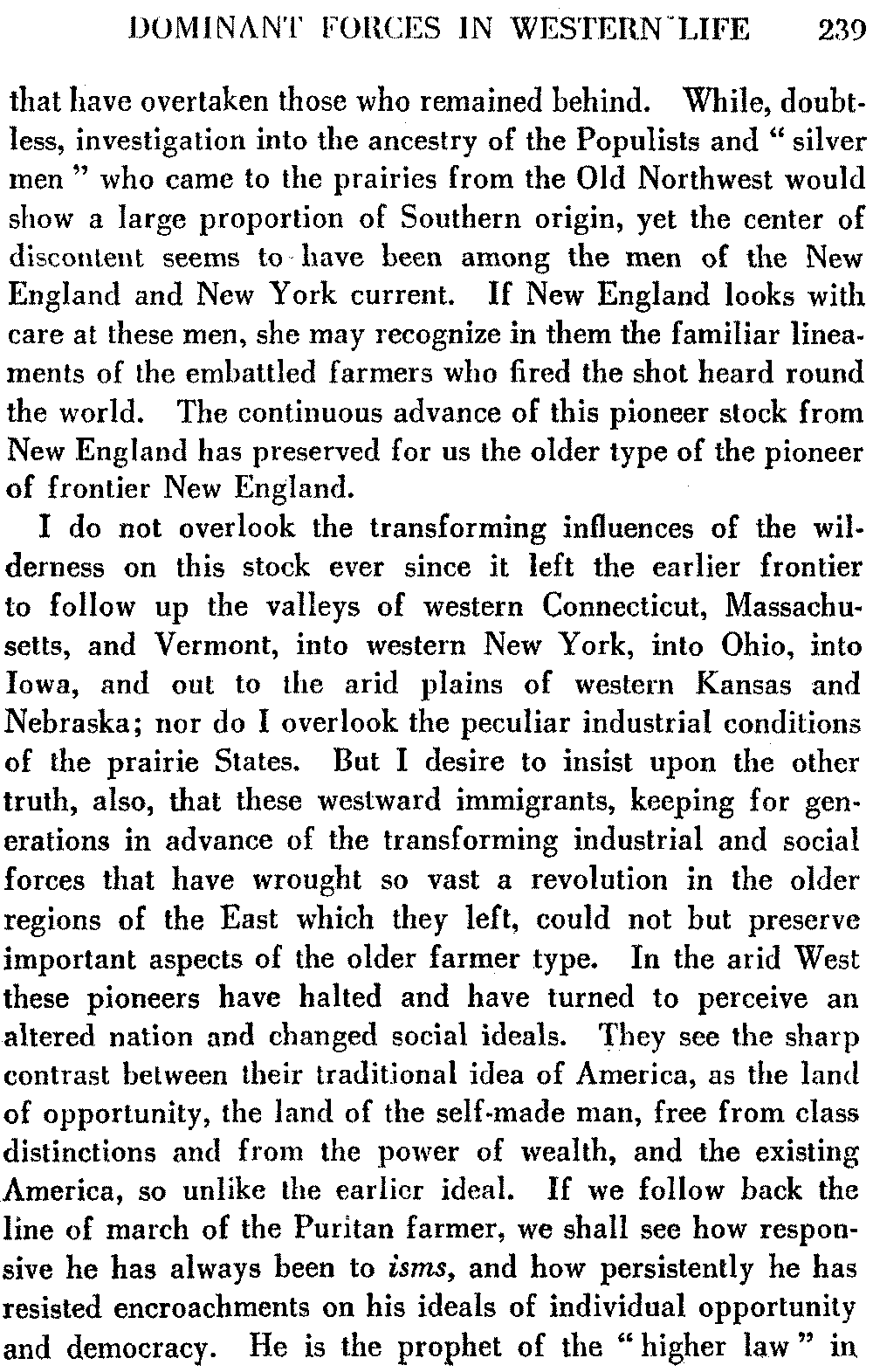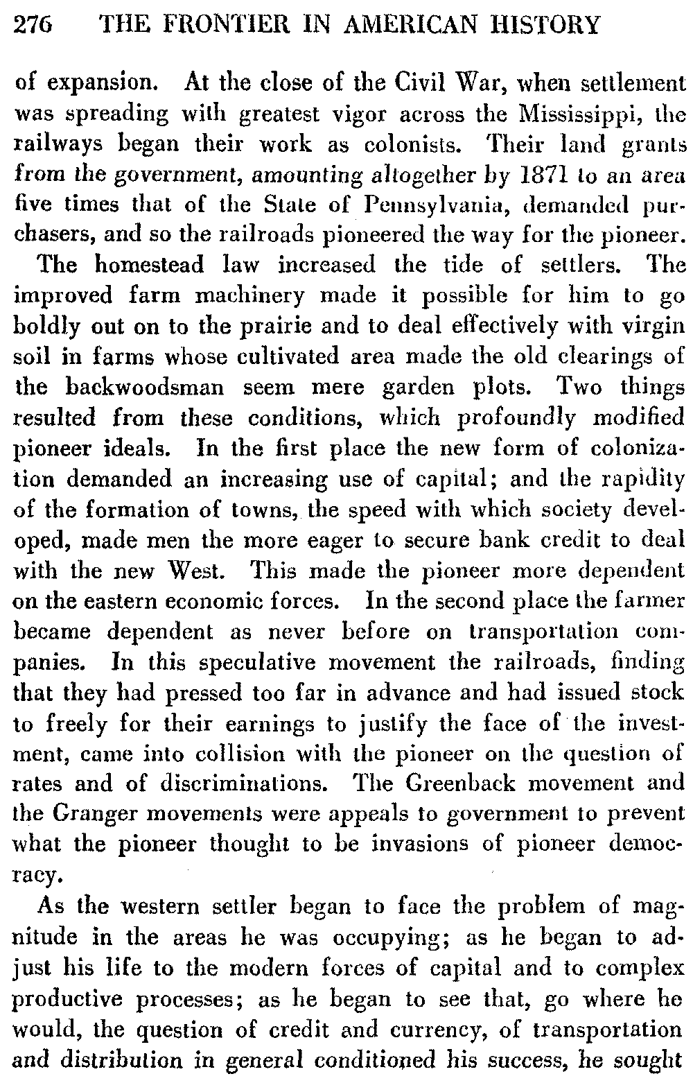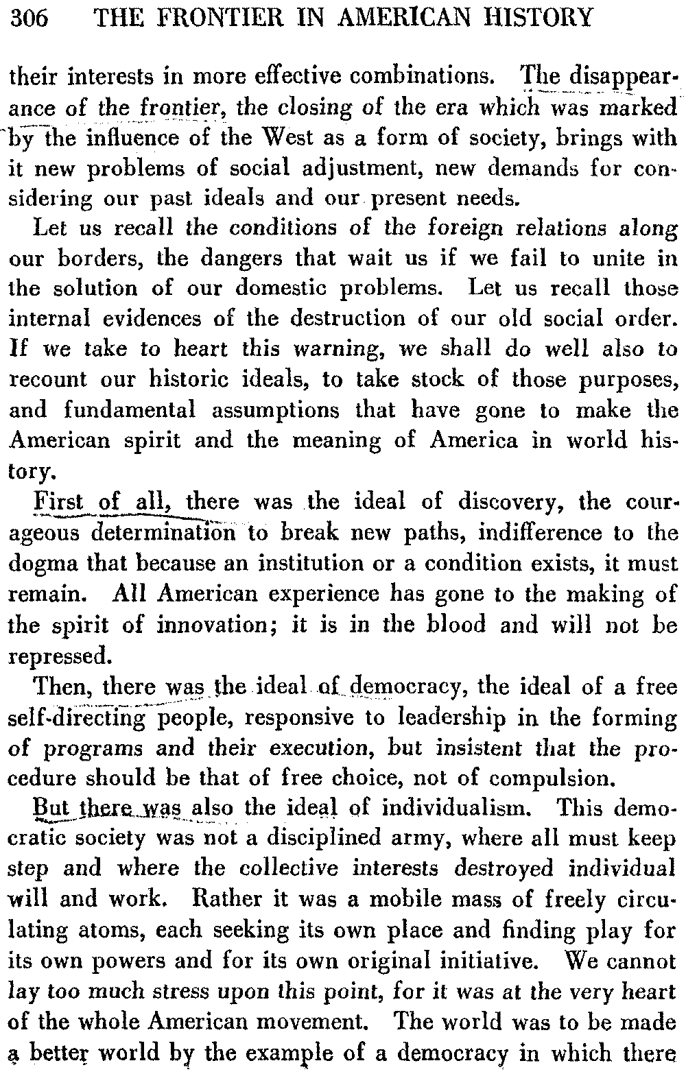 The future alone can disclose how far these interpretations are correct for the age of colonization which came gradually to an end with the disappearance of the frontier and free land. It alone can reveal how much of the courageous, creative American spirit, and how large a part of the historic American ideals are to be carried over into that new age which is replacing the era of free lands and of measurable isolation by consolidated and complex industrial development and by increasing [vi]resemblances and connections between the New World and the Old.