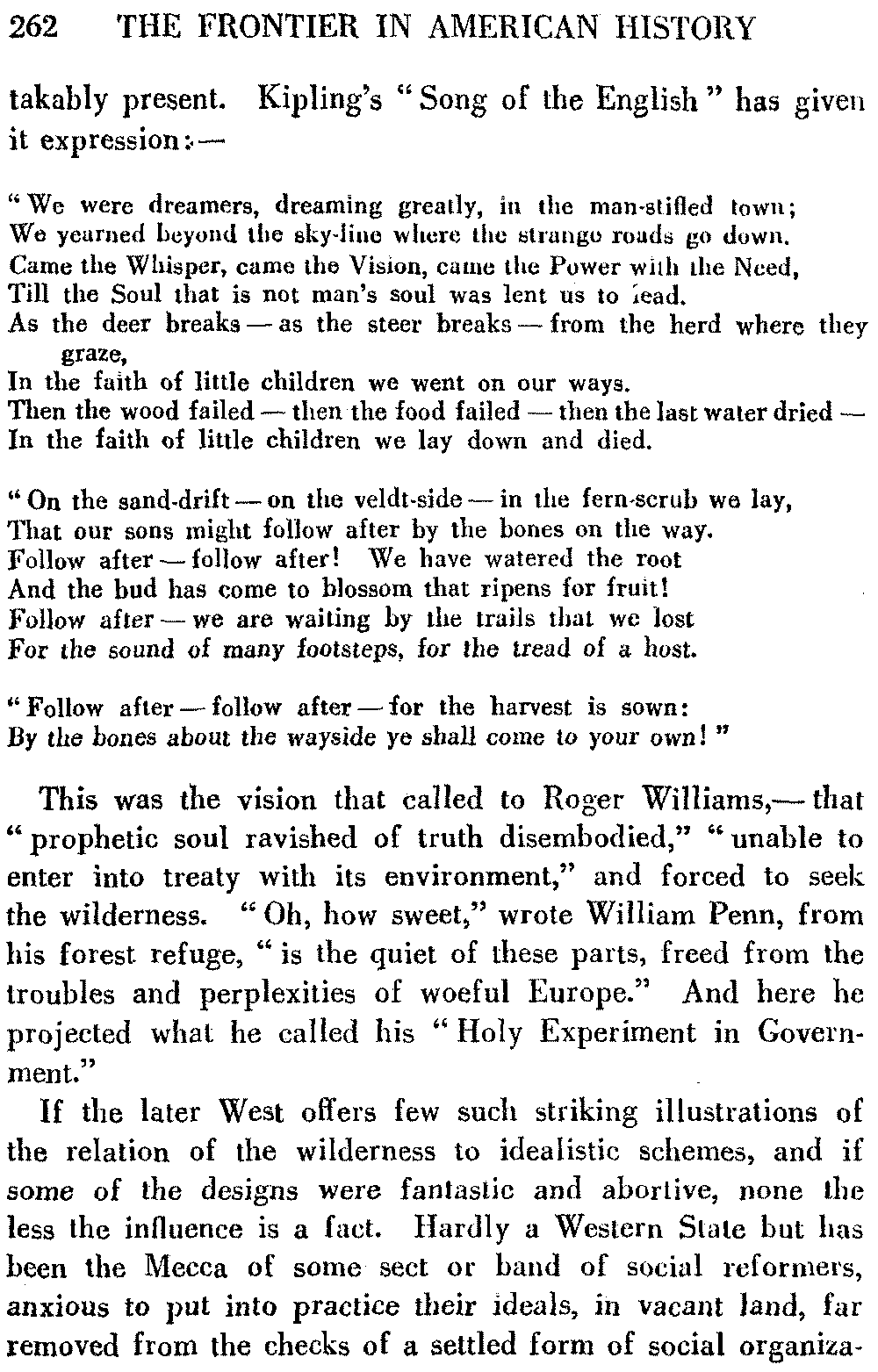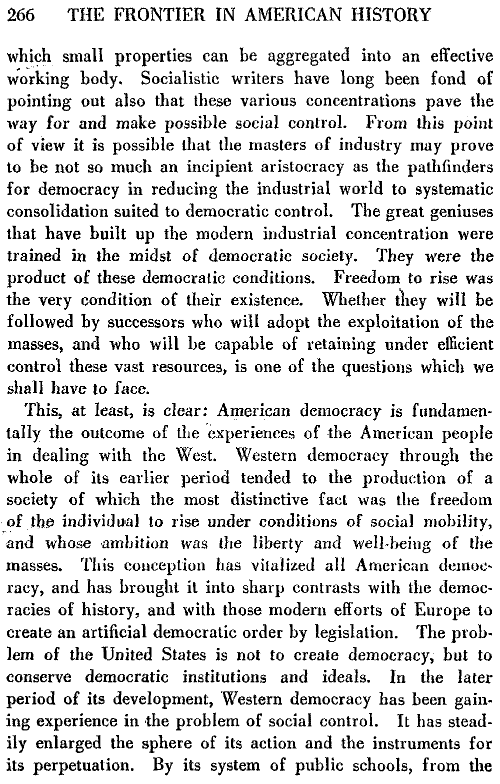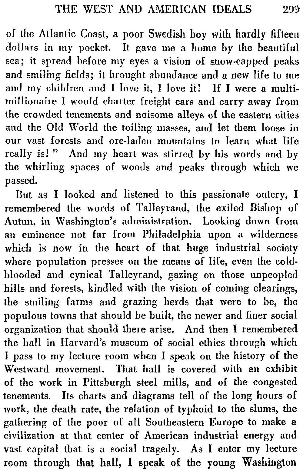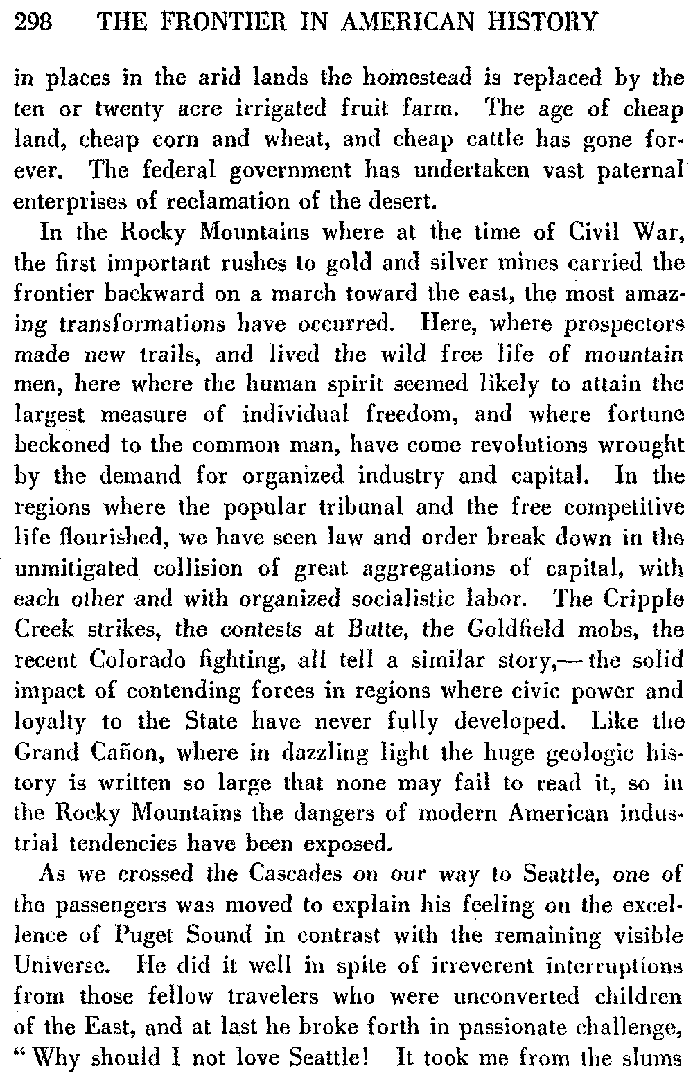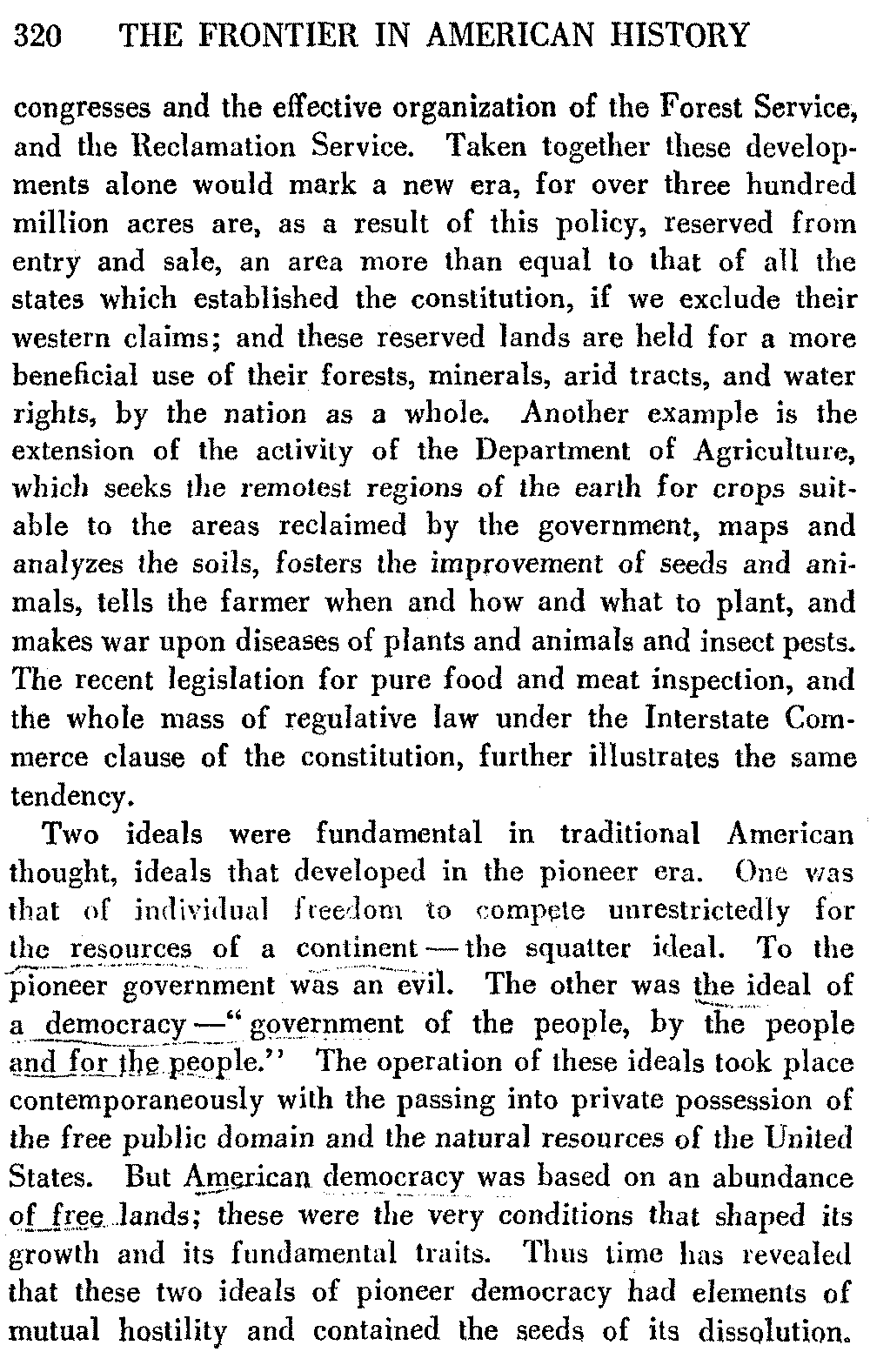 The future alone can disclose how far these interpretations are correct for the age of colonization which came gradually to an end with the disappearance of the frontier and free land. It alone can reveal how much of the courageous, creative American spirit, and how large a part of the historic American ideals are to be carried over into that new age which is replacing the era of free lands and of measurable isolation by consolidated and complex industrial development and by increasing [vi]resemblances and connections between the New World and the Old.
