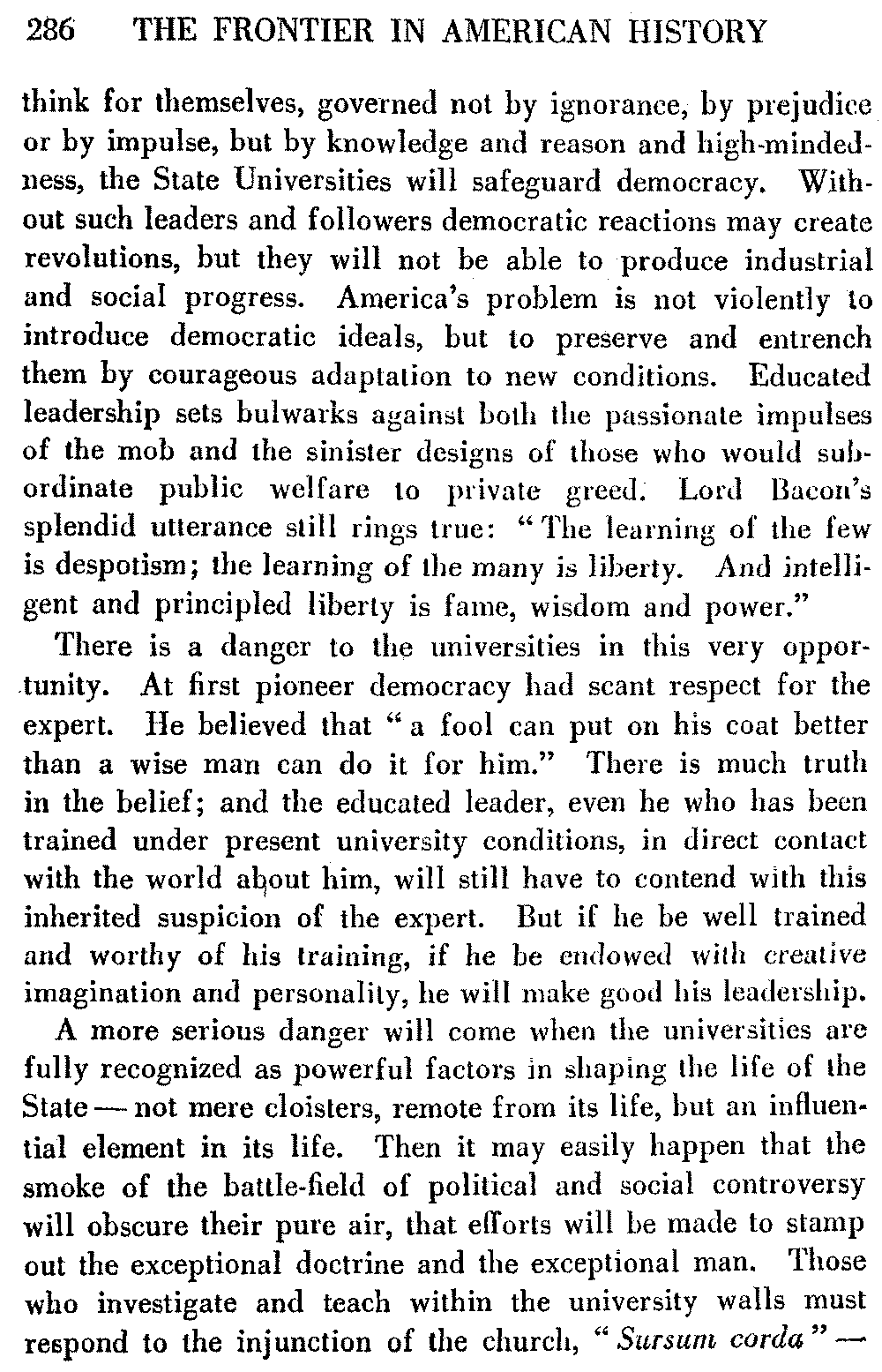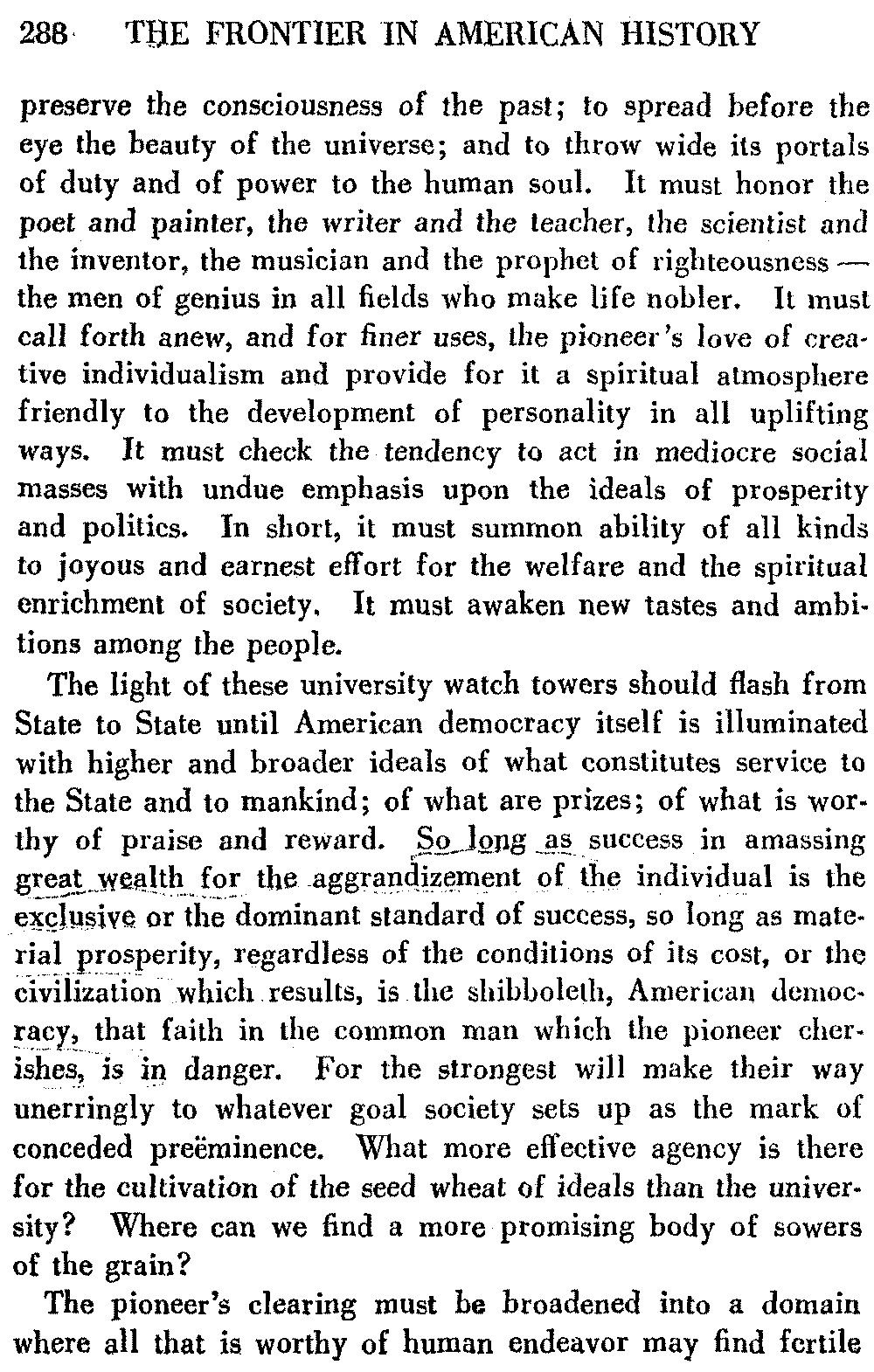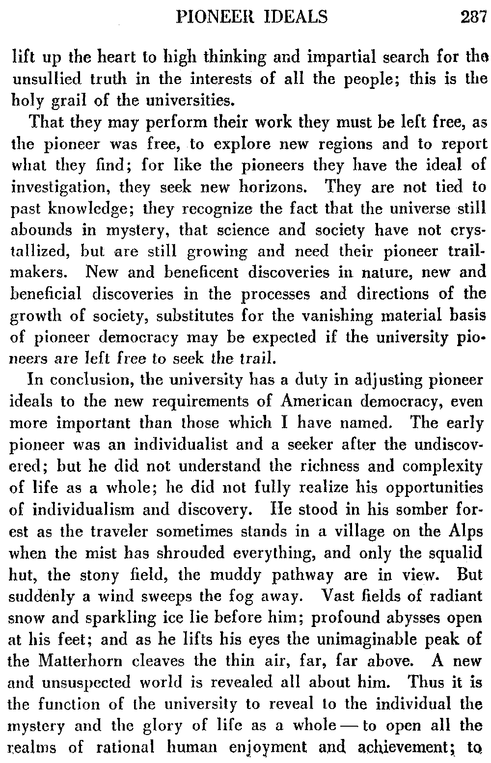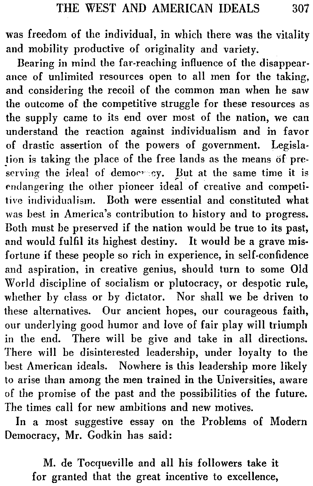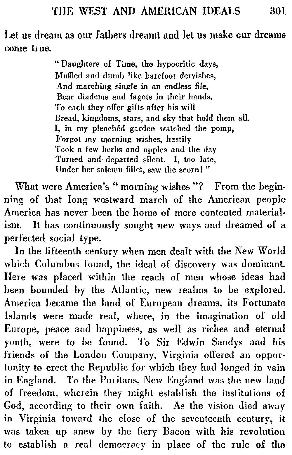 The future alone can disclose how far these interpretations are correct for the age of colonization which came gradually to an end with the disappearance of the frontier and free land. It alone can reveal how much of the courageous, creative American spirit, and how large a part of the historic American ideals are to be carried over into that new age which is replacing the era of free lands and of measurable isolation by consolidated and complex industrial development and by increasing [vi]resemblances and connections between the New World and the Old.