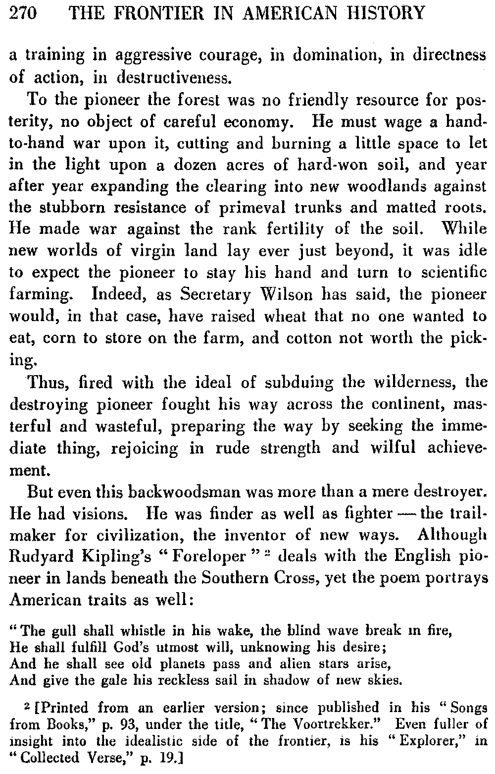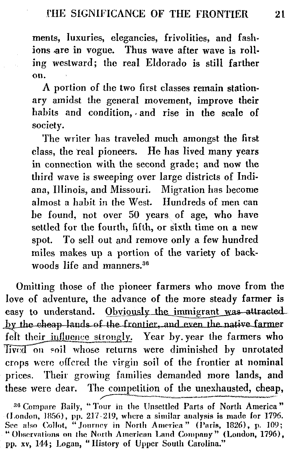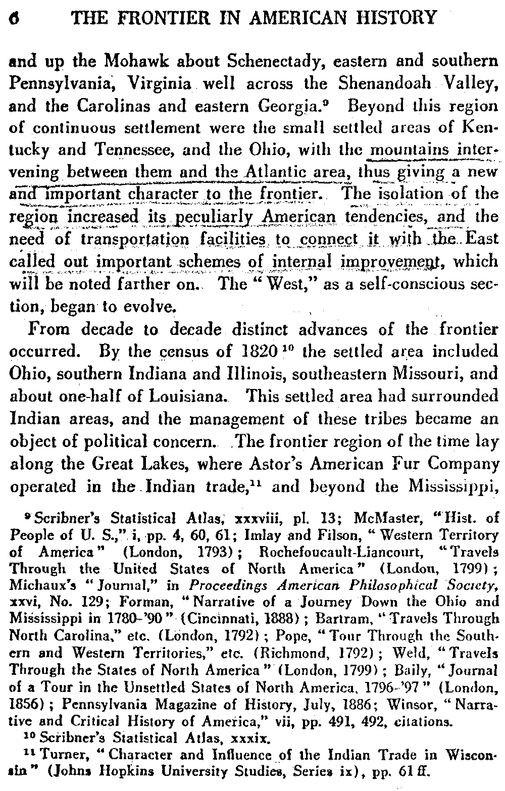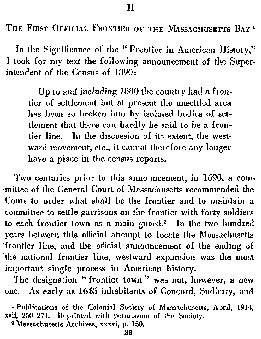 The American frontier is sharply distinguished from the European frontier—a fortified boundary line running through dense populations. The most significant thing about the American frontier is, that it lies at the hither edge of free land. In the census reports it is treated as the margin of that settlement which has a density of two or more to the square mile. The term is an elastic one, and for our purposes does not need sharp definition. We shall consider the whole frontier belt, including the Indian country and the outer margin of the "settled area" of the census reports. This paper will make no attempt to treat the subject exhaustively; its aim is simply to call attention to the frontier as a fertile field for investigation, and to suggest some of the problems which arise in connection with it.