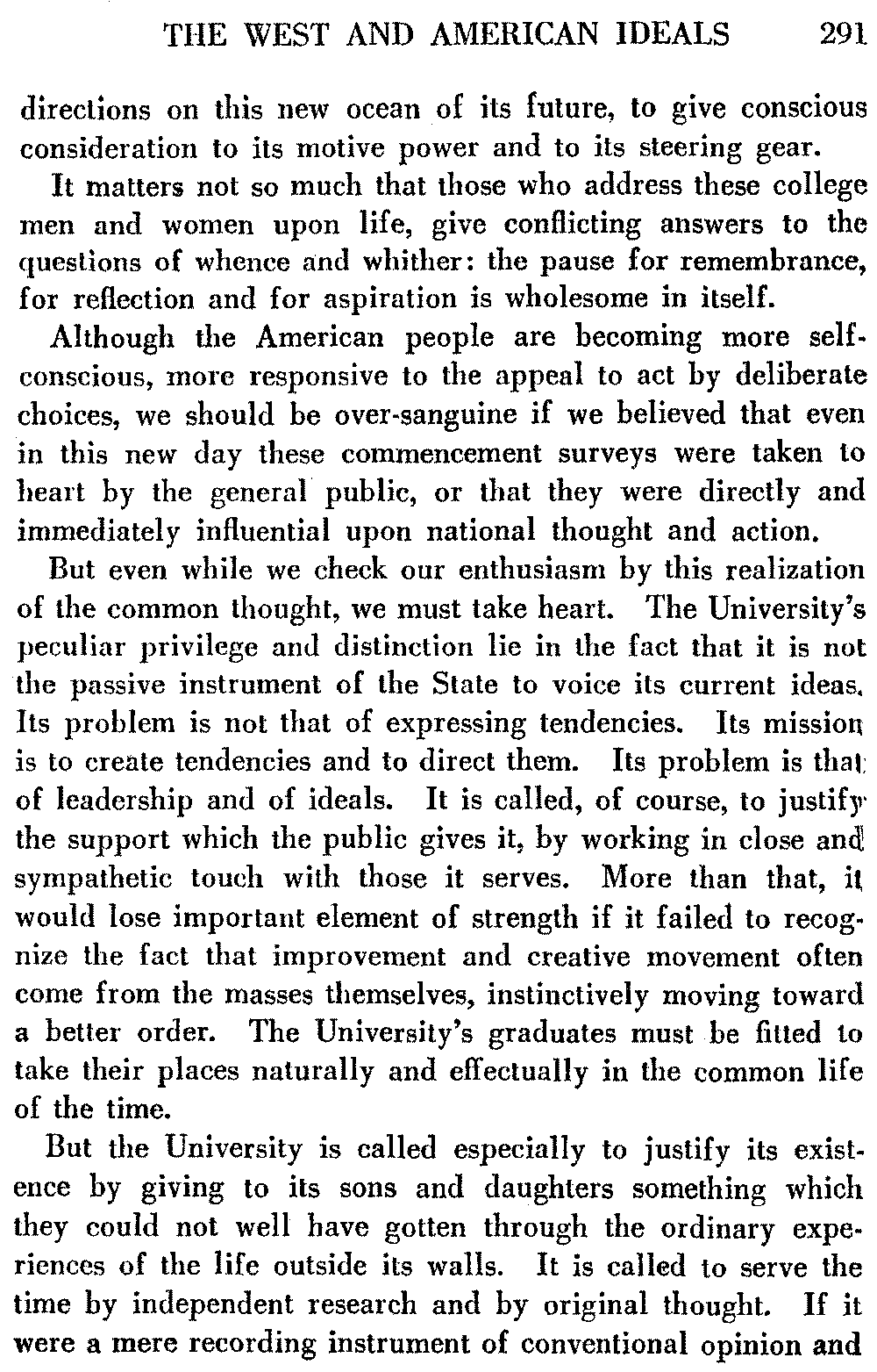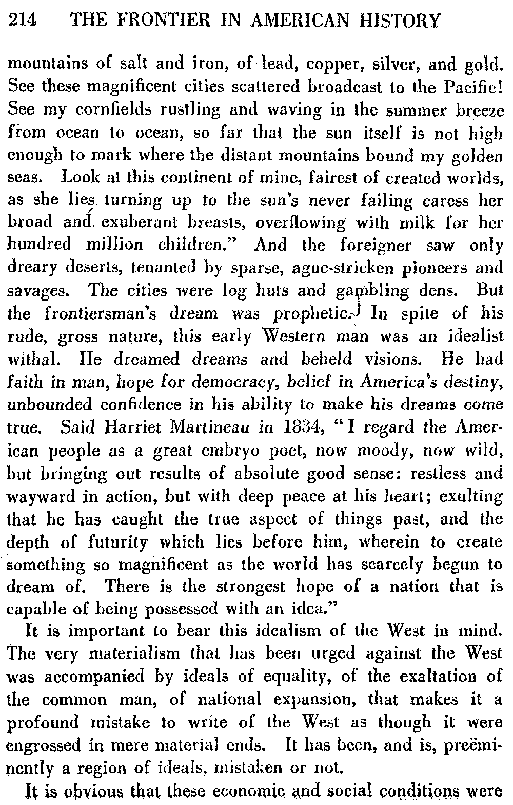 But the larger part of what has been distinctive and valuable in America's contribution to the history of the human spirit has been due to this nation's peculiar experience in extending its type of frontier into new regions; and in creating peaceful societies with new ideals in the successive vast and differing geographic provinces which together make up the United States. Directly or indirectly these experiences shaped the life of the Eastern as well as the Western States, and even reacted upon the Old World and influenced the direction of its thought and its progress. This experience has been fundamental in the economic, political and social characteristics of the American people and in their conceptions of their destiny.