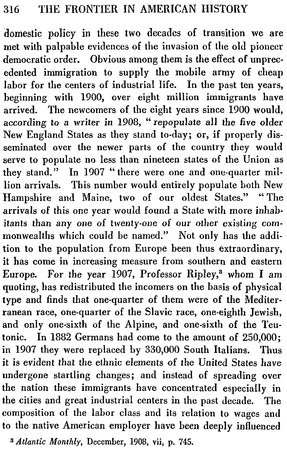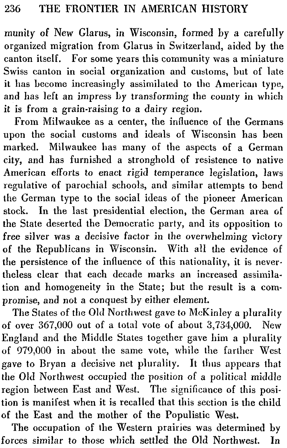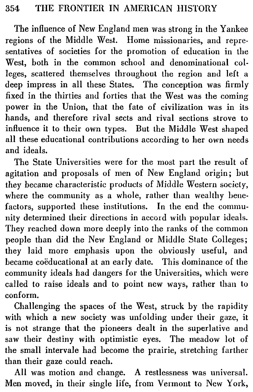 Having now roughly outlined the various kinds of frontiers, and their modes of advance, chiefly from the point of view of the frontier itself, we may next inquire what were the influences on the East and on the Old World. A rapid enumeration of some of the more noteworthy effects is all that I have time for.