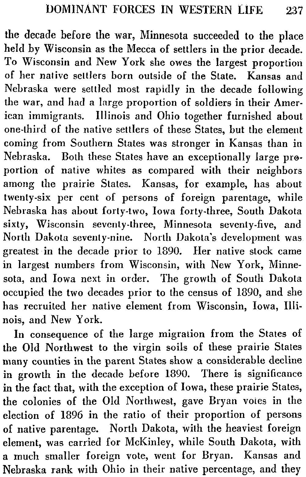 Omitting those of the pioneer farmers who move from the love of adventure, the advance of the more steady farmer is easy to understand. Obviously the immigrant was attracted by the cheap lands of the frontier, and even the native farmer felt their influence strongly. Year by year the farmers who lived on soil whose returns were diminished by unrotated crops were offered the virgin soil of the frontier at nominal prices. Their growing families demanded more lands, and these were dear. The competition of the unexhausted, cheap, [22]and easily tilled prairie lands compelled the farmer either to go west and continue the exhaustion of the soil on a new frontier, or to adopt intensive culture. Thus the census of 1890 shows, in the Northwest, many counties in which there is an absolute or a relative decrease of population. These States have been sending farmers to advance the frontier on the plains, and have themselves begun to turn to intensive farming and to manufacture. A decade before this, Ohio had shown the same transition stage. Thus the demand for land and the love of wilderness freedom drew the frontier ever onward.