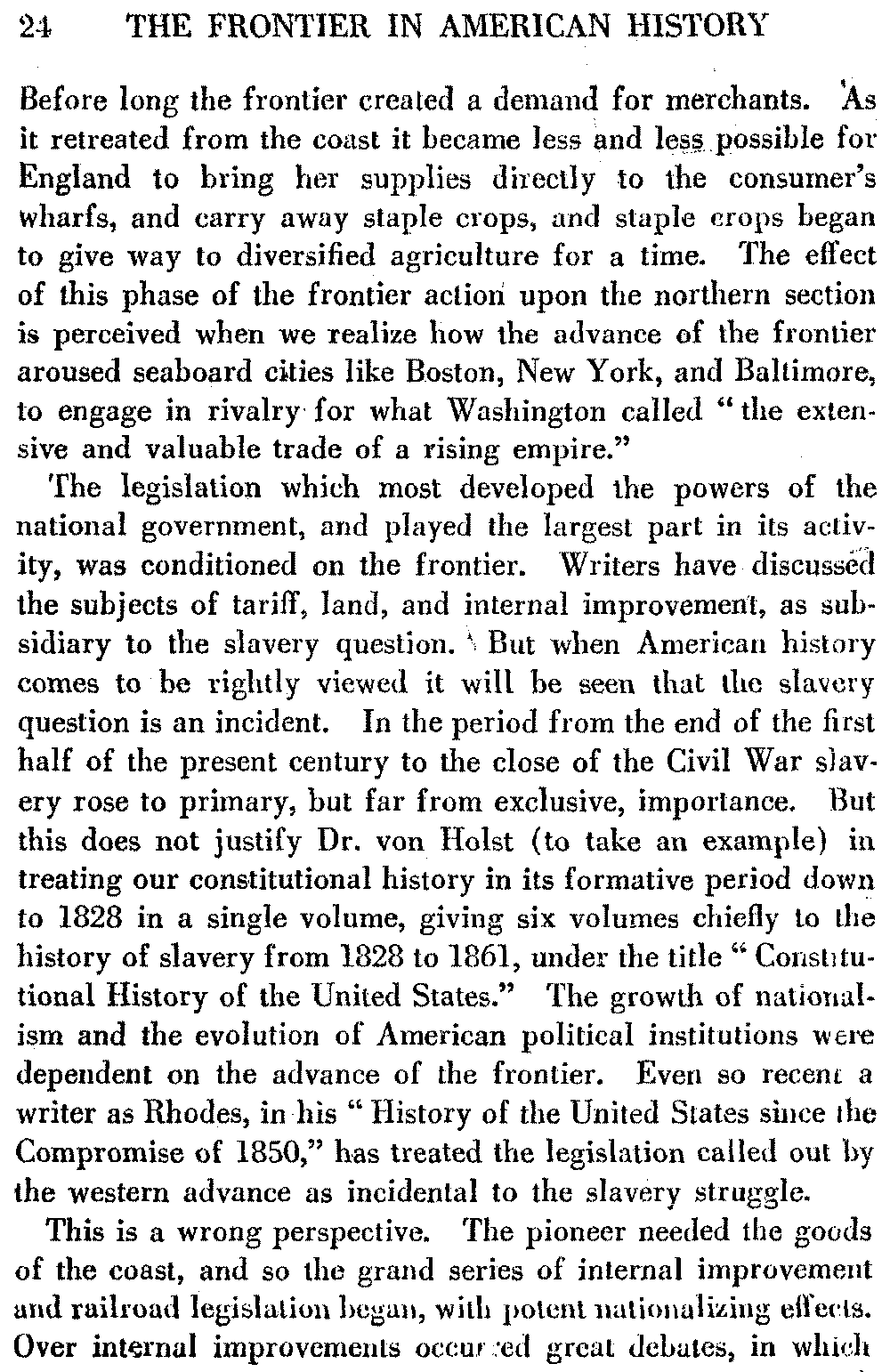 The legislation which most developed the powers of the national government, and played the largest part in its activity, was conditioned on the frontier. Writers have discussed the subjects of tariff, land, and internal improvement, as subsidiary to the slavery question. But when American history comes to be rightly viewed it will be seen that the slavery question is an incident. In the period from the end of the first half of the present century to the close of the Civil War slavery rose to primary, but far from exclusive, importance. But this does not justify Dr. von Holst (to take an example) in treating our constitutional history in its formative period down to 1828 in a single volume, giving six volumes chiefly to the history of slavery from 1828 to 1861, under the title "Constitutional History of the United States." The growth of nationalism and the evolution of American political institutions were dependent on the advance of the frontier. Even so recent a writer as Rhodes, in his "History of the United States since the Compromise of 1850," has treated the legislation called out by the western advance as incidental to the slavery struggle.