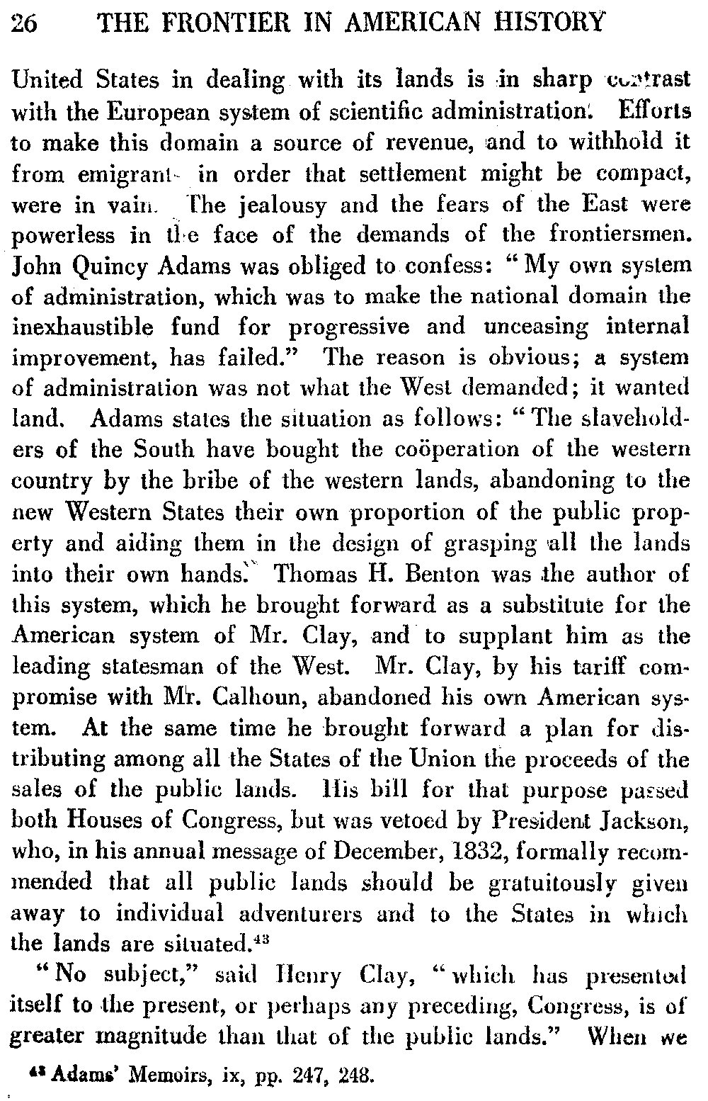 When we consider the public domain from the point of view of the sale and disposal of the public lands we are again brought face to face with the frontier. The policy of the [26]United States in dealing with its lands is in sharp contrast with the European system of scientific administration. Efforts to make this domain a source of revenue, and to withhold it from emigrants in order that settlement might be compact, were in vain. The jealousy and the fears of the East were powerless in the face of the demands of the frontiersmen. John Quincy Adams was obliged to confess: "My own system of administration, which was to make the national domain the inexhaustible fund for progressive and unceasing internal improvement, has failed." The reason is obvious; a system of administration was not what the West demanded; it wanted land. Adams states the situation as follows: "The slaveholders of the South have bought the coöperation of the western country by the bribe of the western lands, abandoning to the new Western States their own proportion of the public property and aiding them in the design of grasping all the lands into their own hands." Thomas H. Benton was the author of this system, which he brought forward as a substitute for the American system of Mr. Clay, and to supplant him as the leading statesman of the West. Mr. Clay, by his tariff compromise with Mr. Calhoun, abandoned his own American system. At the same time he brought forward a plan for distributing among all the States of the Union the proceeds of the sales of the public lands. His bill for that purpose passed both Houses of Congress, but was vetoed by President Jackson, who, in his annual message of December, 1832, formally recommended that all public lands should be gratuitously given away to individual adventurers and to the States in which the lands are situated.[26:1]